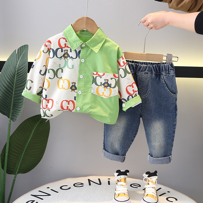 소년 캐주얼 세트 봄 옷 2024 새로운 어린이 서양식 만화 셔츠 긴 소매 봄 가을 패션 옷