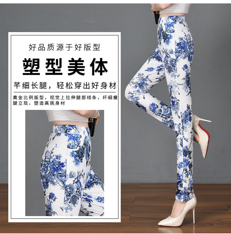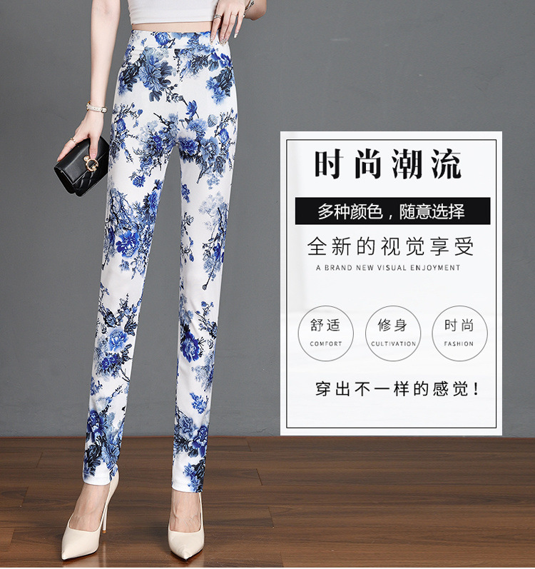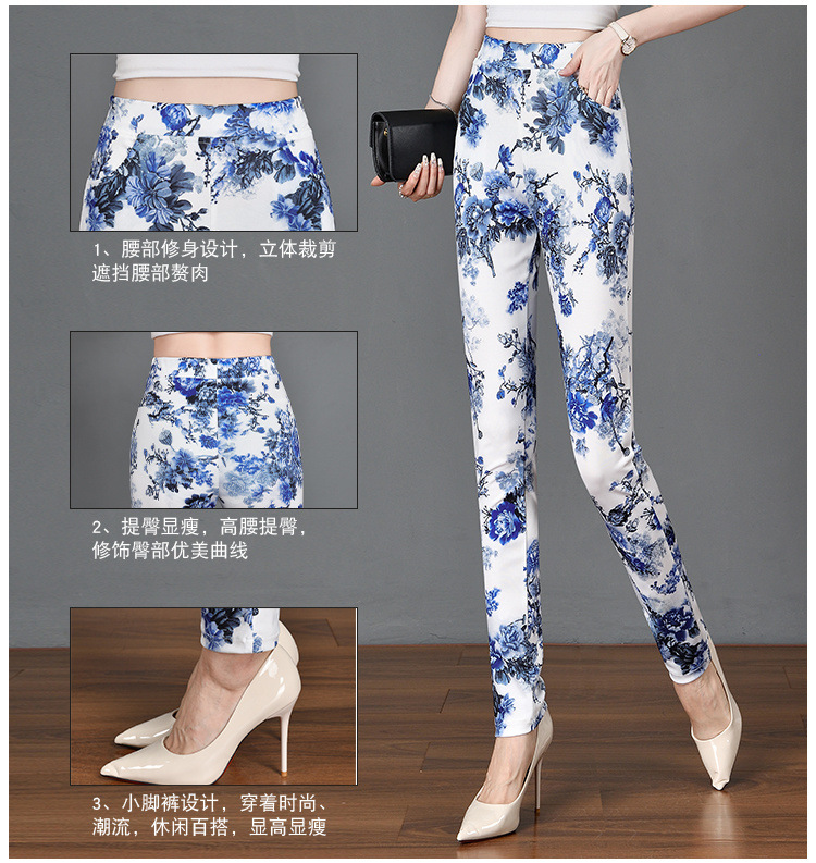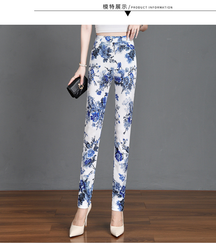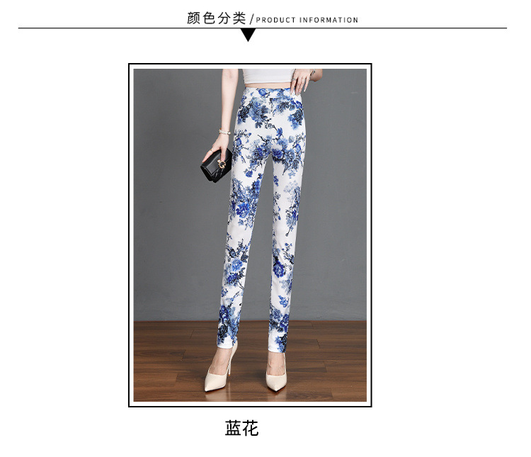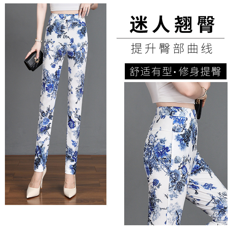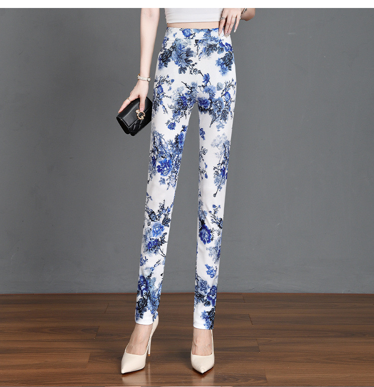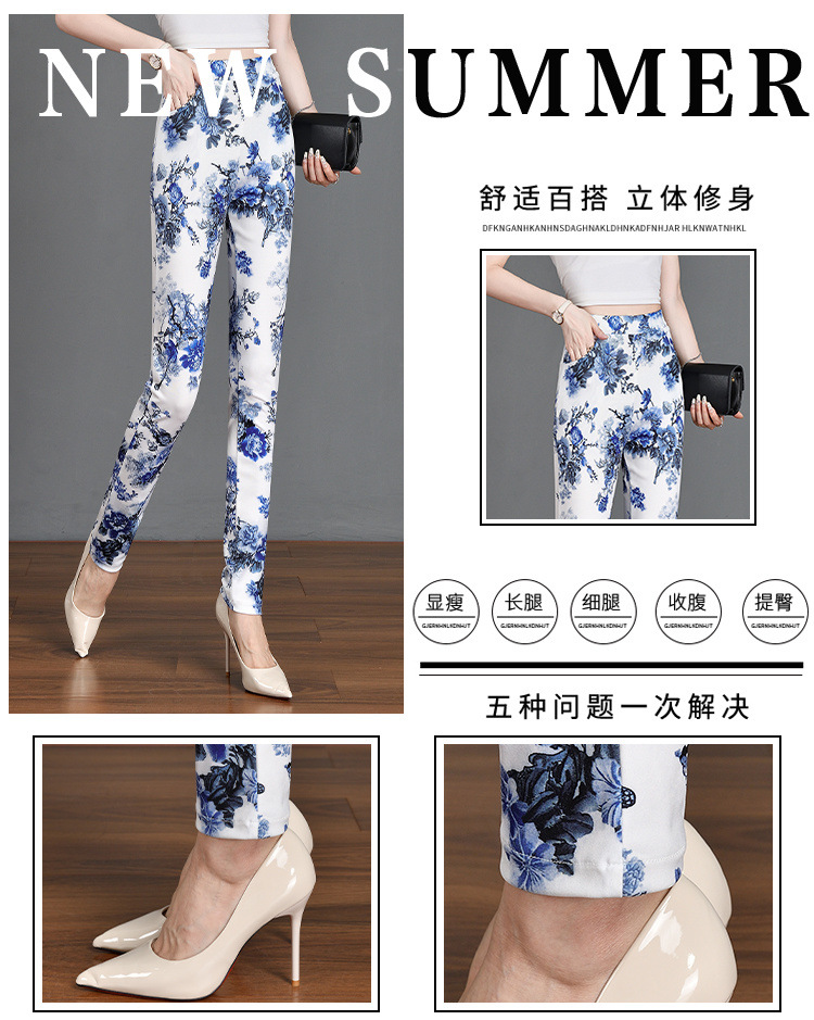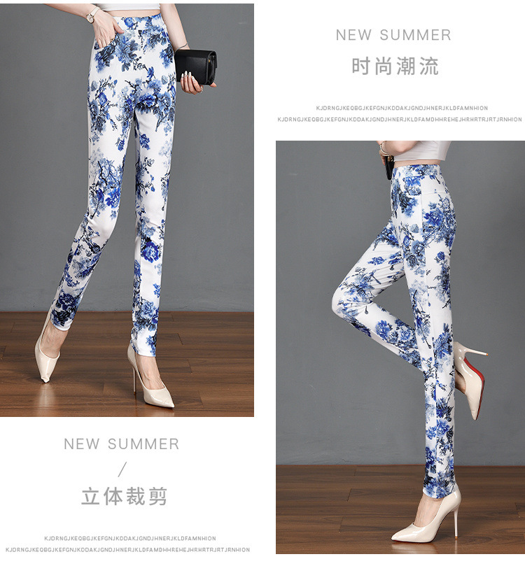 올 매치 에메랄드 프린트 2024 여름 새로운 탄성 허리 플로럴 체크 무늬 바지 슬리밍 스키니 바지 여성용 바지