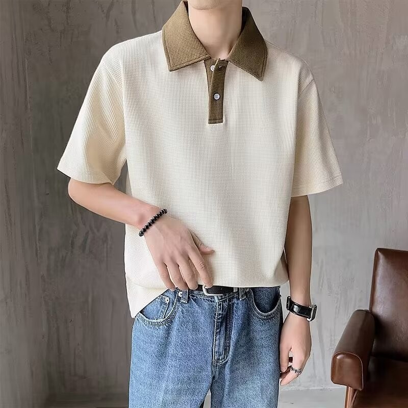 여름 고급 대비 컬러 디자인 폴로 셔츠 남성용 반팔 헤비 와플 트렌디 한 영국 유피 옷깃 티셔츠스토어 가기