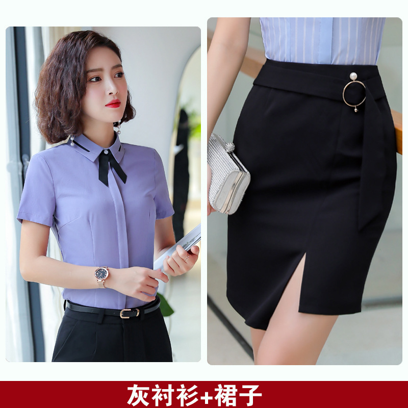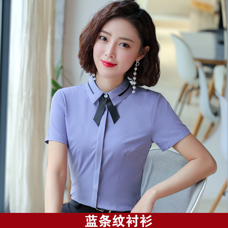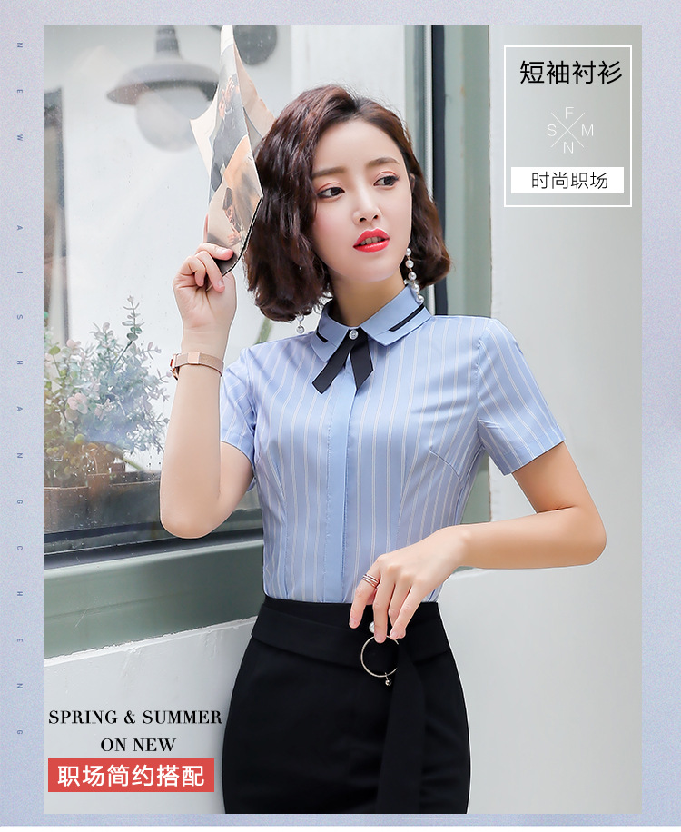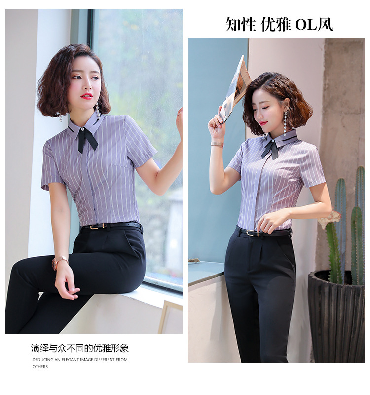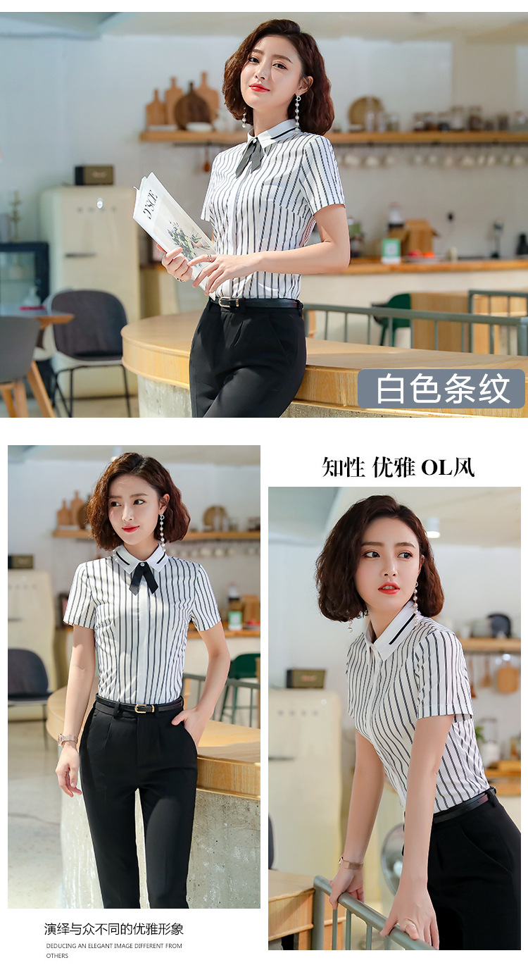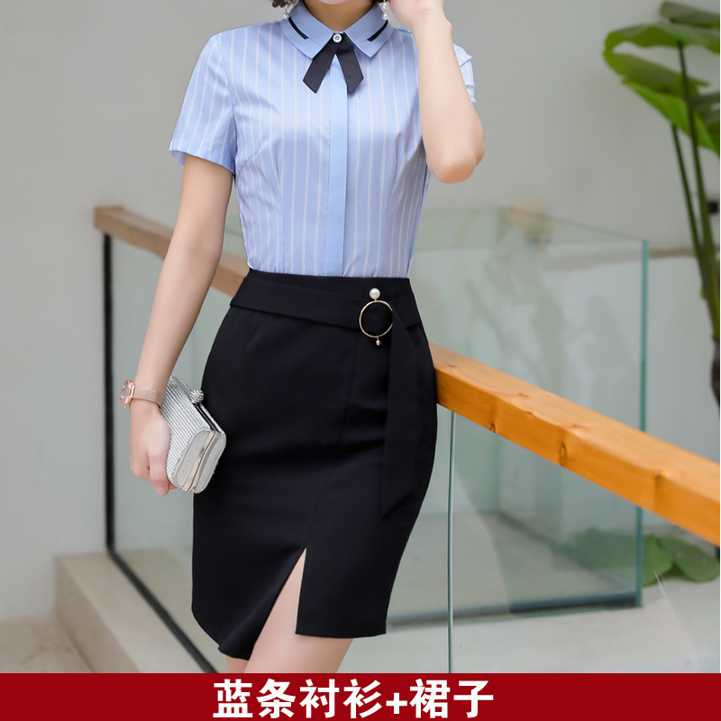 Qiguniang 여름 전문 반팔 줄무늬 셔츠 여성 호텔 프런트 데스크 작업복 세트 레스토랑 웨이터 셔츠