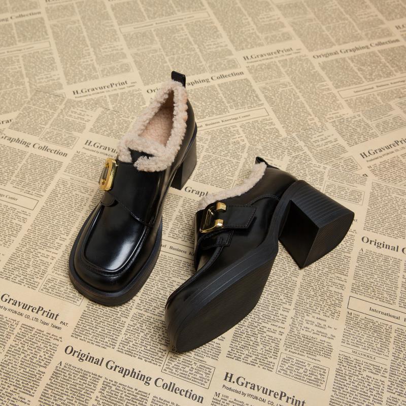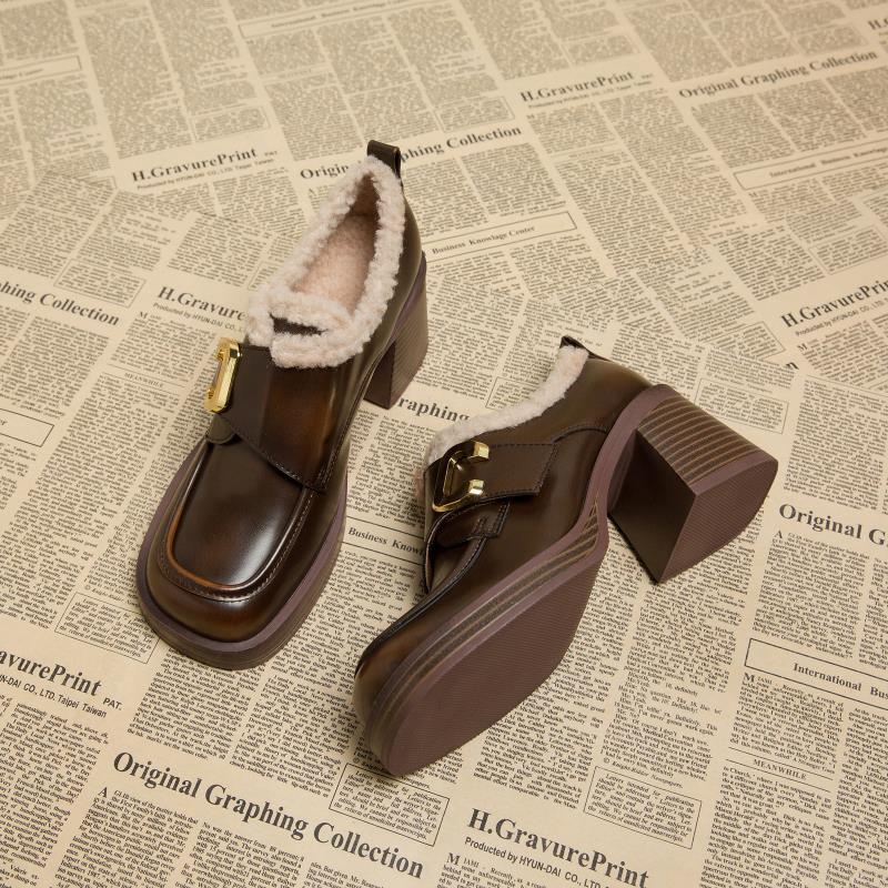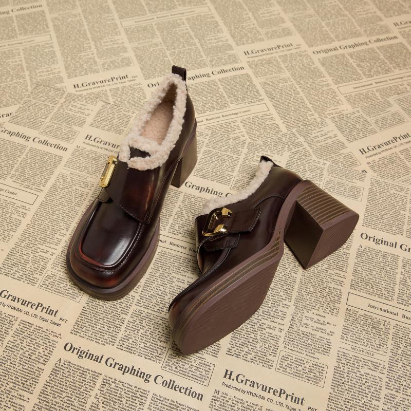 712-16 레트로 스타일 신발 2025 가을 겨울 신상품 플러스 벨벳 면화 신발 하이힐 로퍼 작은 가죽 신발스토어 가기