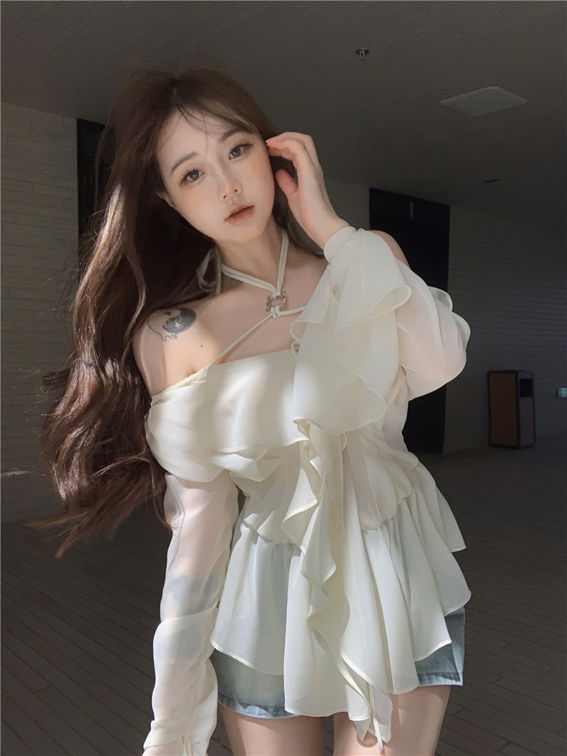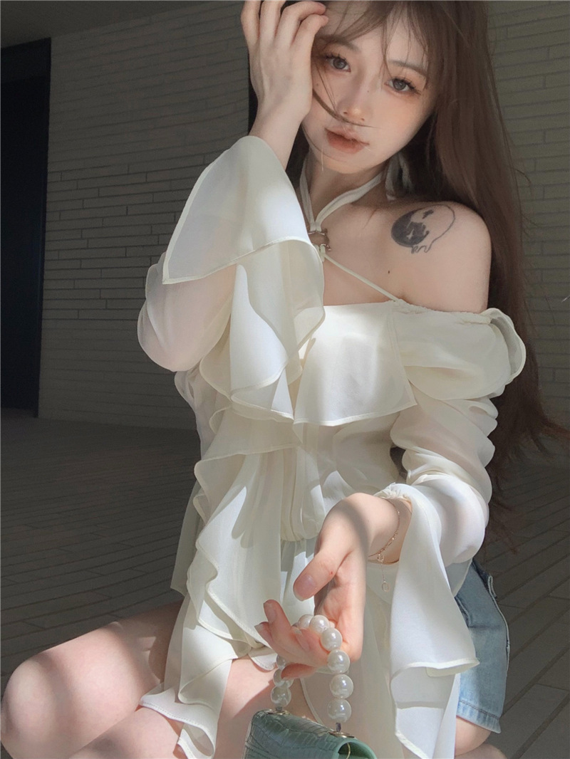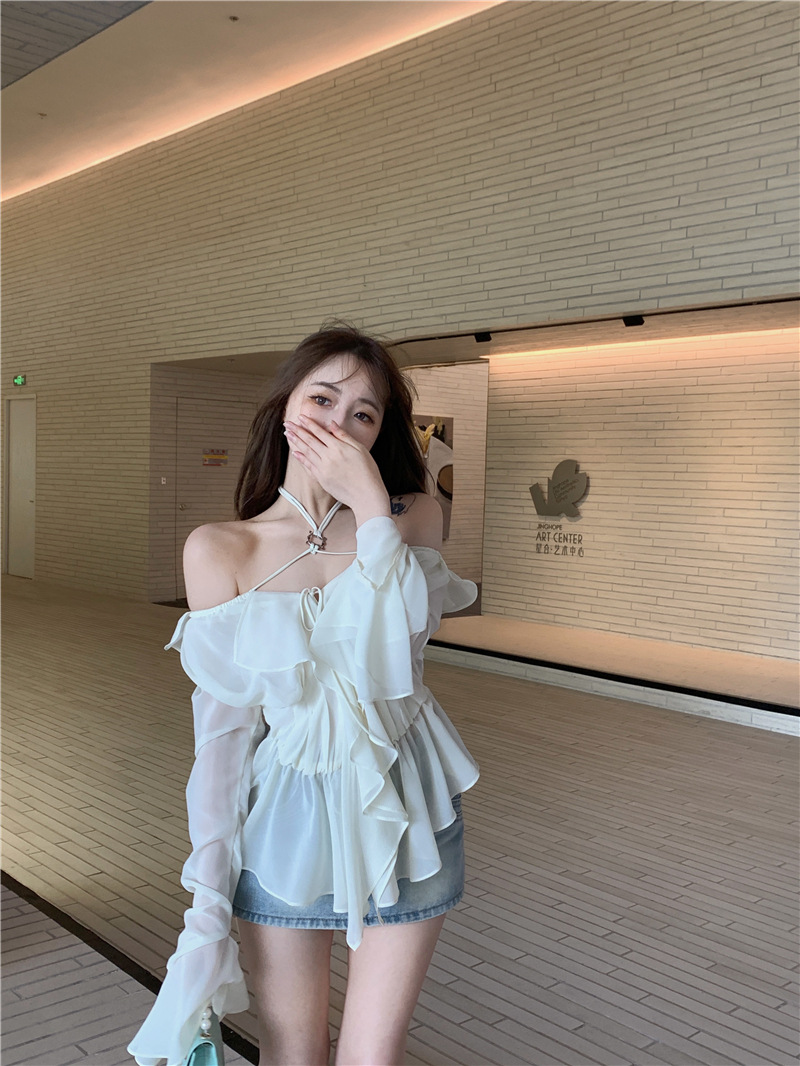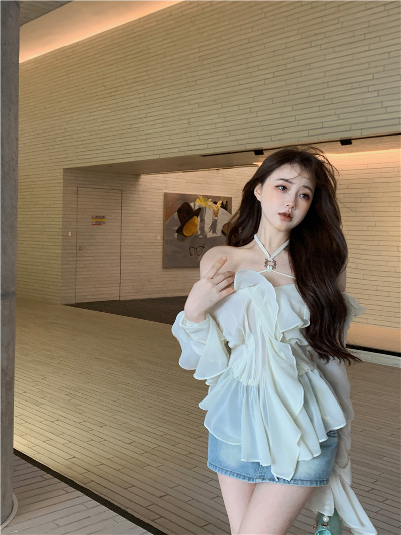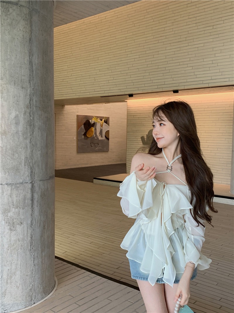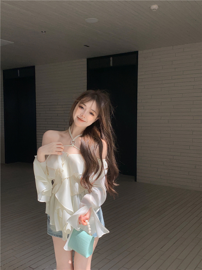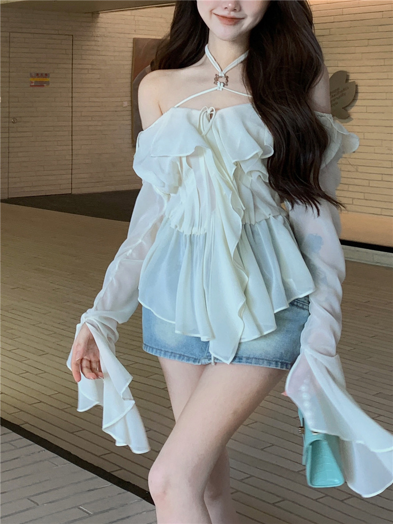 봄 신상 홀터넥 쉬폰 셔츠, 플레어 슬리브와 러플 장식으로 요정같은 분위기 연출하는 여성용 셔츠