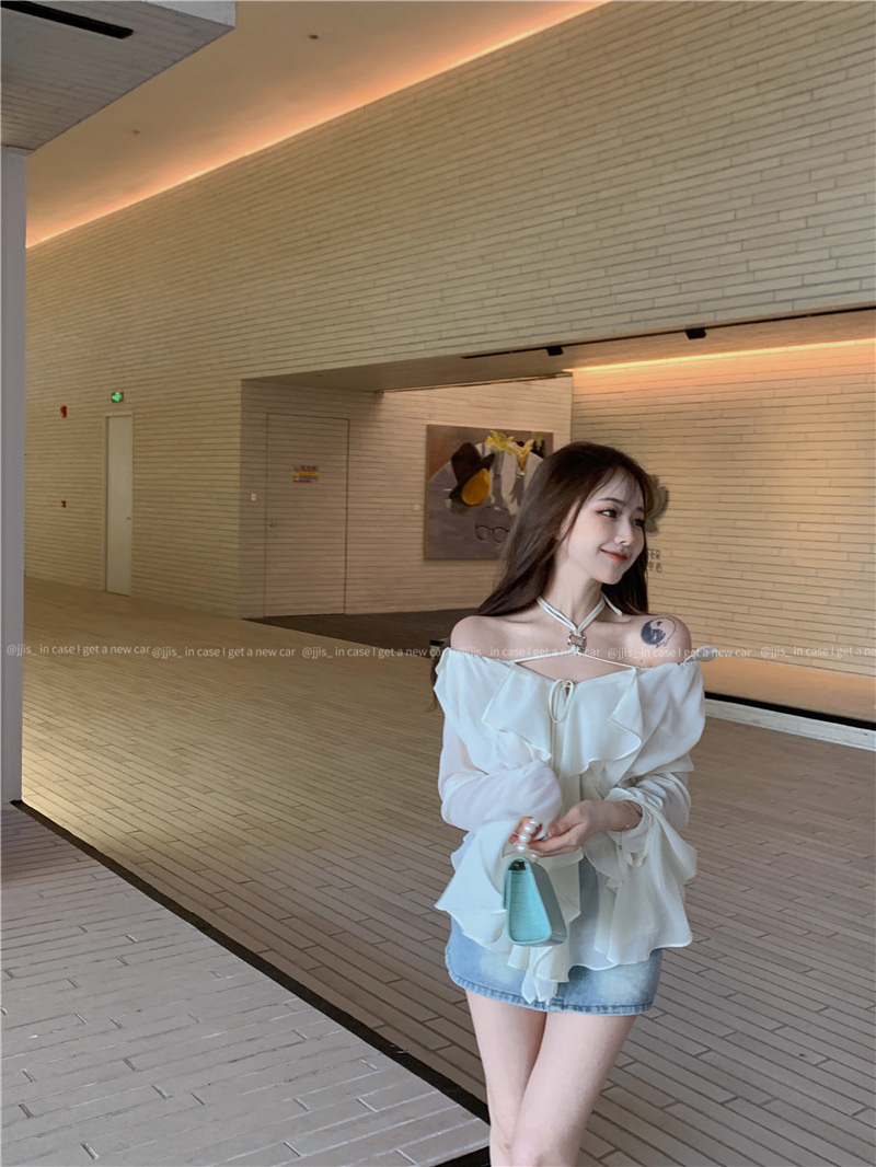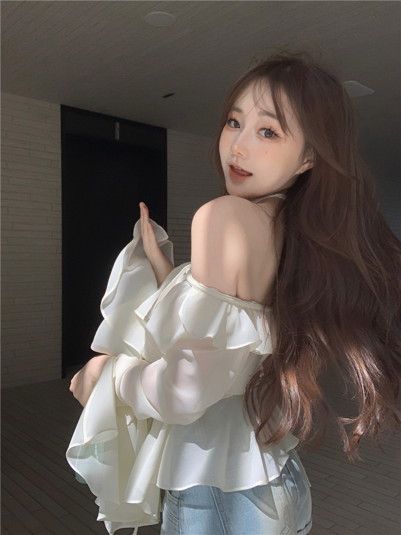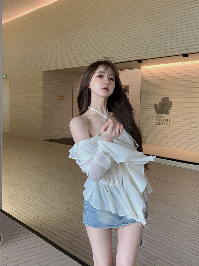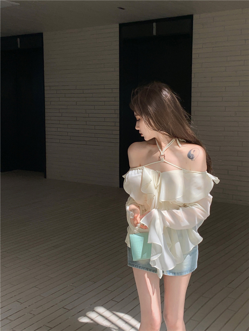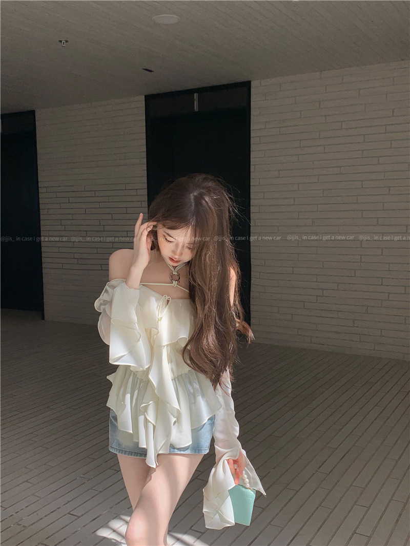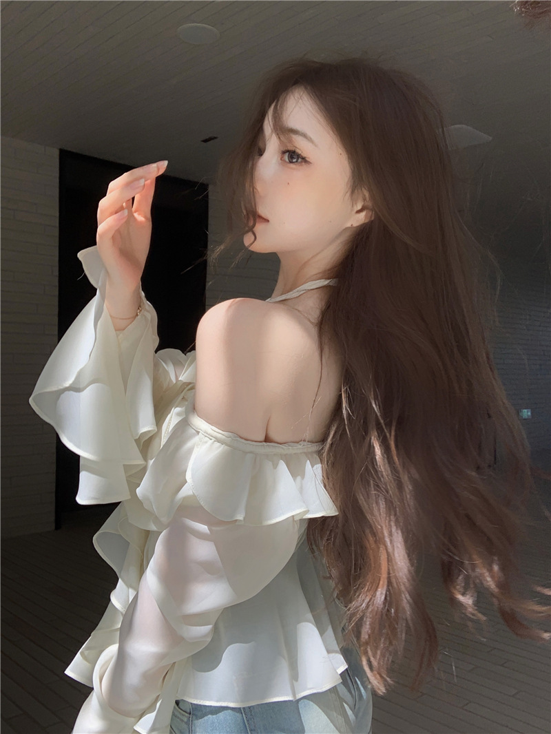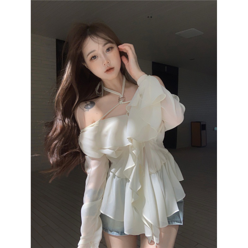 봄 신상 홀터넥 쉬폰 셔츠, 플레어 슬리브와 러플 장식으로 요정같은 분위기 연출하는 여성용 셔츠