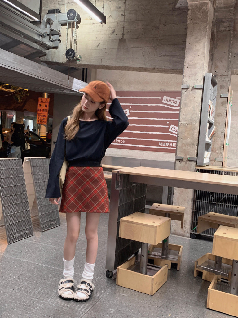 2023 소녀의 새로운 복고풍 크리스마스 모직 빨간 격자 무늬 스커트 디자인 높은 허리 A 라인 엉덩이 치마스토어 가기