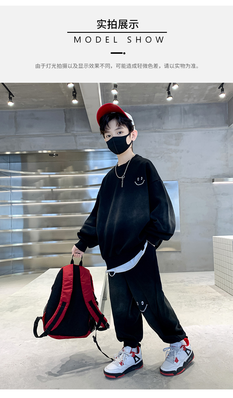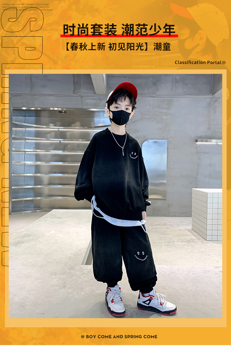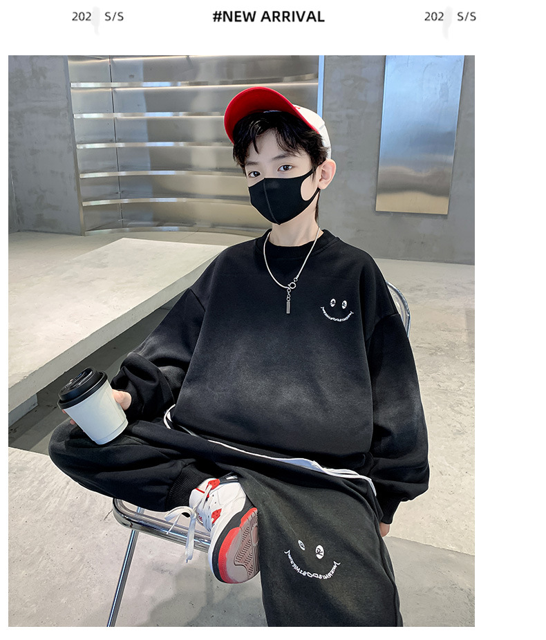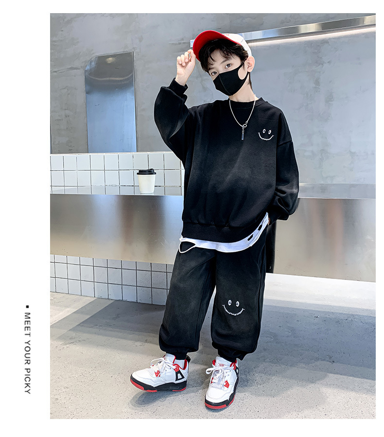 소년의 봄 세트 2024 새로운 중형 및 대형 어린이의 세련된 잘 생긴 웃는 얼굴 2 피스 아동복 봄과 가을 옷스토어 가기