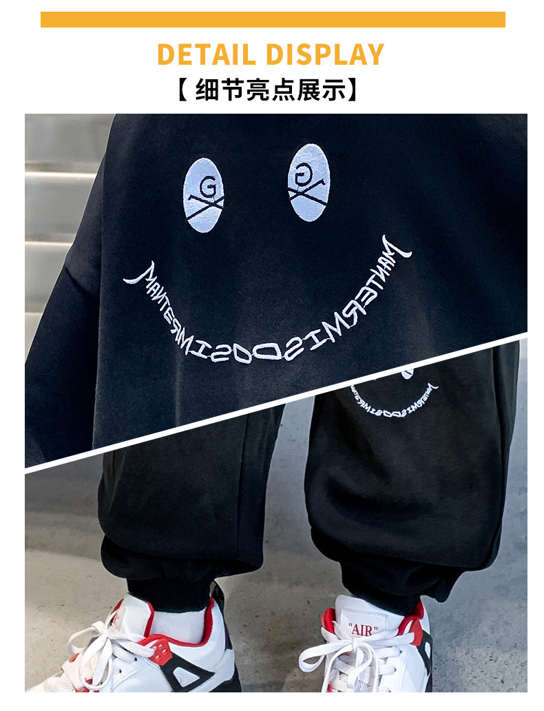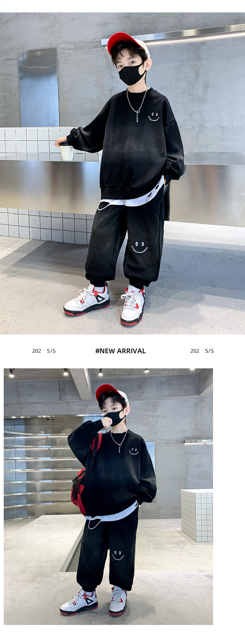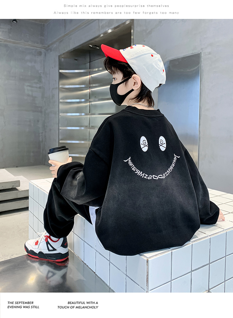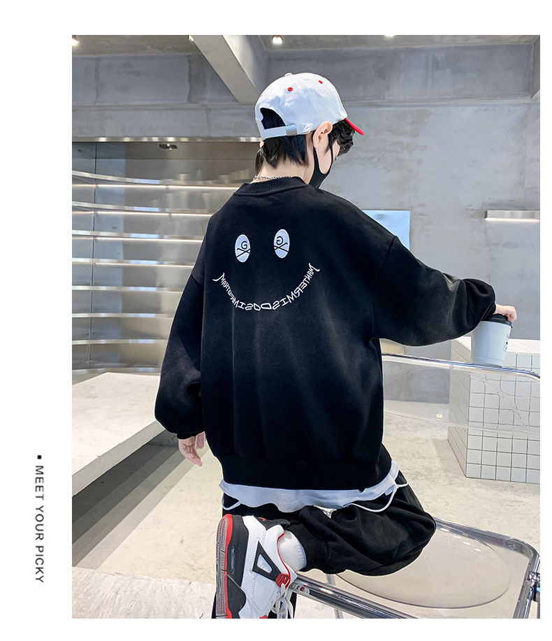 소년의 봄 세트 2024 새로운 중형 및 대형 어린이의 세련된 잘 생긴 웃는 얼굴 2 피스 아동복 봄과 가을 옷스토어 가기
