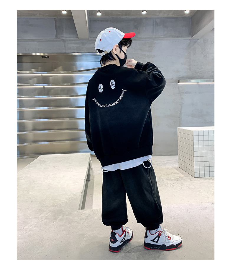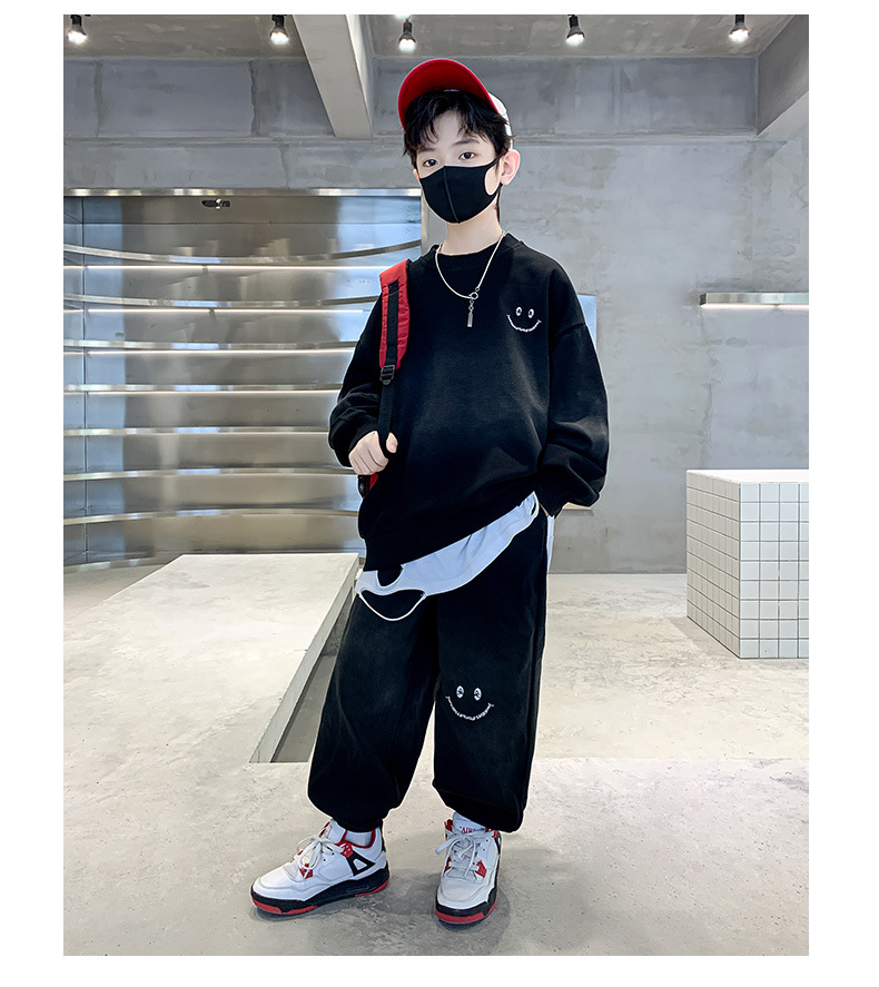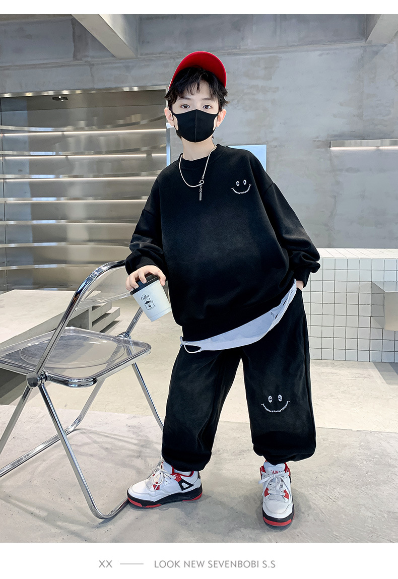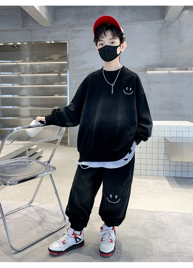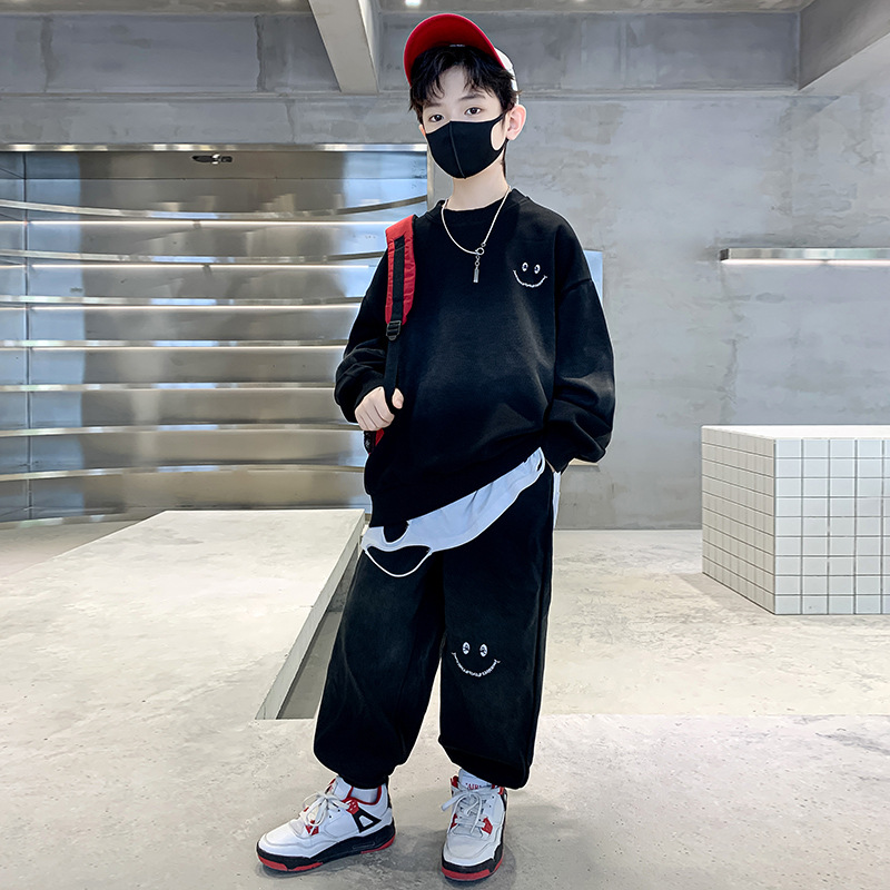 소년의 봄 세트 2024 새로운 중형 및 대형 어린이의 세련된 잘 생긴 웃는 얼굴 2 피스 아동복 봄과 가을 옷