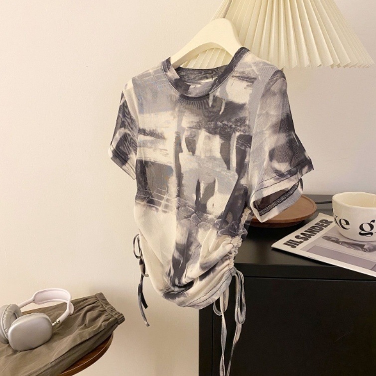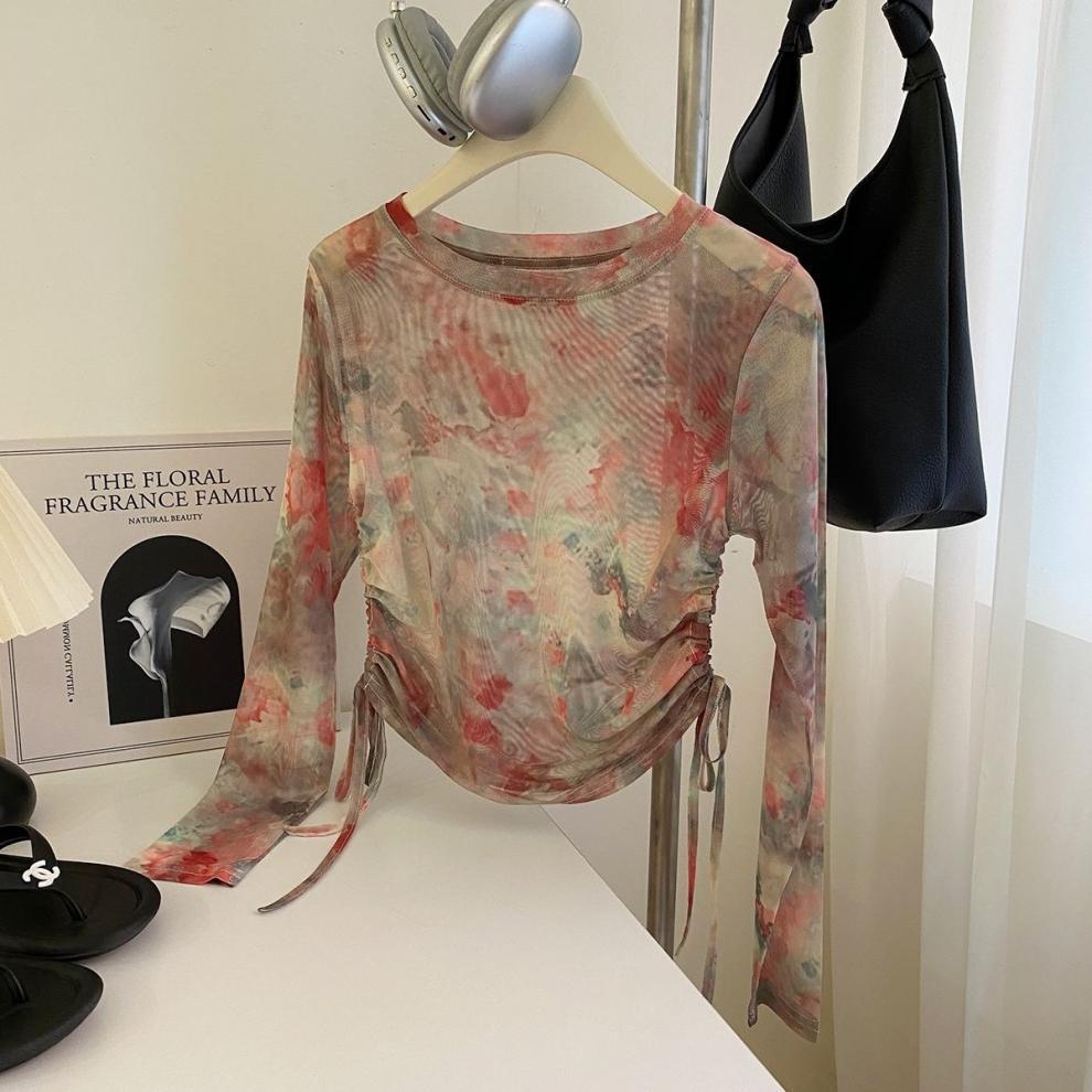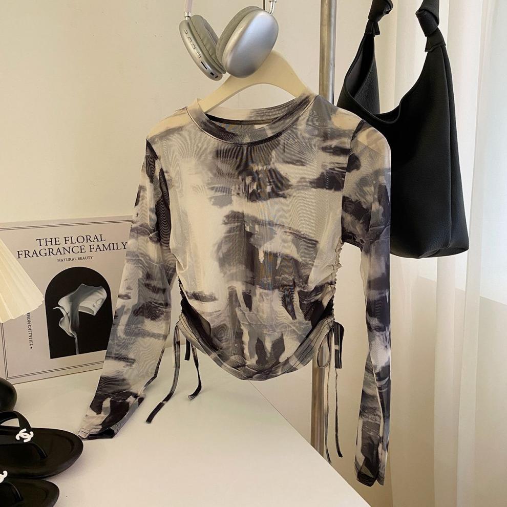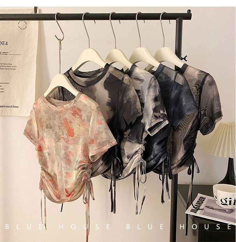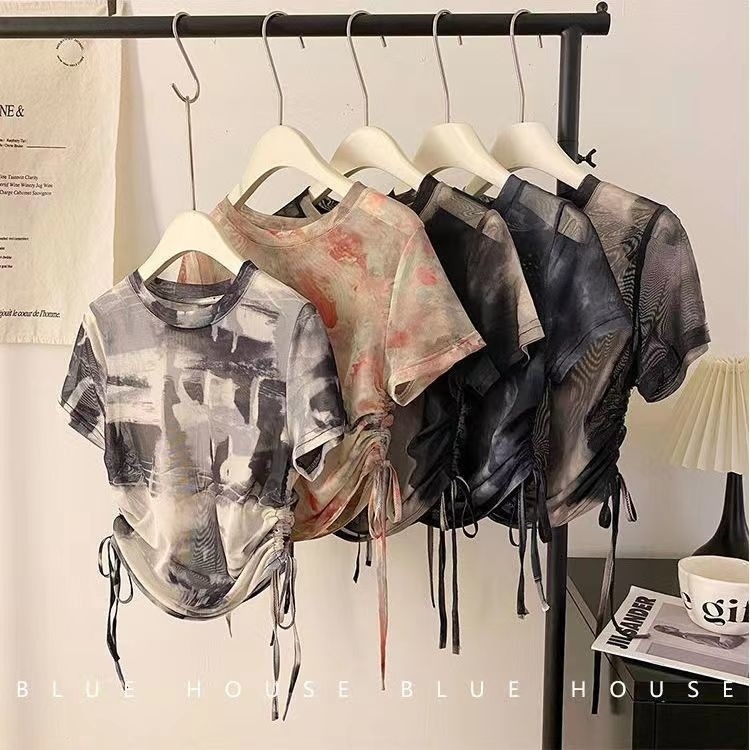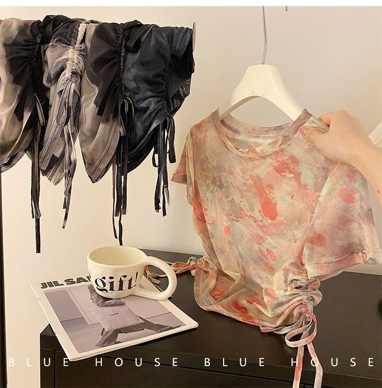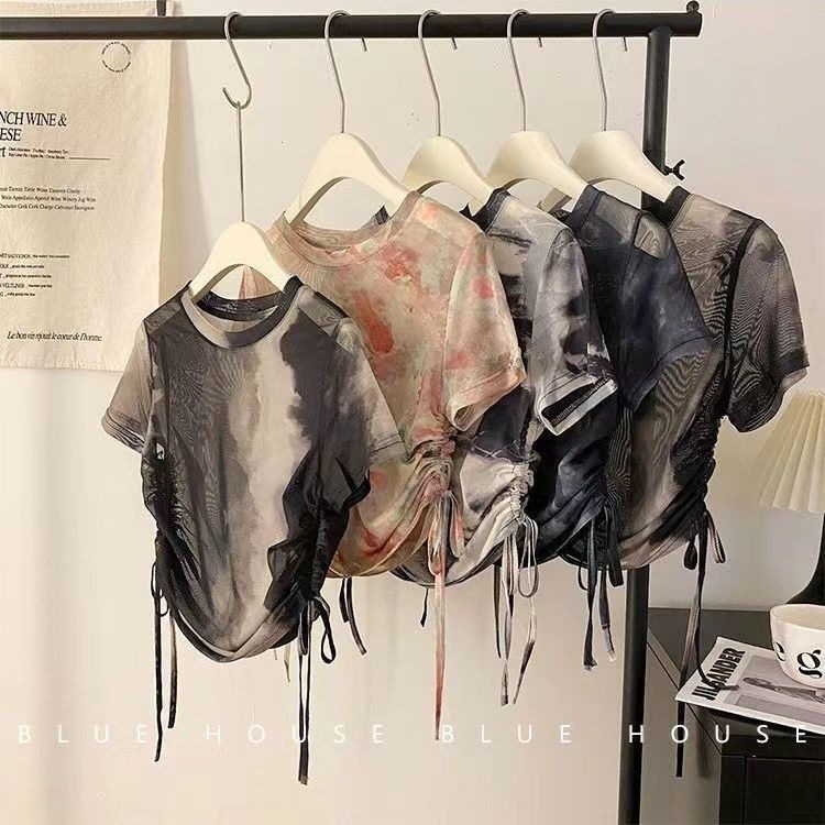 아메리칸 스타일 레트로 달콤한 매운 사이드 드로우 스트링 셔츠 여성용 주름 넥타이-염료 썬 스크린 얇은 슬림-핏 메쉬 탑스토어 가기