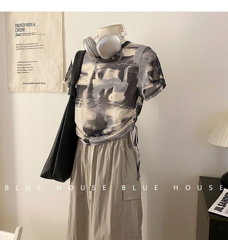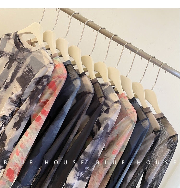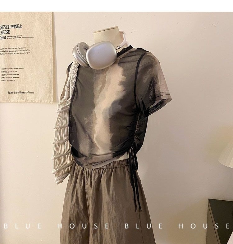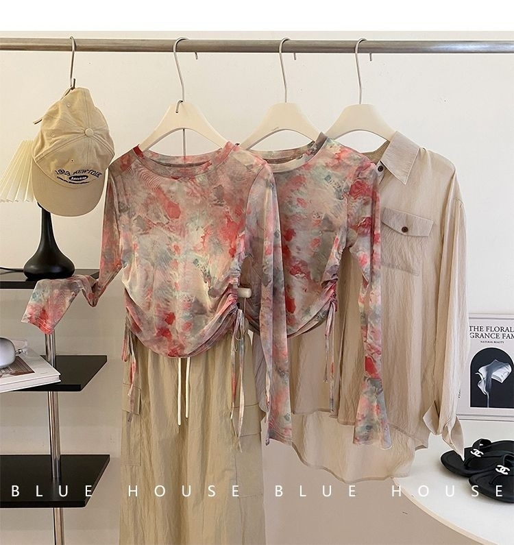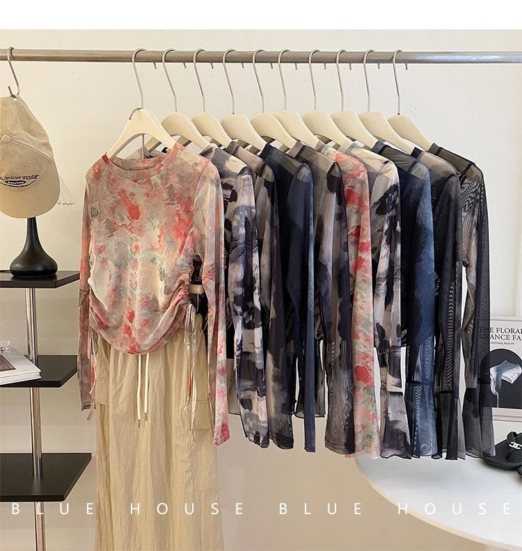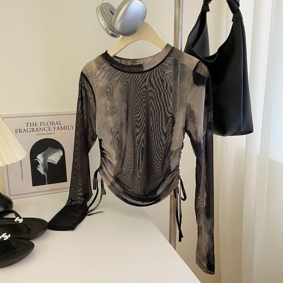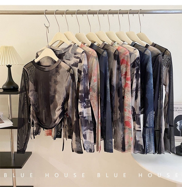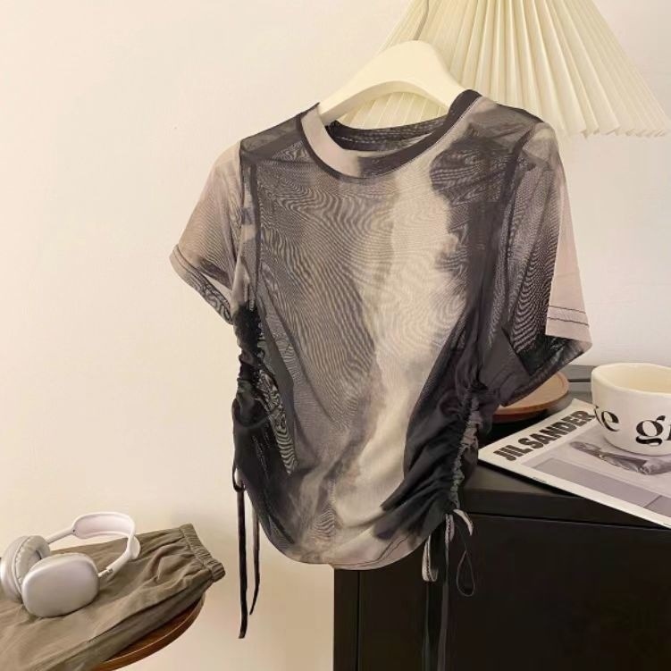 아메리칸 스타일 레트로 달콤한 매운 사이드 드로우 스트링 셔츠 여성용 주름 넥타이-염료 썬 스크린 얇은 슬림-핏 메쉬 탑스토어 가기
