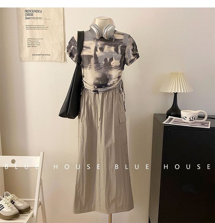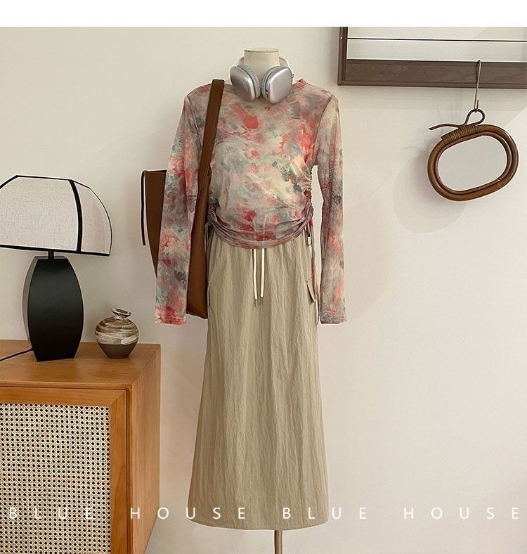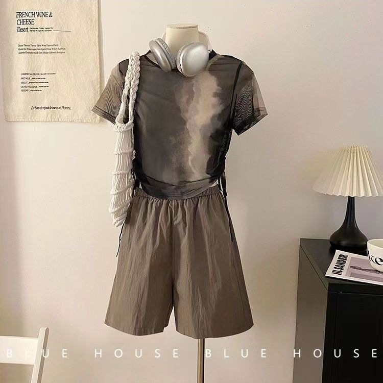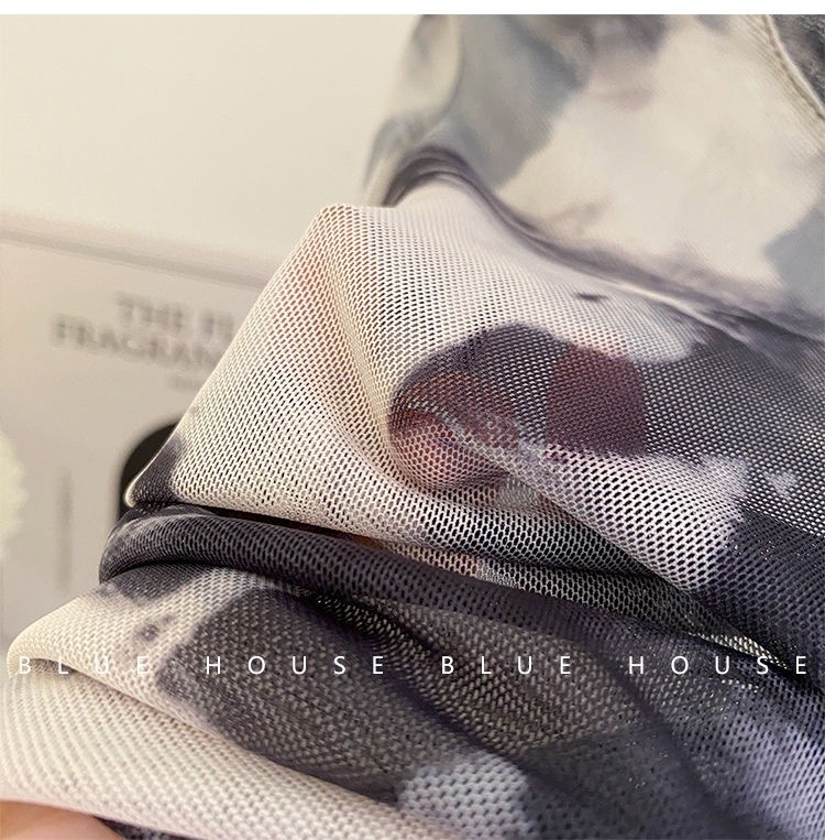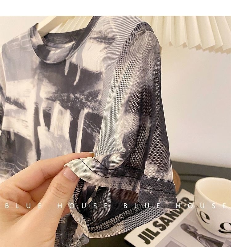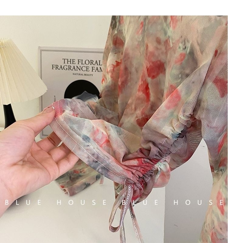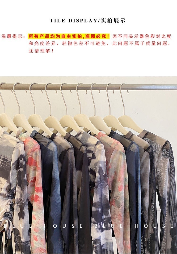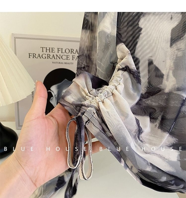 아메리칸 스타일 레트로 달콤한 매운 사이드 드로우 스트링 셔츠 여성용 주름 넥타이-염료 썬 스크린 얇은 슬림-핏 메쉬 탑스토어 가기