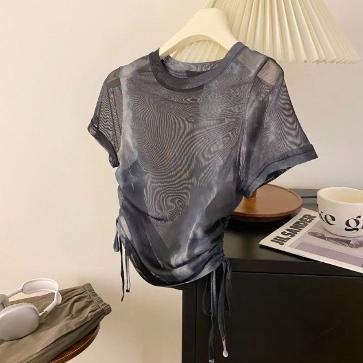美式复古甜辣风两侧抽绳t恤女褶皱扎染防晒衣薄款修身网纱上衣ins