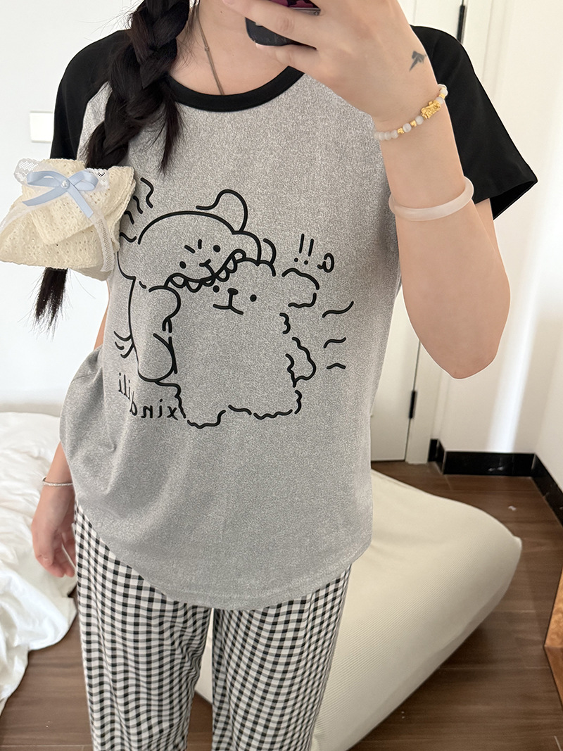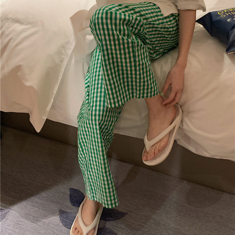 2024 년 여름 새 파자마 여성 반팔 바지 느슨한 홈 의류 일본 캐주얼 격자 무늬 세트