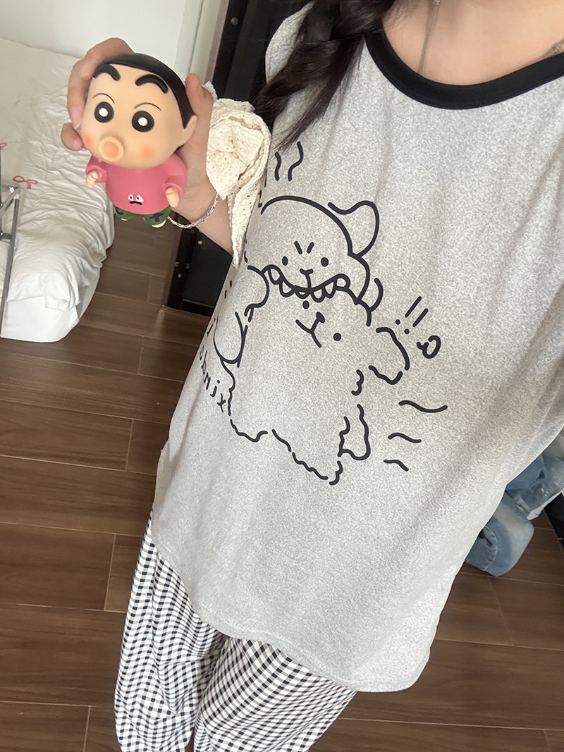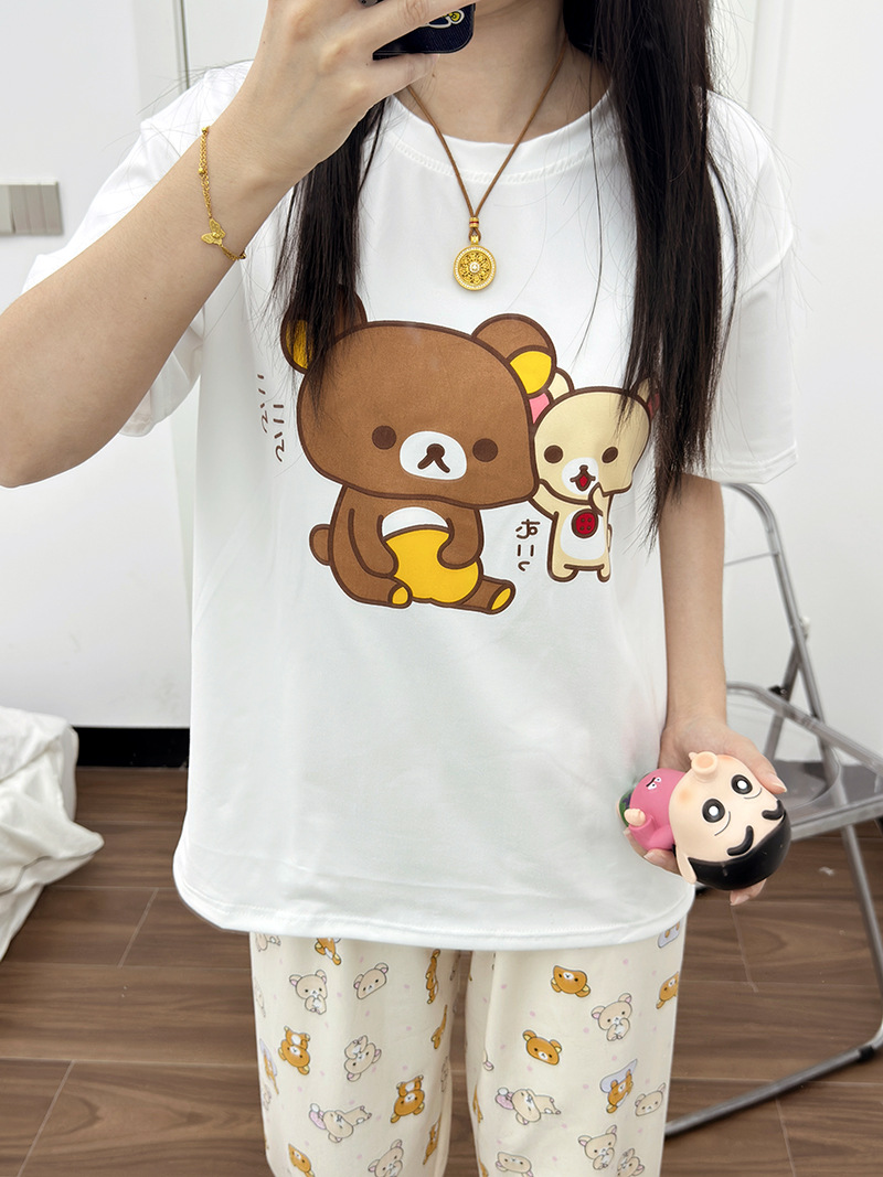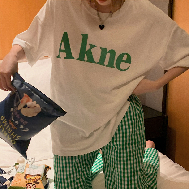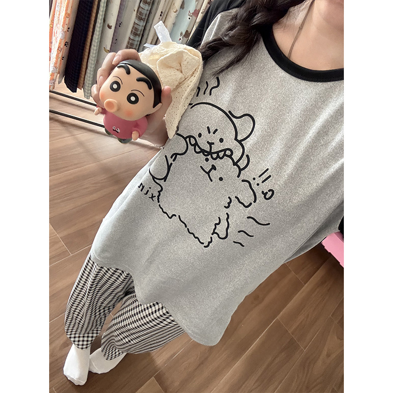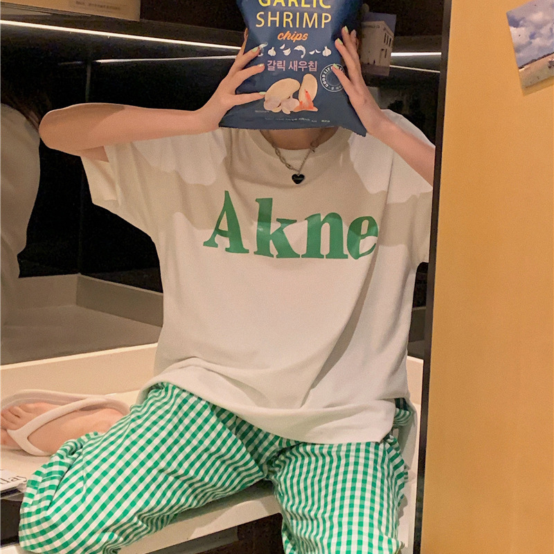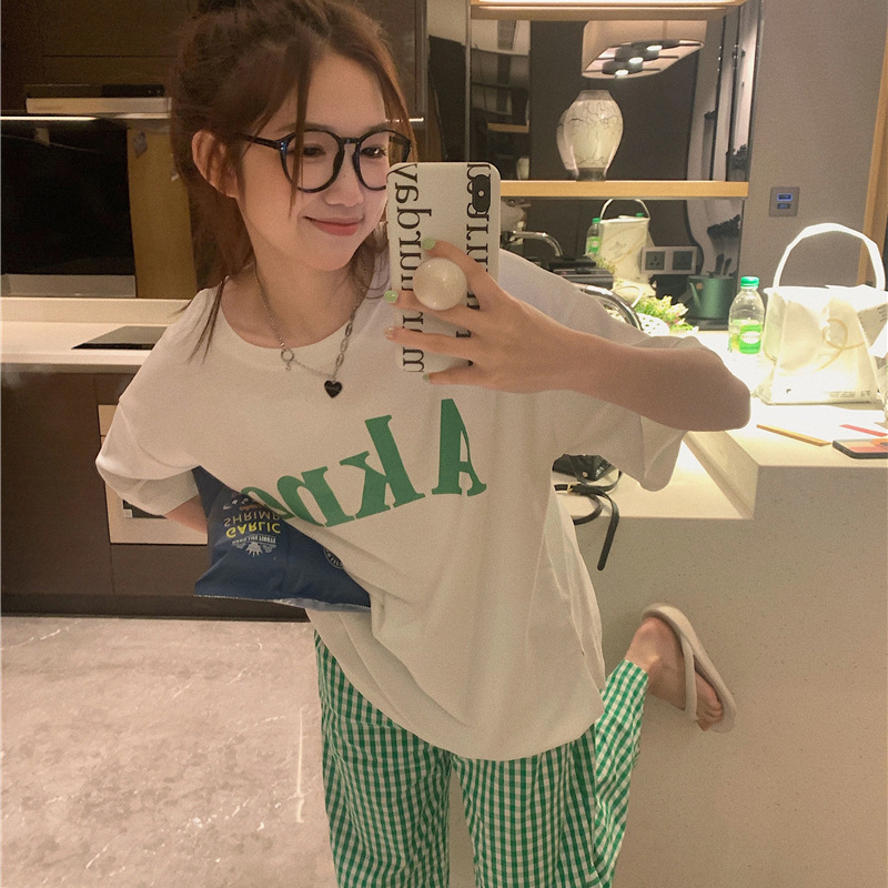2024 년 여름 새 파자마 여성 반팔 바지 느슨한 홈 의류 일본 캐주얼 격자 무늬 세트스토어 가기