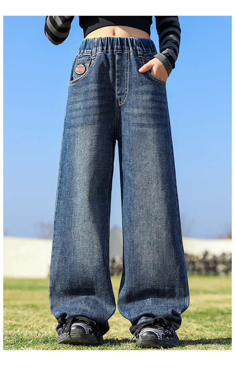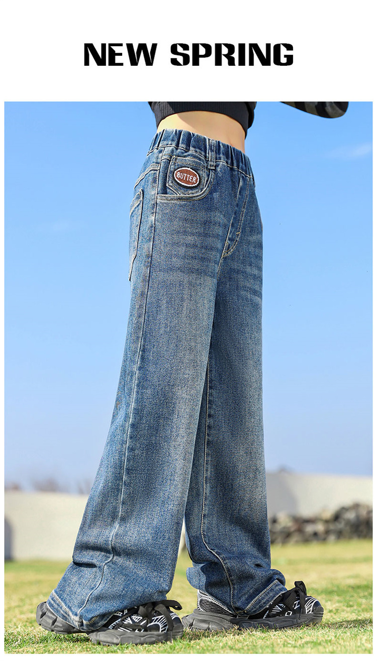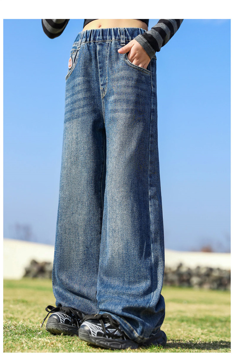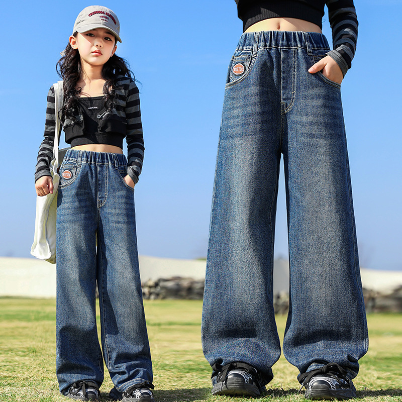 소녀의 평범한 넓은 다리 바지 2024 봄 새로운 한국식 어린이 바지 중형 및 대형 어린이 느슨한 캐주얼 청바지 대외 무역 패션스토어 가기