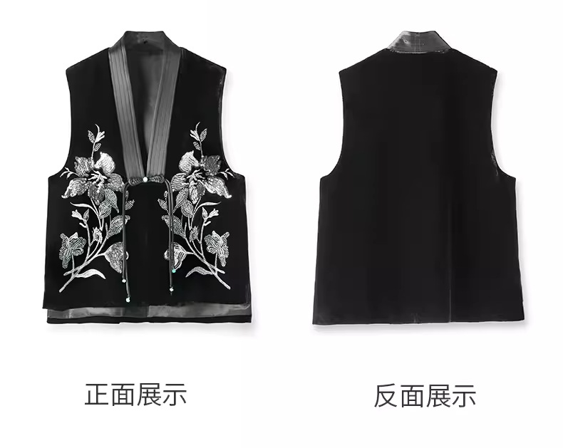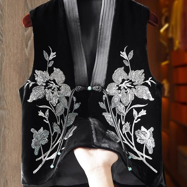 유럽 벨벳 리얼 실크 조끼 여성 가을 및 겨울 새로운 중국 스타일 국가 스타일 조끼 빈티지 중공업 자수 버클 탑스토어 가기