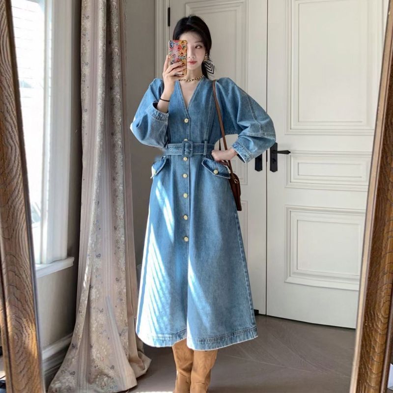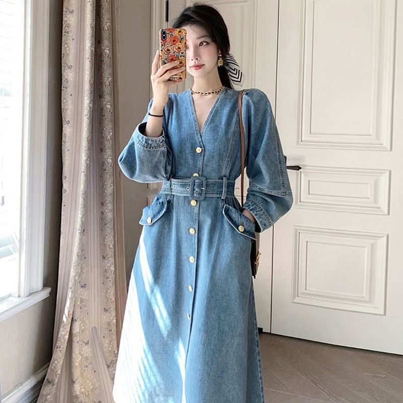 아름다운 봄과 가을 새로운 유럽 뚱뚱한 소녀 슬리밍 하이 엔드 프랑스 A-라인 원피스 어린 이용 데님 원피스스토어 가기