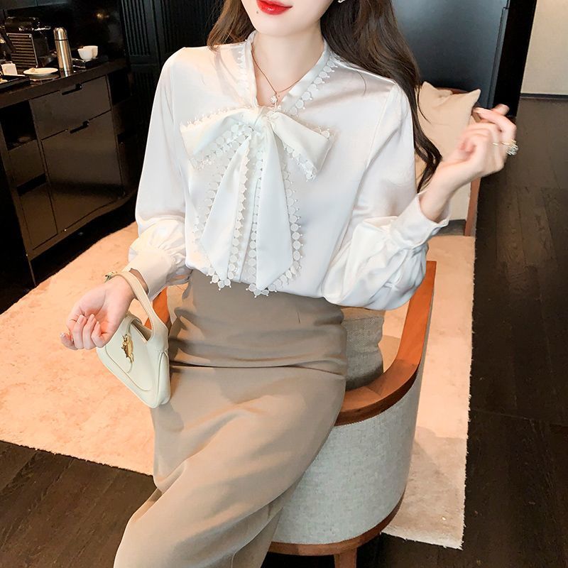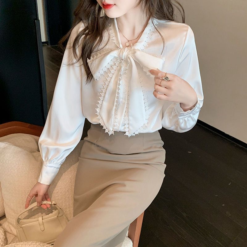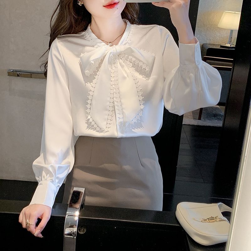 2024 봄 가을 패션 긴팔 리본 쉬폰 셔츠 여성 레이스 이너웨어 탑 우아하고 다재다능한 여성복스토어 가기
