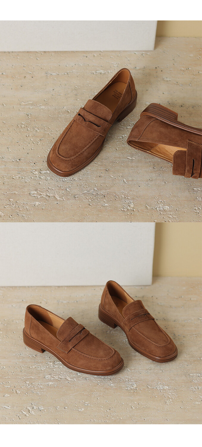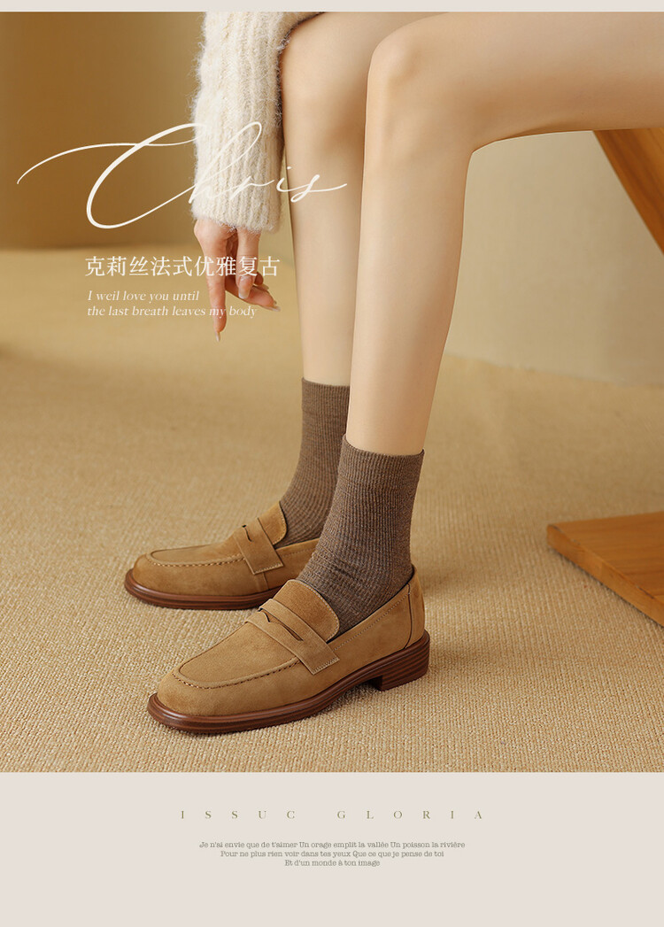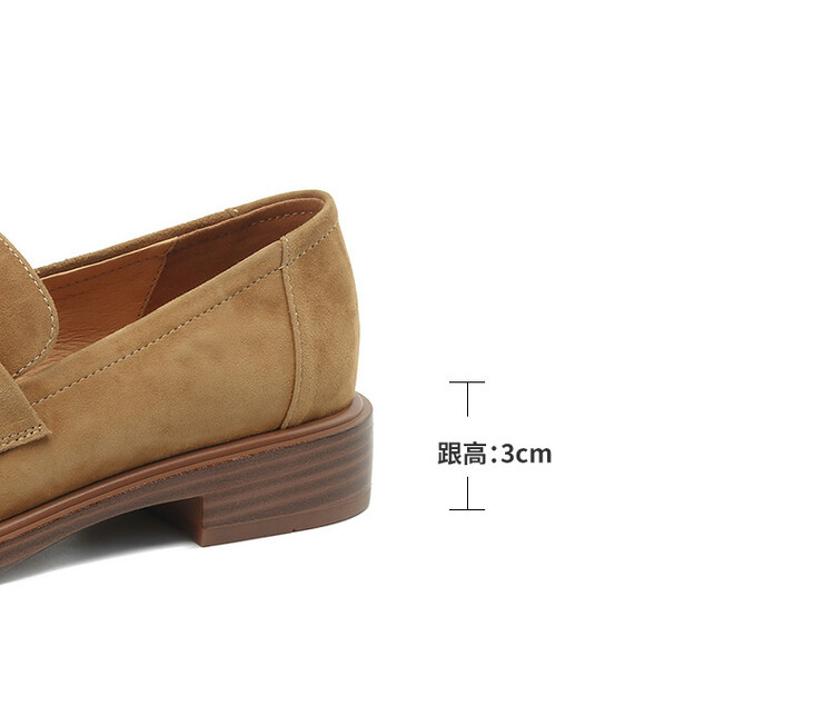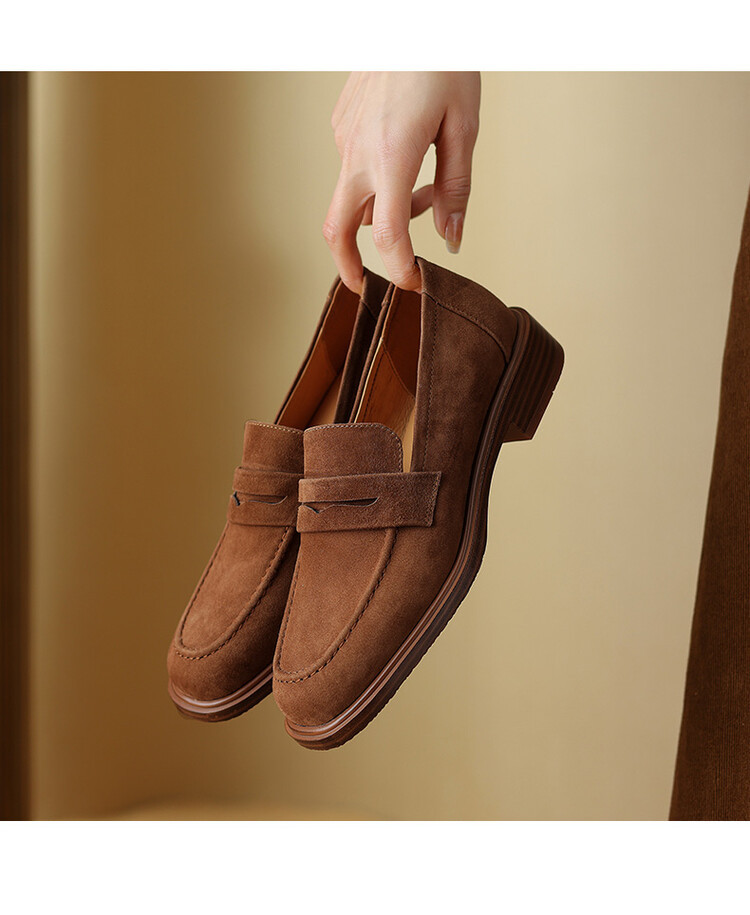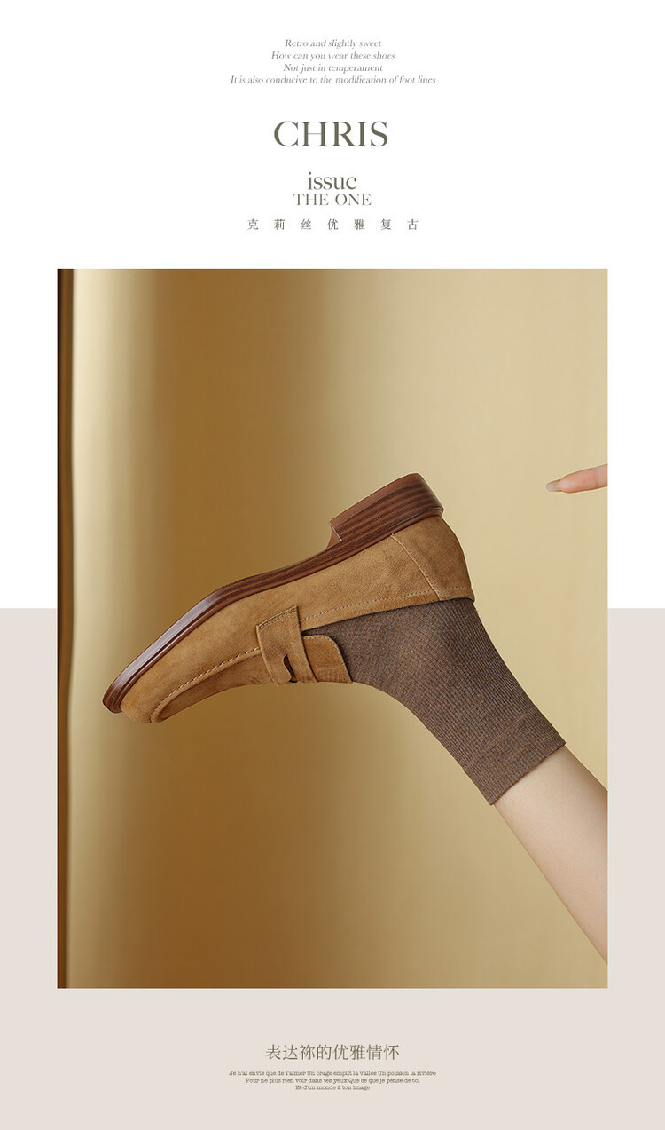 다크 브라운 로퍼 여성 뉴 2023 가을 및 겨울 양가죽 사각 발가락 청키 힐 미드 힐 레트로 라운드 토 영국 스타일 싱글 레이어 신발스토어 가기