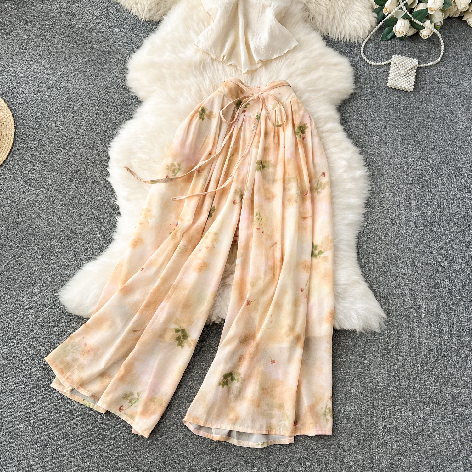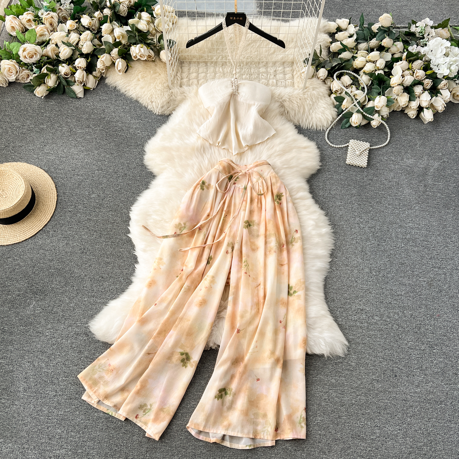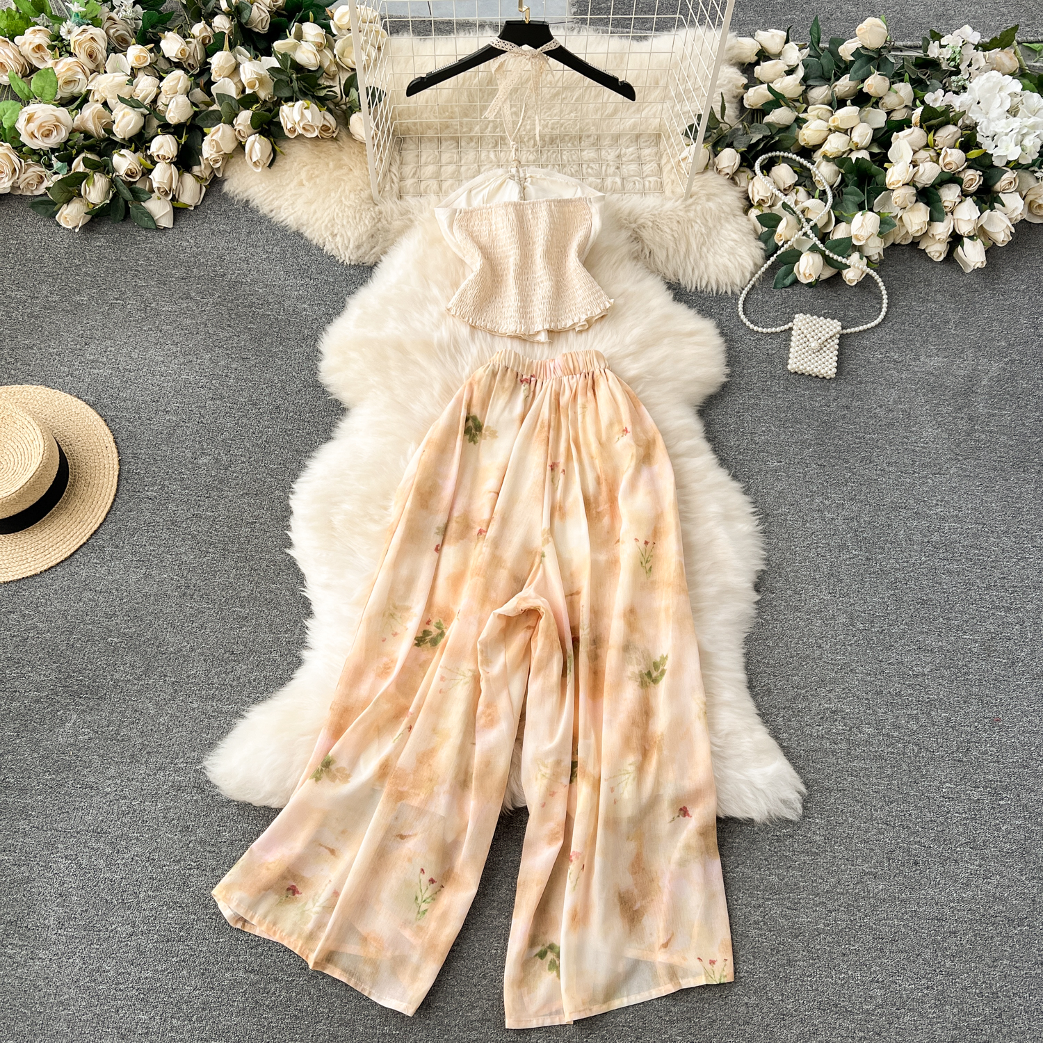여행 샷 휴가 착용 연령 감소 목 튜브 탑 올 매치 복고풍 인쇄 와이드 레그 바지 유행 투피스 세트 패션스토어 가기