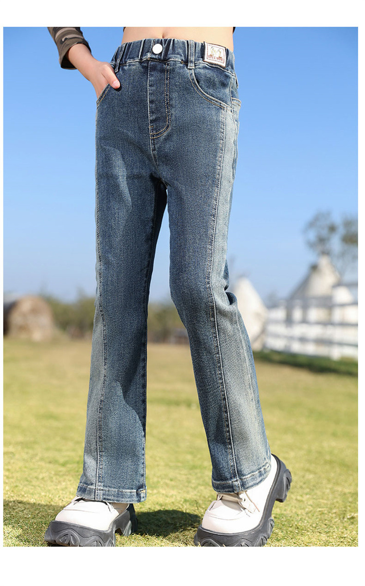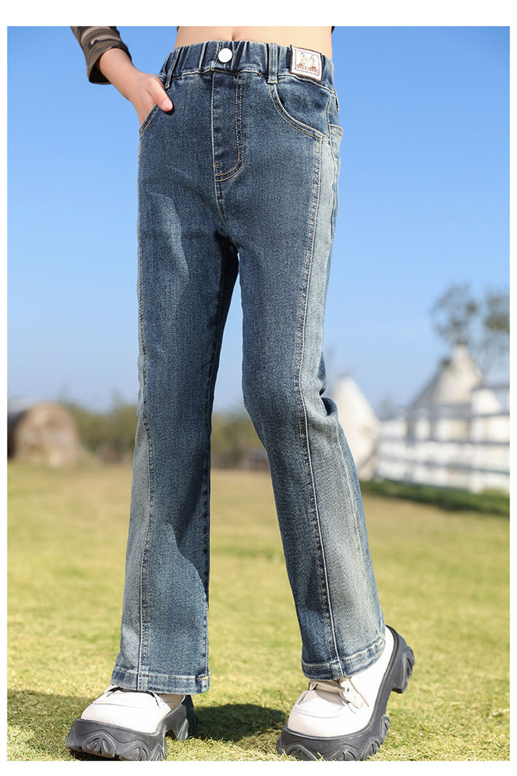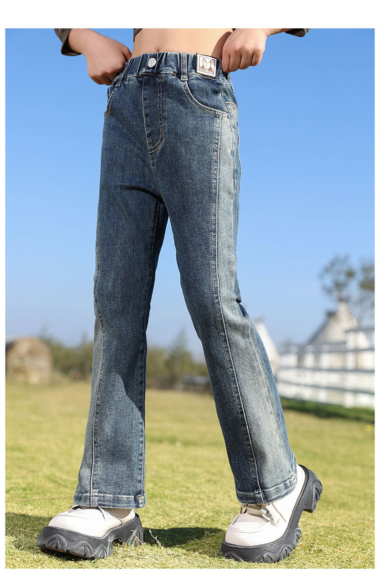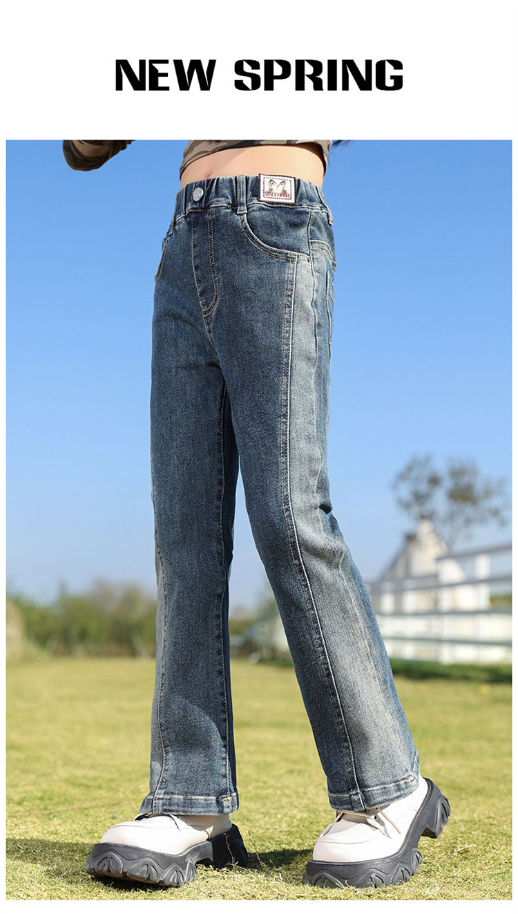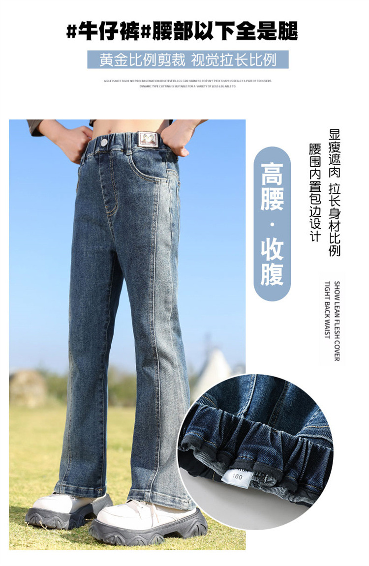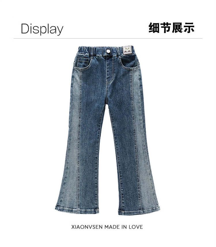 소녀 컬러 매칭 플레어 팬츠 봄 새로운 귀여운 미디어와 큰 어린이 서양식 청바지 스트레칭 어린이 바지 대외 무역 도매 패션스토어 가기