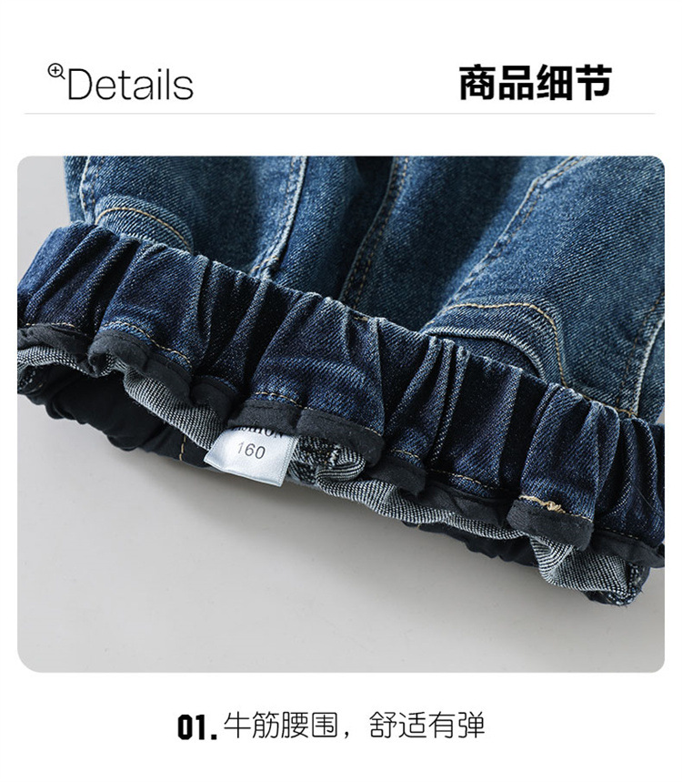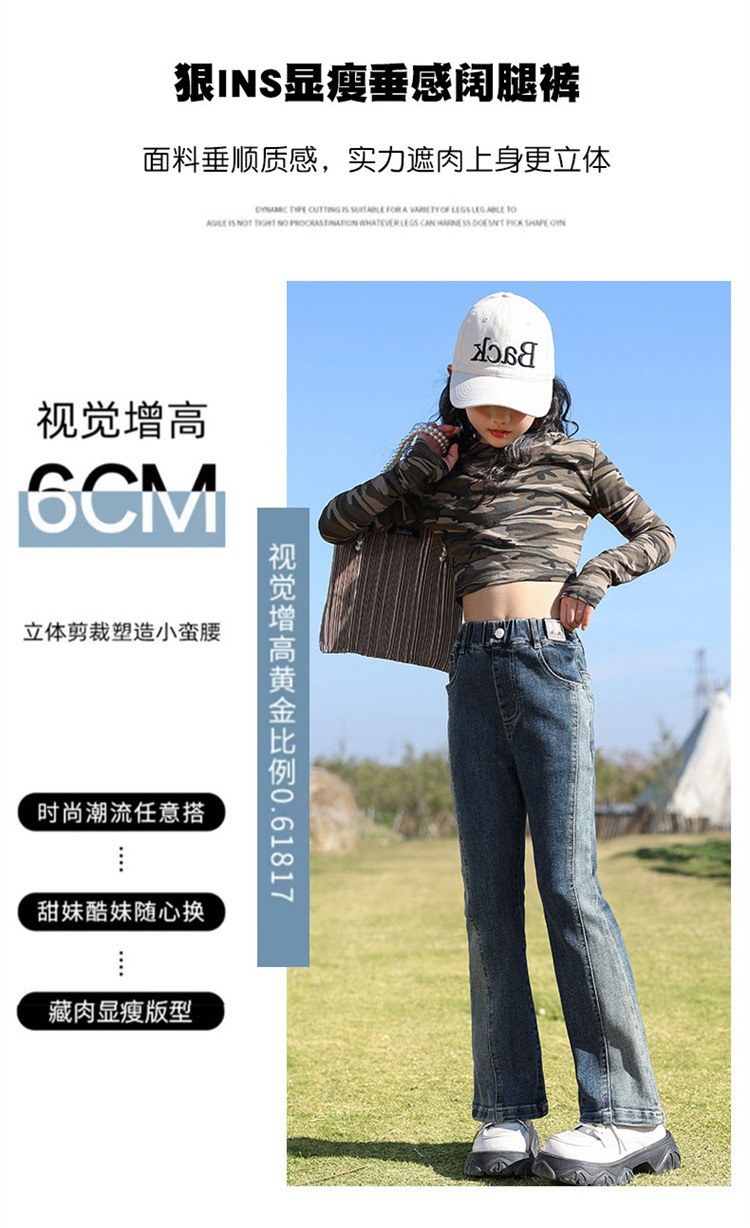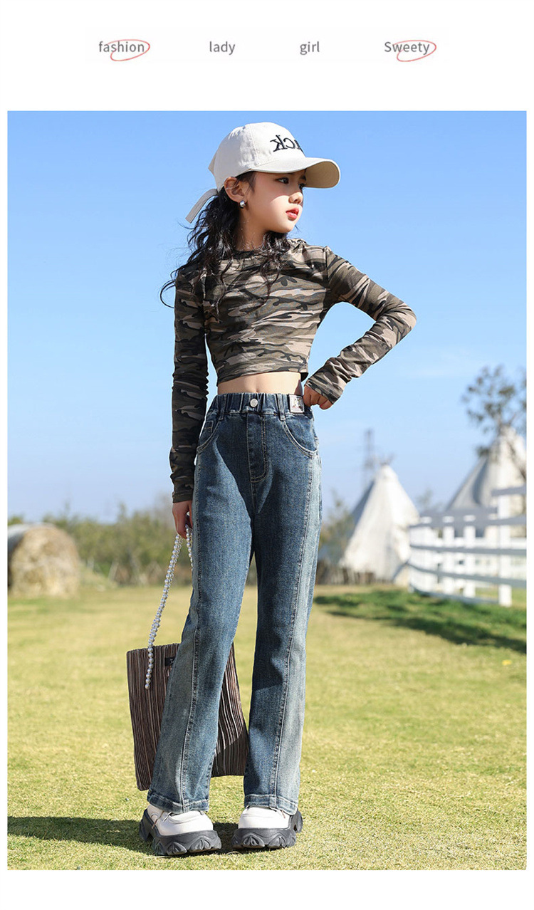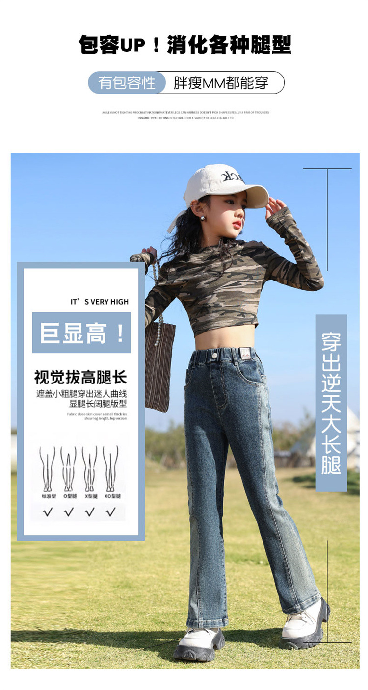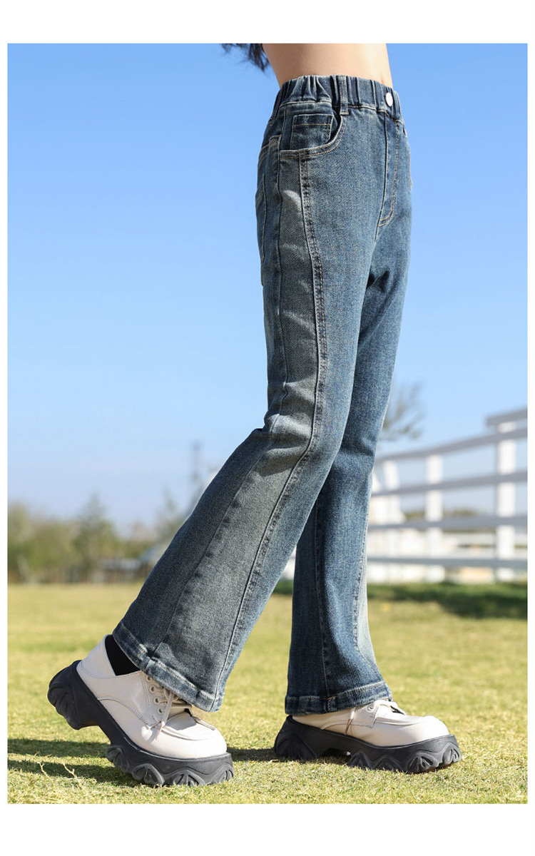 소녀 컬러 매칭 플레어 팬츠 봄 새로운 귀여운 미디어와 큰 어린이 서양식 청바지 스트레칭 어린이 바지 대외 무역 도매 패션스토어 가기