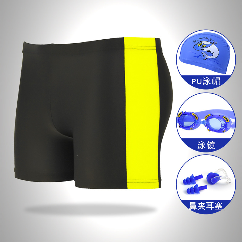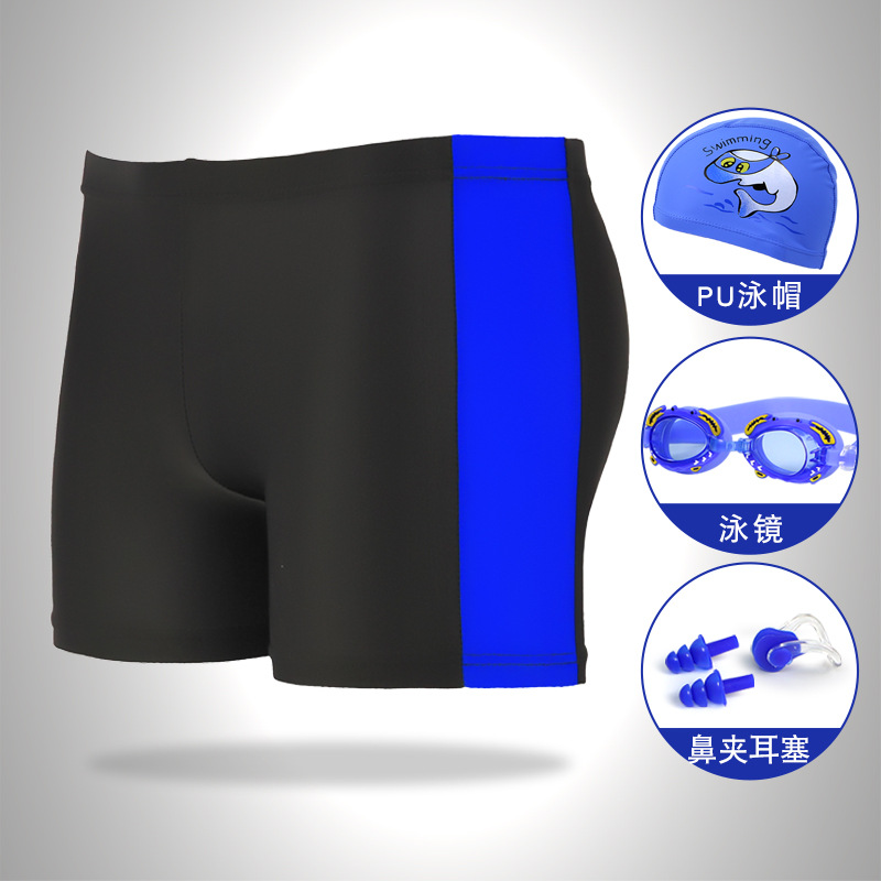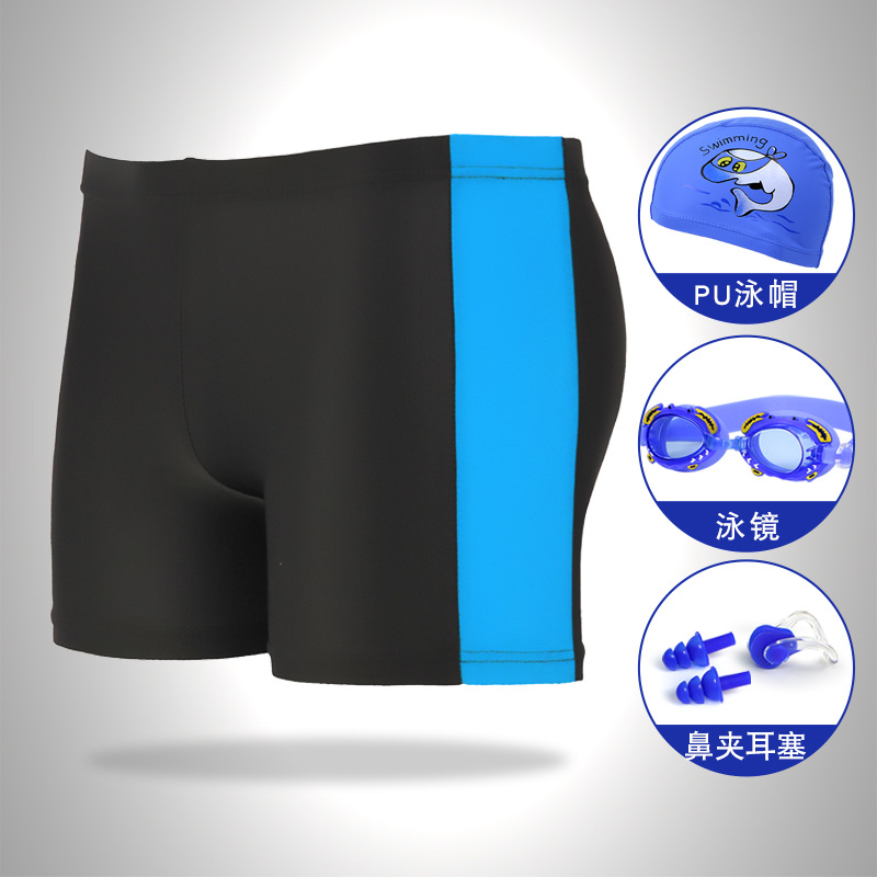 어린이 수영 트렁크 어린이 수영복 2024 간단한 색상 일치 뜨거운 봄 수영 트렁크 수영 고글 수영 모자 세트 도매