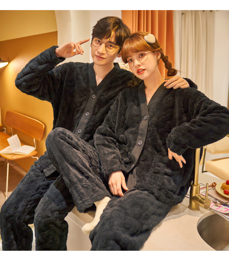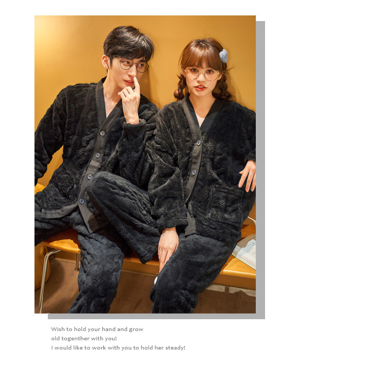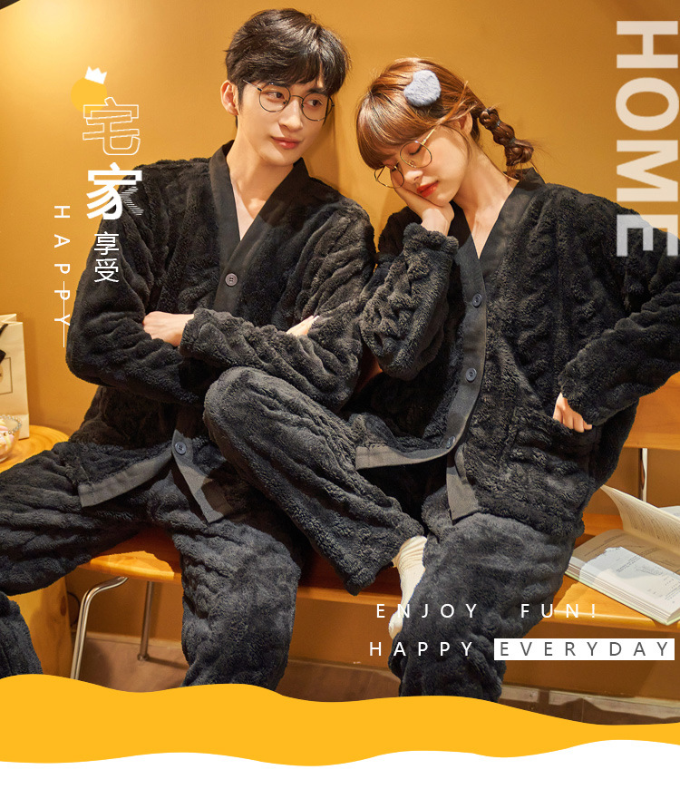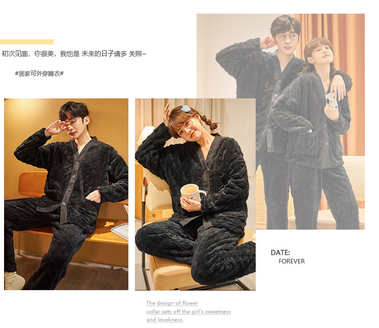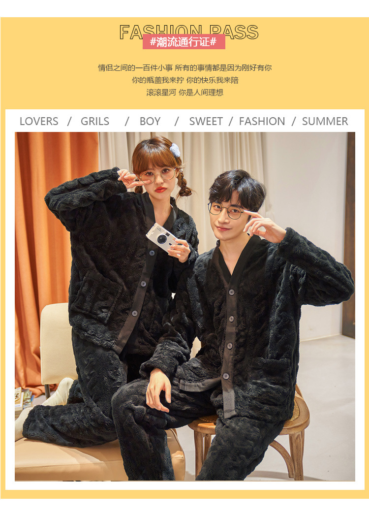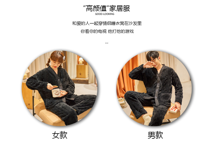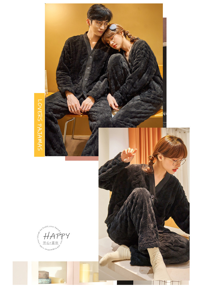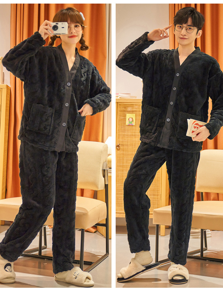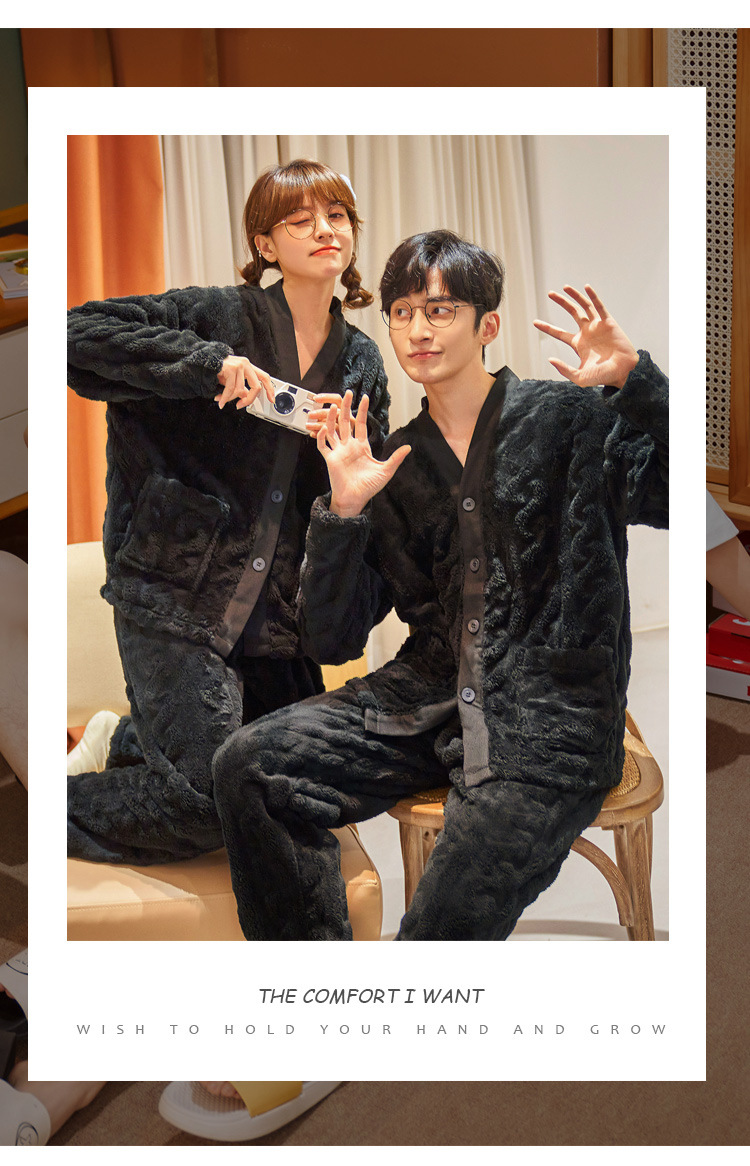 산호 양털 커플 잠옷 여성의 가을과 겨울 간단한 카디건 기모 두꺼운 컷 양털 남자 홈 세트