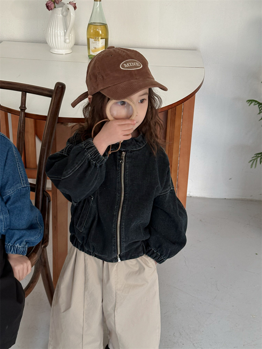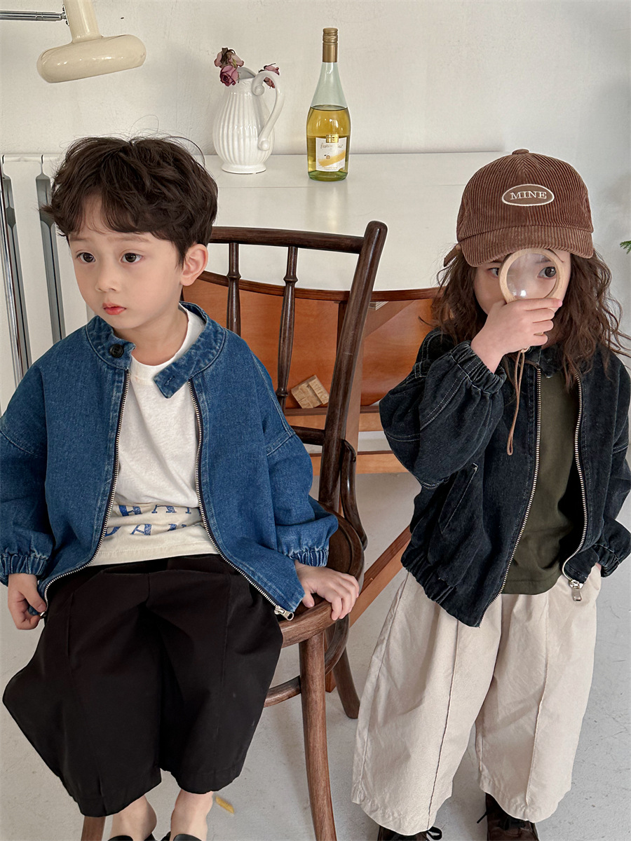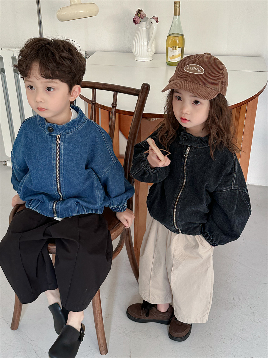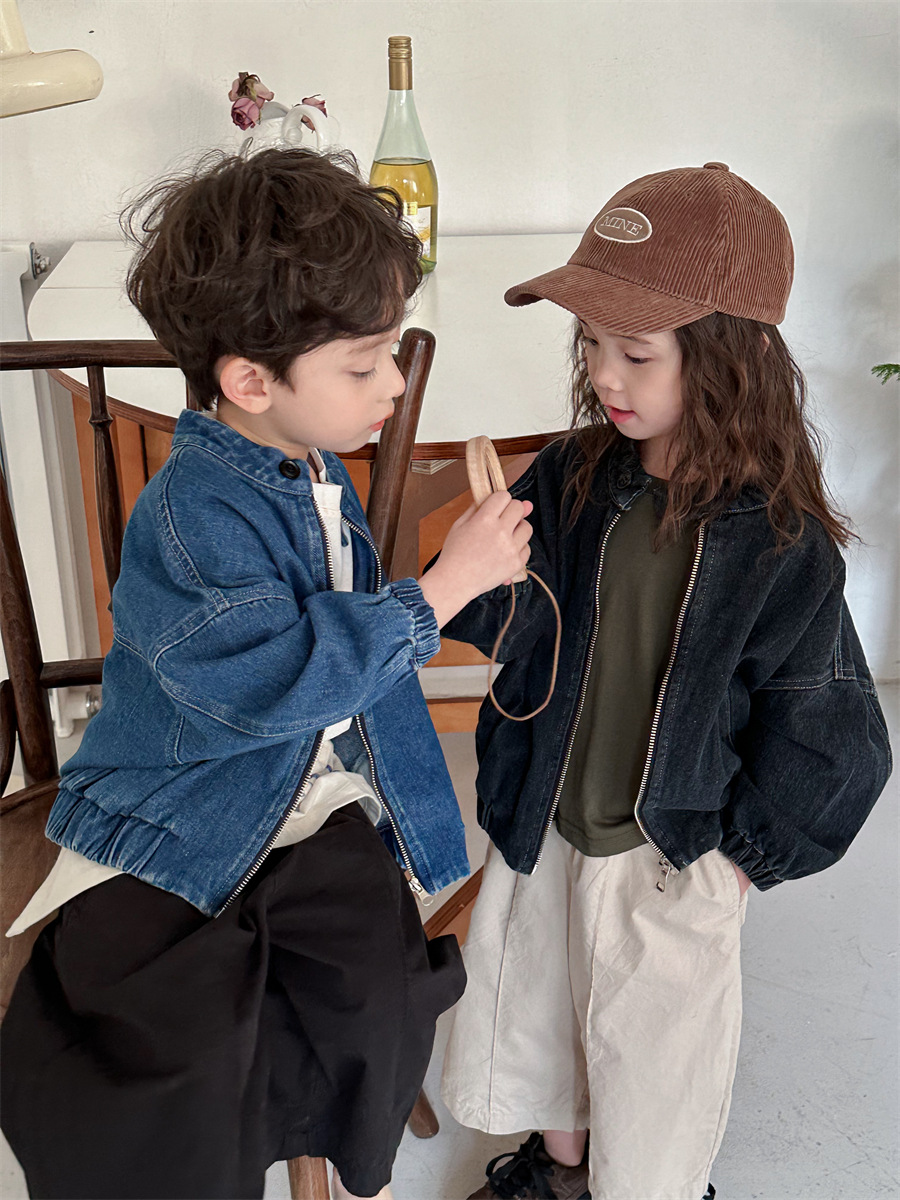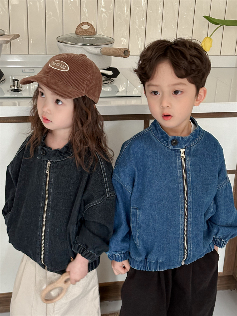 Jiaye 어린이 제품 2025 어린이 봄, 가을 오토바이 스타일 데님 재킷 남성과 여성 아기 다목적 탑 유행 재킷스토어 가기