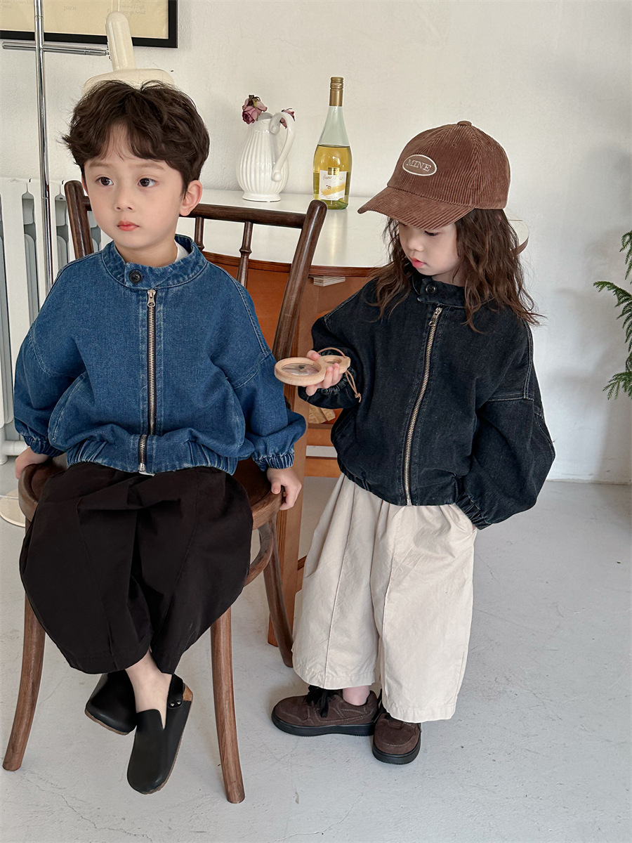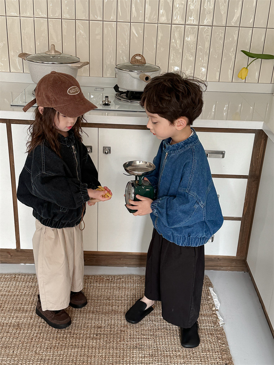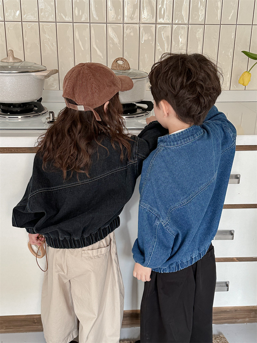 Jiaye 어린이 제품 2025 어린이 봄, 가을 오토바이 스타일 데님 재킷 남성과 여성 아기 다목적 탑 유행 재킷