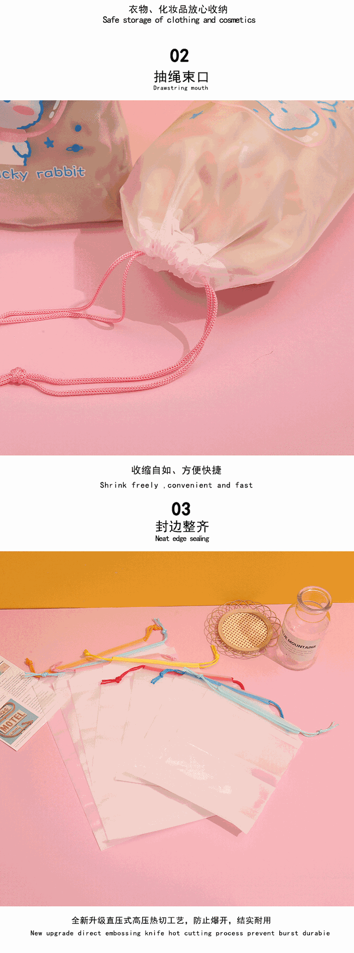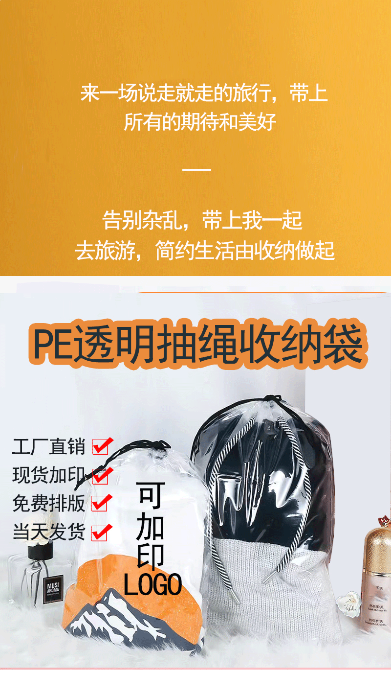 고투명 투명 조임끈 가방, 의류 정리 포장 가방, 플라스틱 PE 조임끈 수납 가방, 도매 여행용 수납 가방
