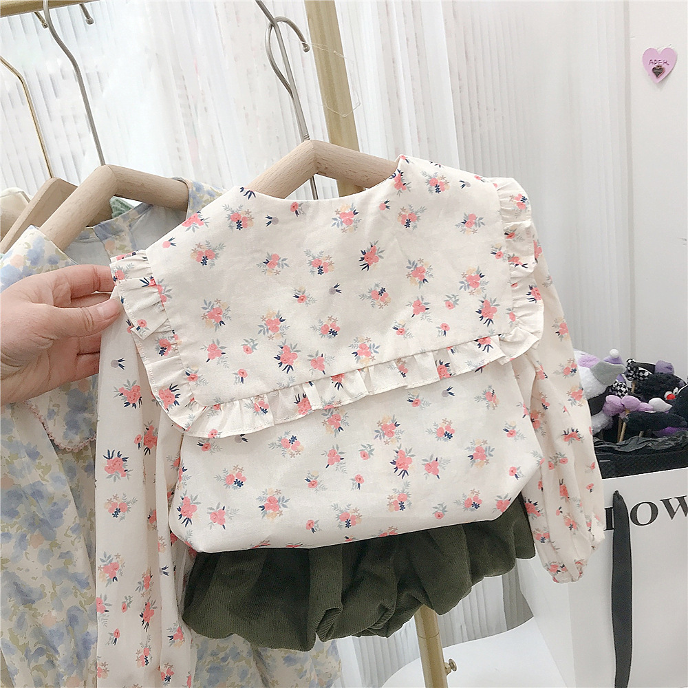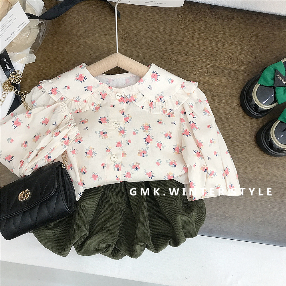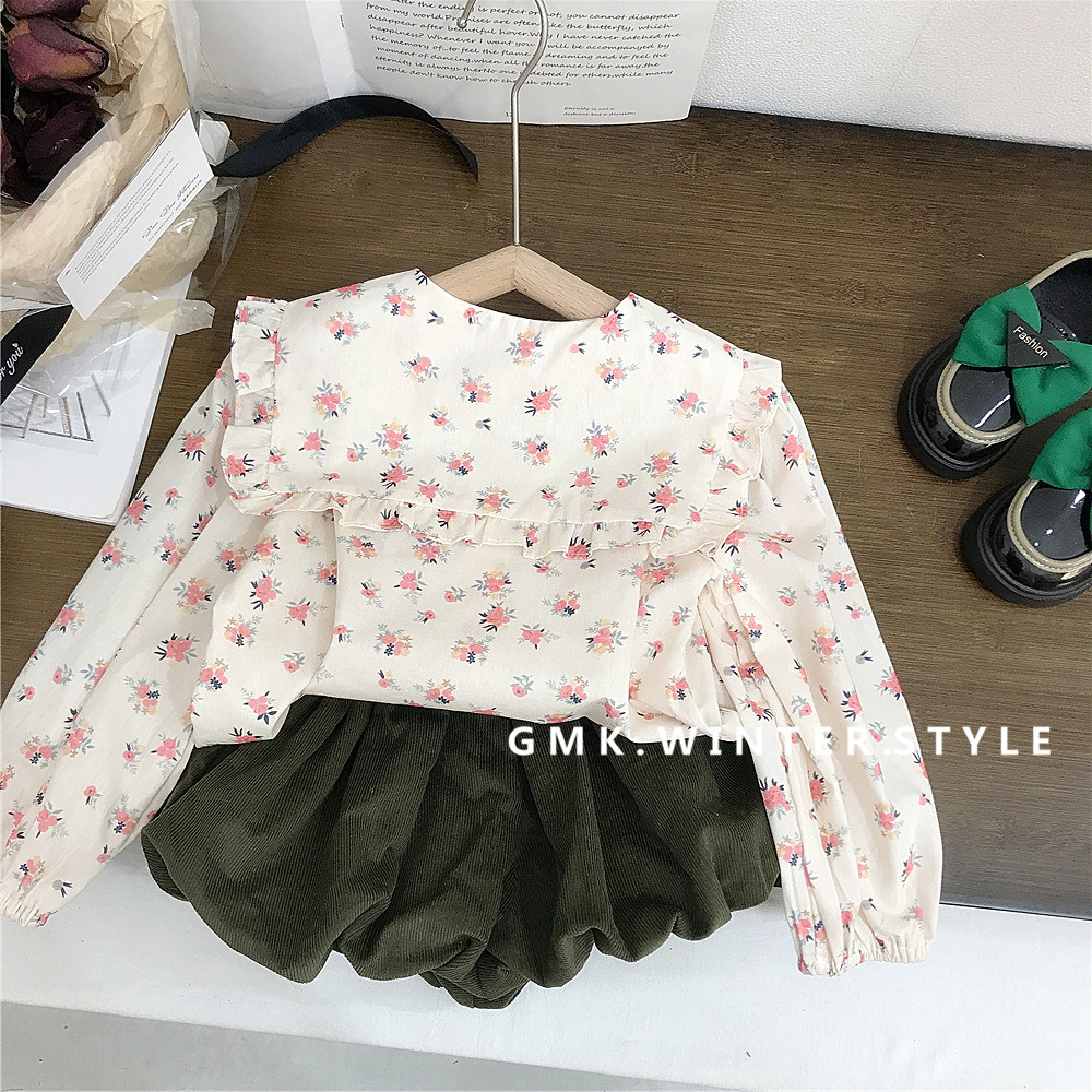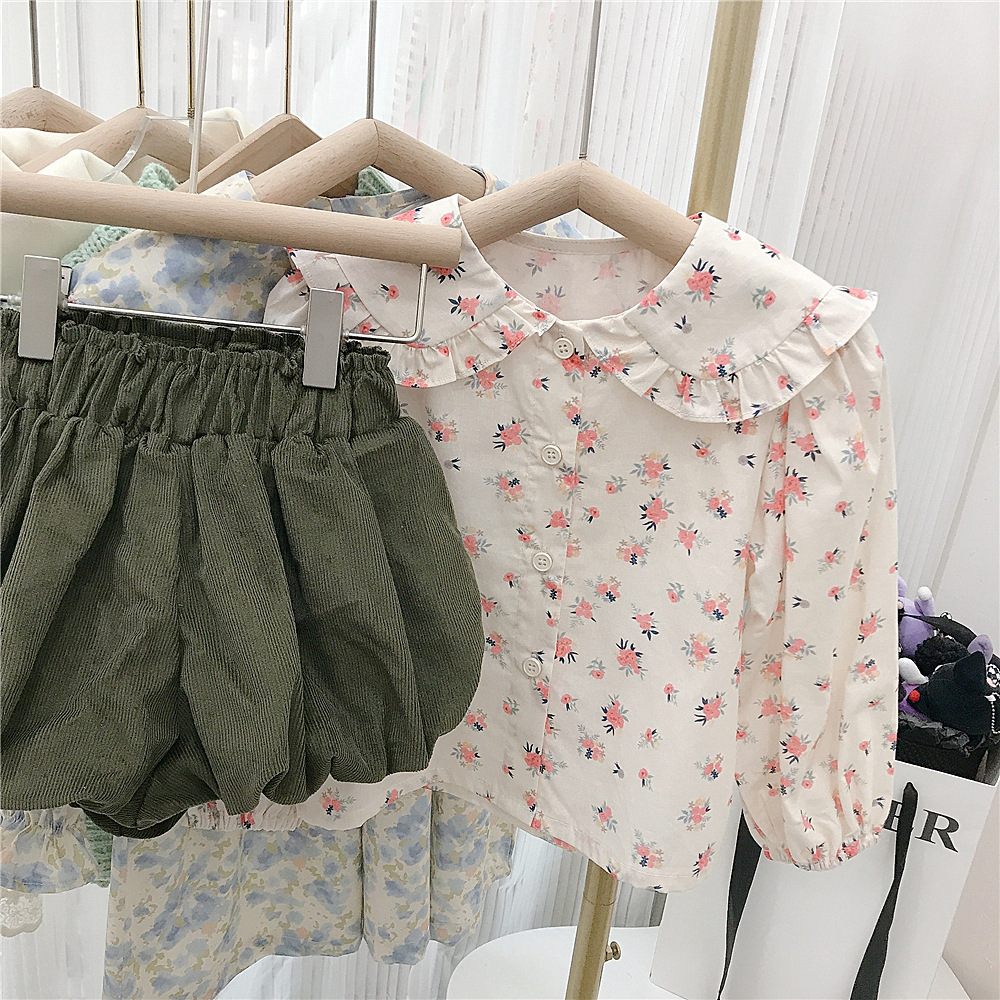 한국식 소녀 꽃 무늬 큰 옷깃 셔츠 봄 새로운 어린이 귀여운 핑크 셔츠 카키 등불 반바지 대외 무역
