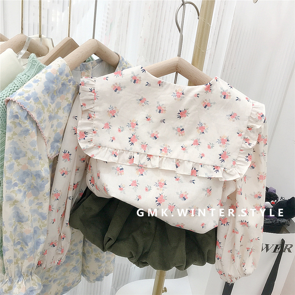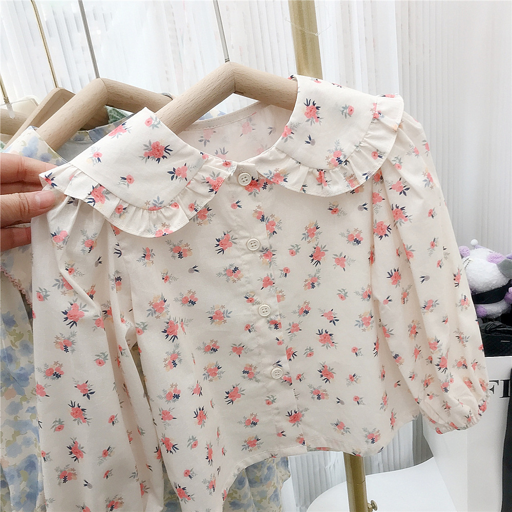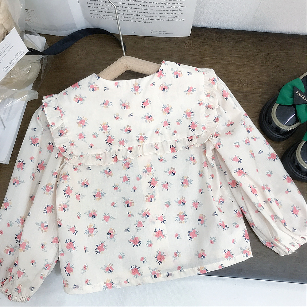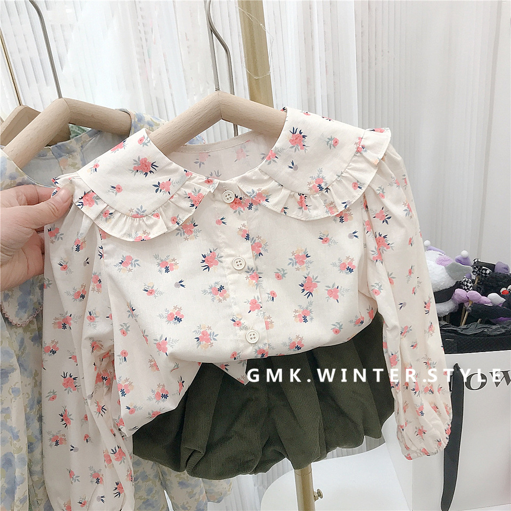 한국식 소녀 꽃 무늬 큰 옷깃 셔츠 봄 새로운 어린이 귀여운 핑크 셔츠 카키 등불 반바지 대외 무역
