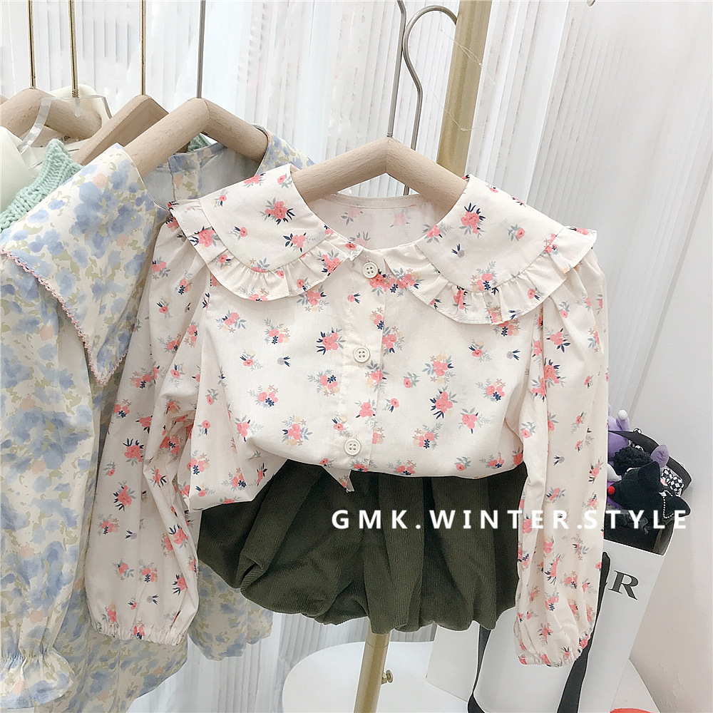 한국식 소녀 꽃 무늬 큰 옷깃 셔츠 봄 새로운 어린이 귀여운 핑크 셔츠 카키 등불 반바지 대외 무역스토어 가기