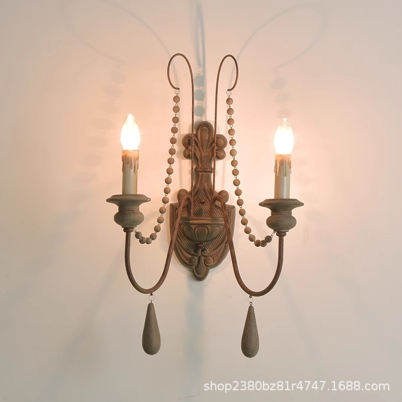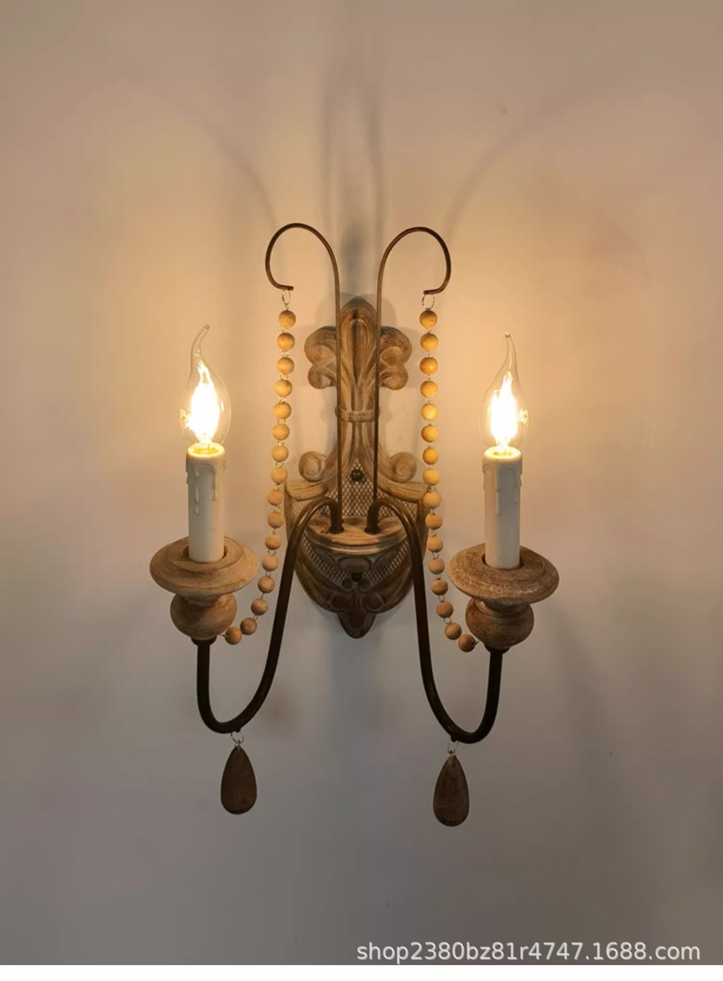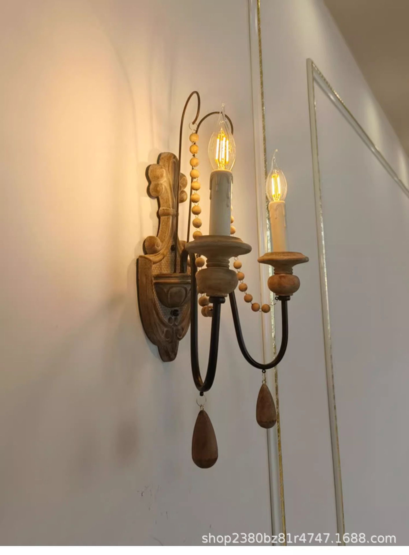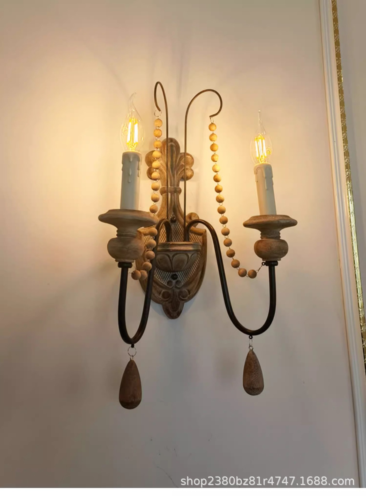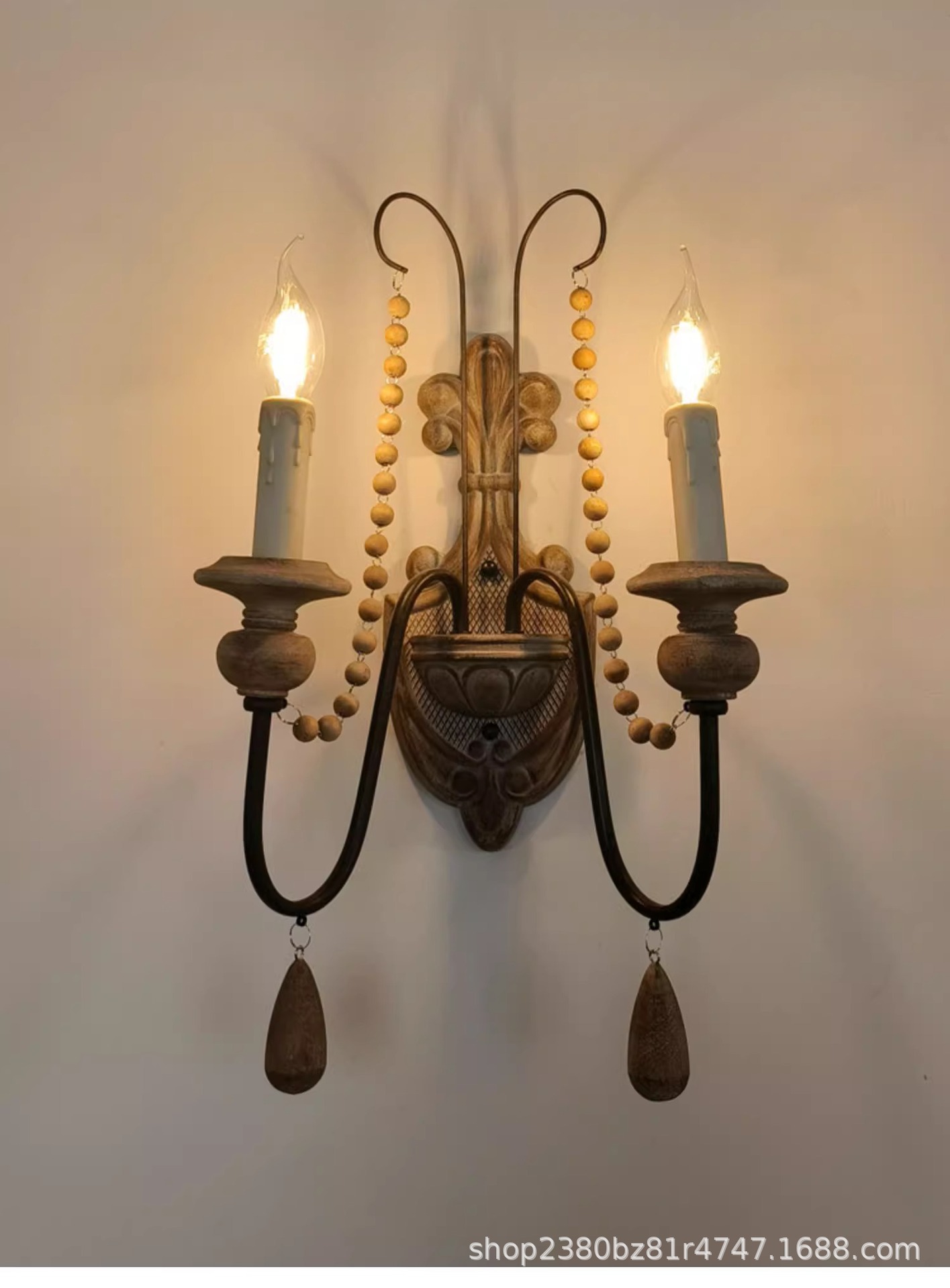 미국식 시골 목공예 조명 거실 벽등 복도 레트로 프렌치 모델룸 더블 헤드 캔들 벽등 LED 조명