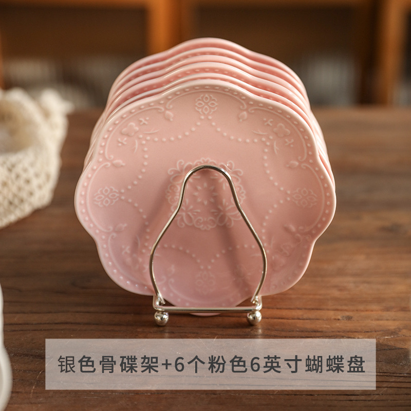 • 실버 뼈 접시 랙 + 6 핑크 6 인치 나비 플레이트