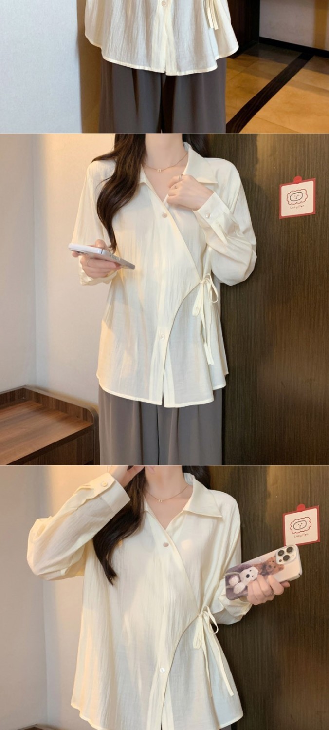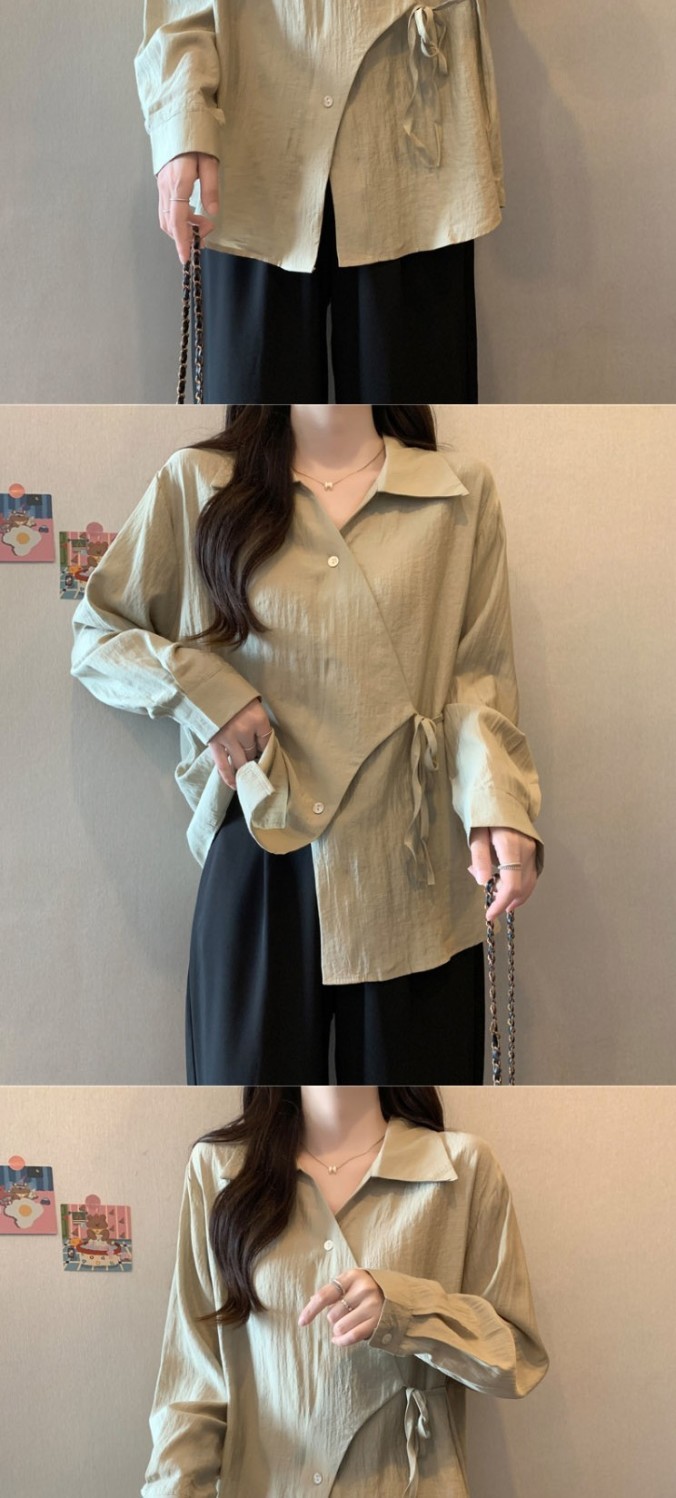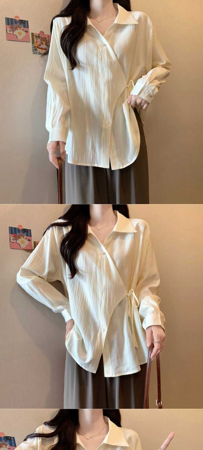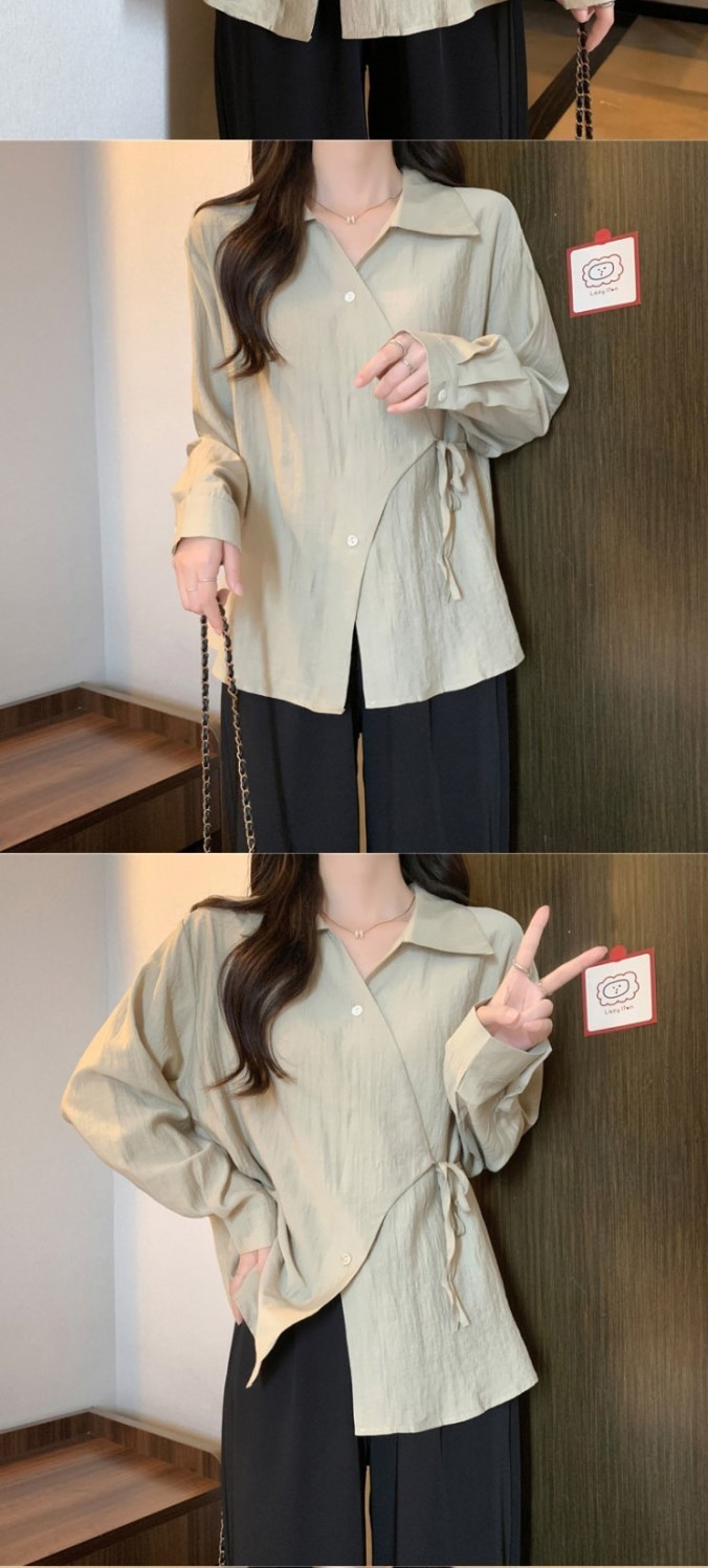 불규칙한 디자인 레이스 업 긴팔 셔츠 여성의 봄과 가을 큰 크기 슬리밍 통통한 소녀를위한 느슨한 배 덮개 탑