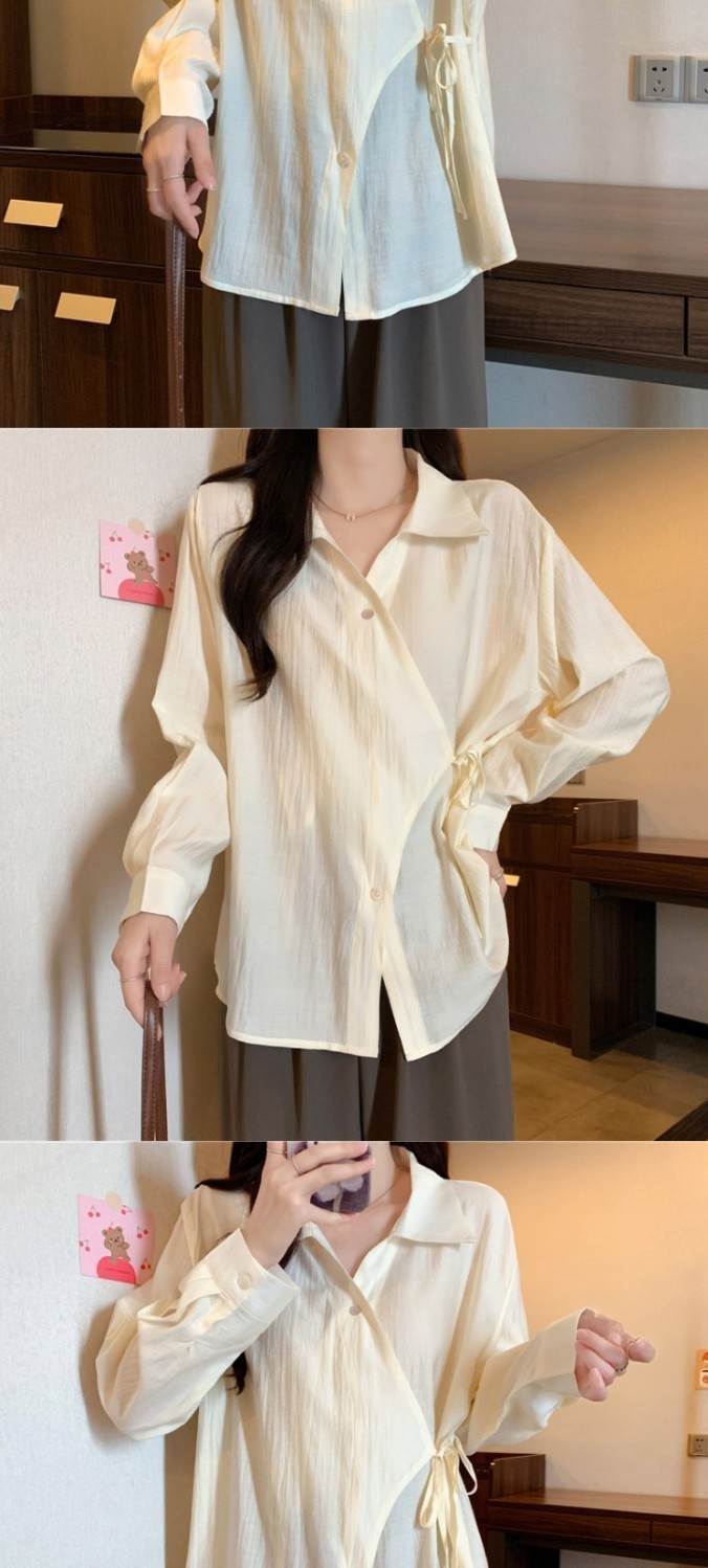 불규칙한 디자인 레이스 업 긴팔 셔츠 여성의 봄과 가을 큰 크기 슬리밍 통통한 소녀를위한 느슨한 배 덮개 탑스토어 가기