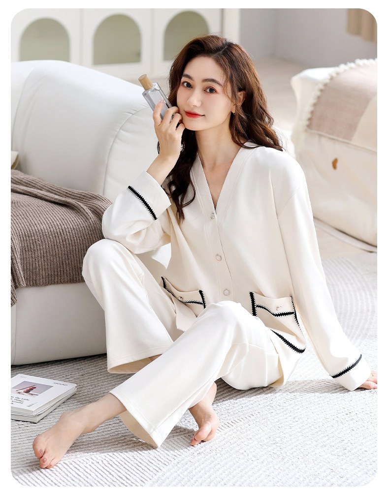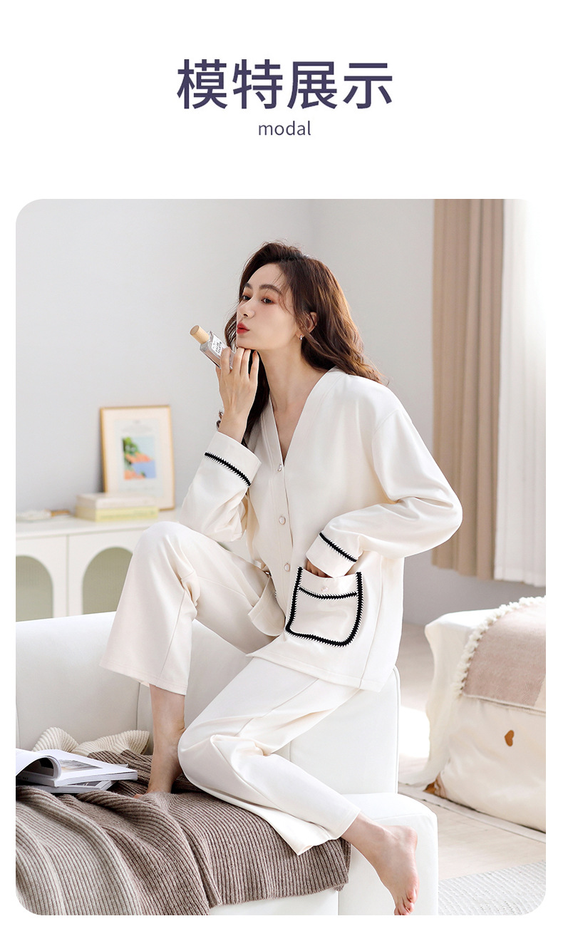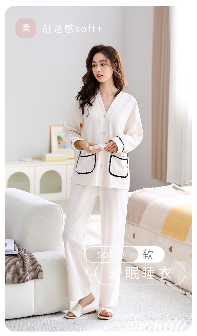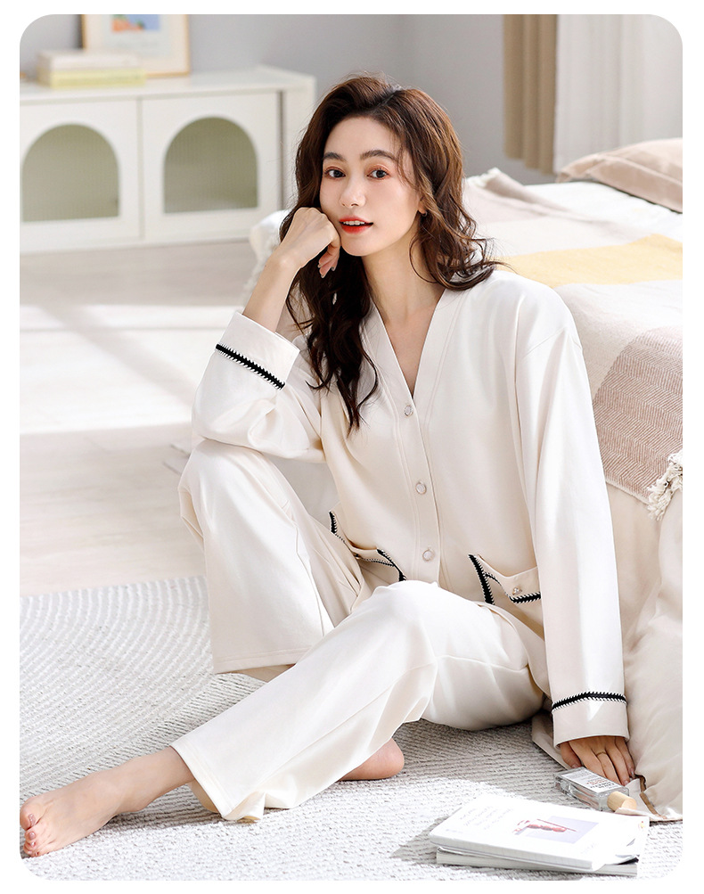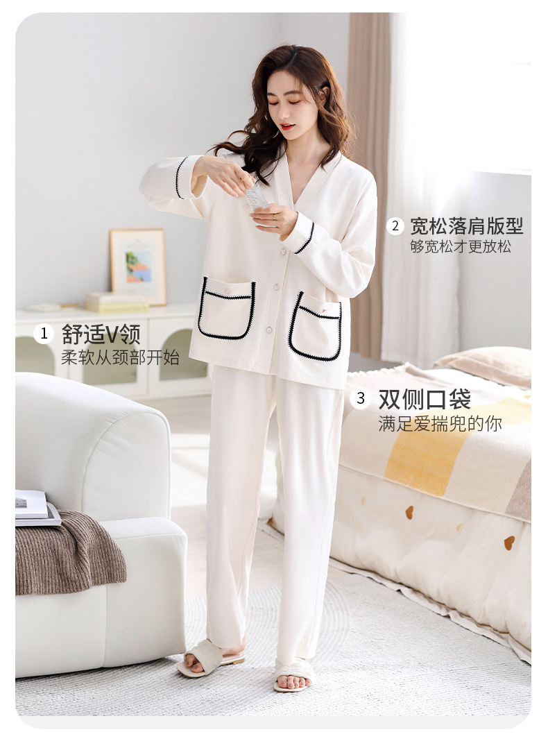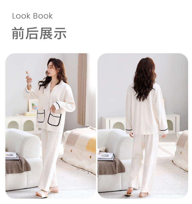 잠옷 여성의 봄과 가을면 얇은 긴 소매 봄과 여름 V 넥 화이트 사교계 스타일의 고급 가정복 세트스토어 가기