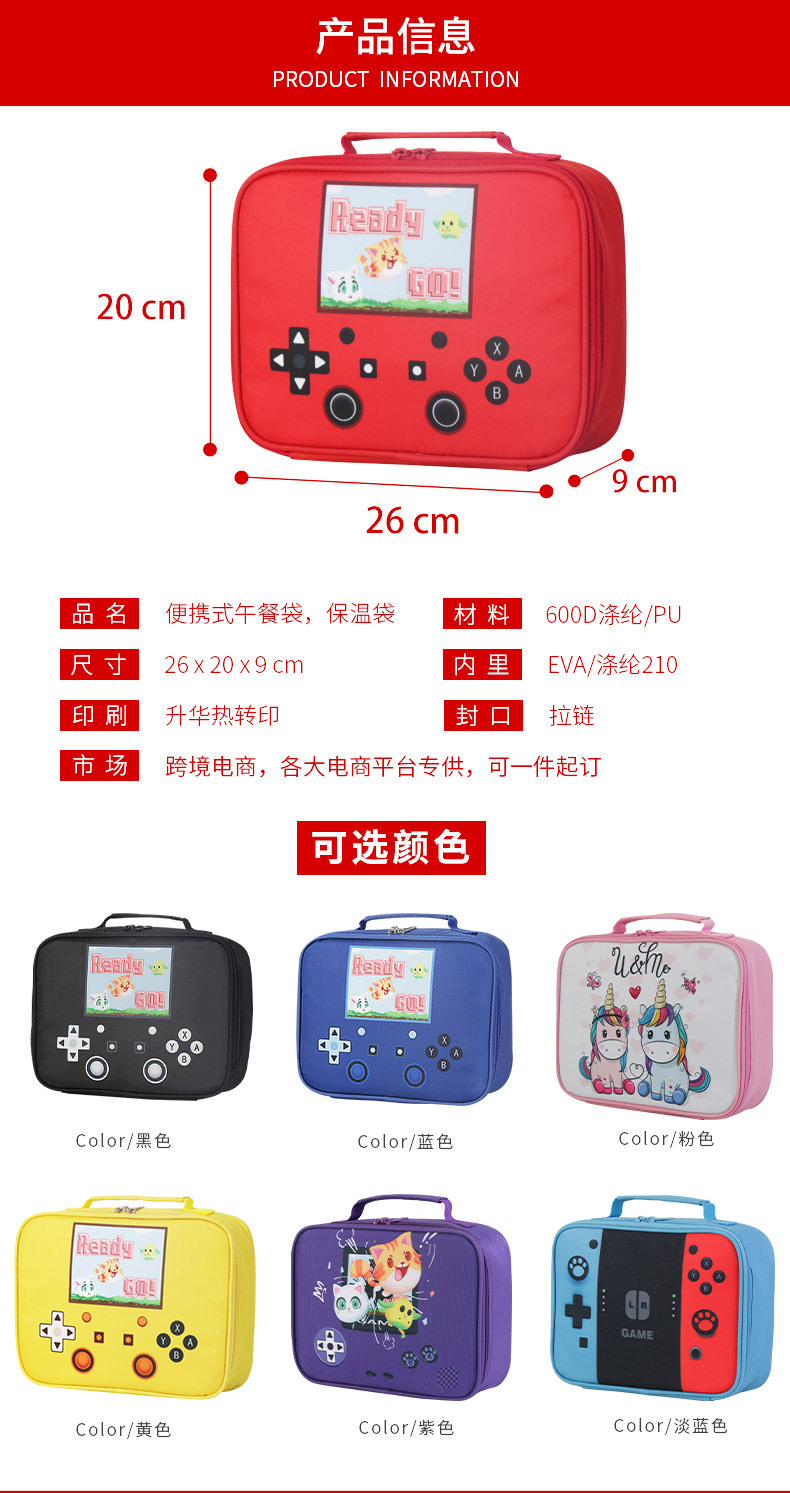 时尚潮流热转印,炫酷7种颜色可供选择,支持DIY私人专属,团体活动、LOGO图案定做,可以卡通、萌趣、运动、动物、动漫、游戏周边、文艺小清晰、跨境欧美风潮,满足了不同年龄在不同场所的搭配需求。大空间,轻盈铝膜控温设计,锁温锁暖顺滑拉链一步到位,能装得下你的精彩小世界。也支持产品贴标、内部结构包身尺寸的更改,特殊包装需求,都可直接电联或咨询我们客服,一对一服务,满足您多元化的定制需求。