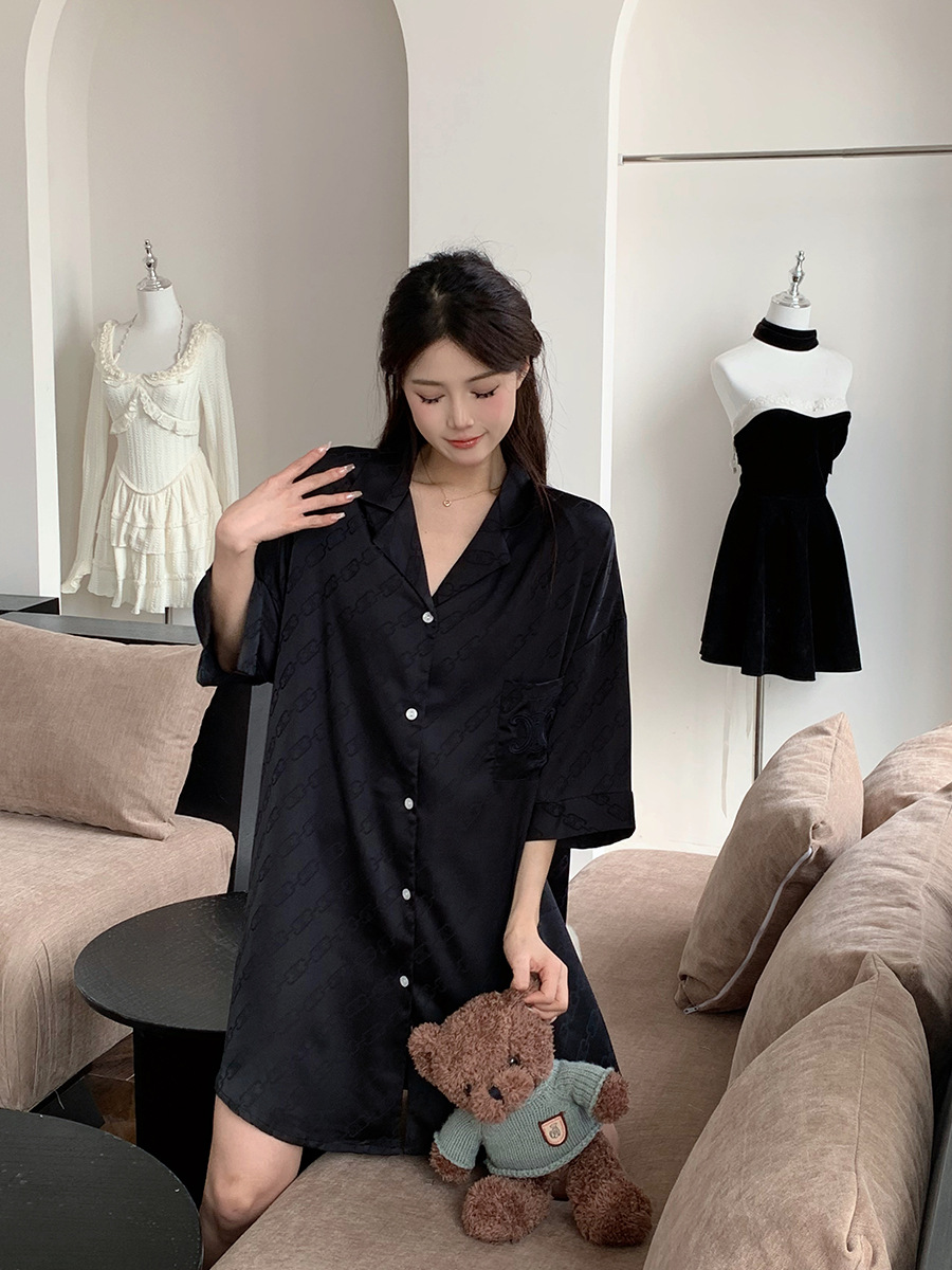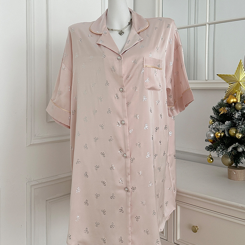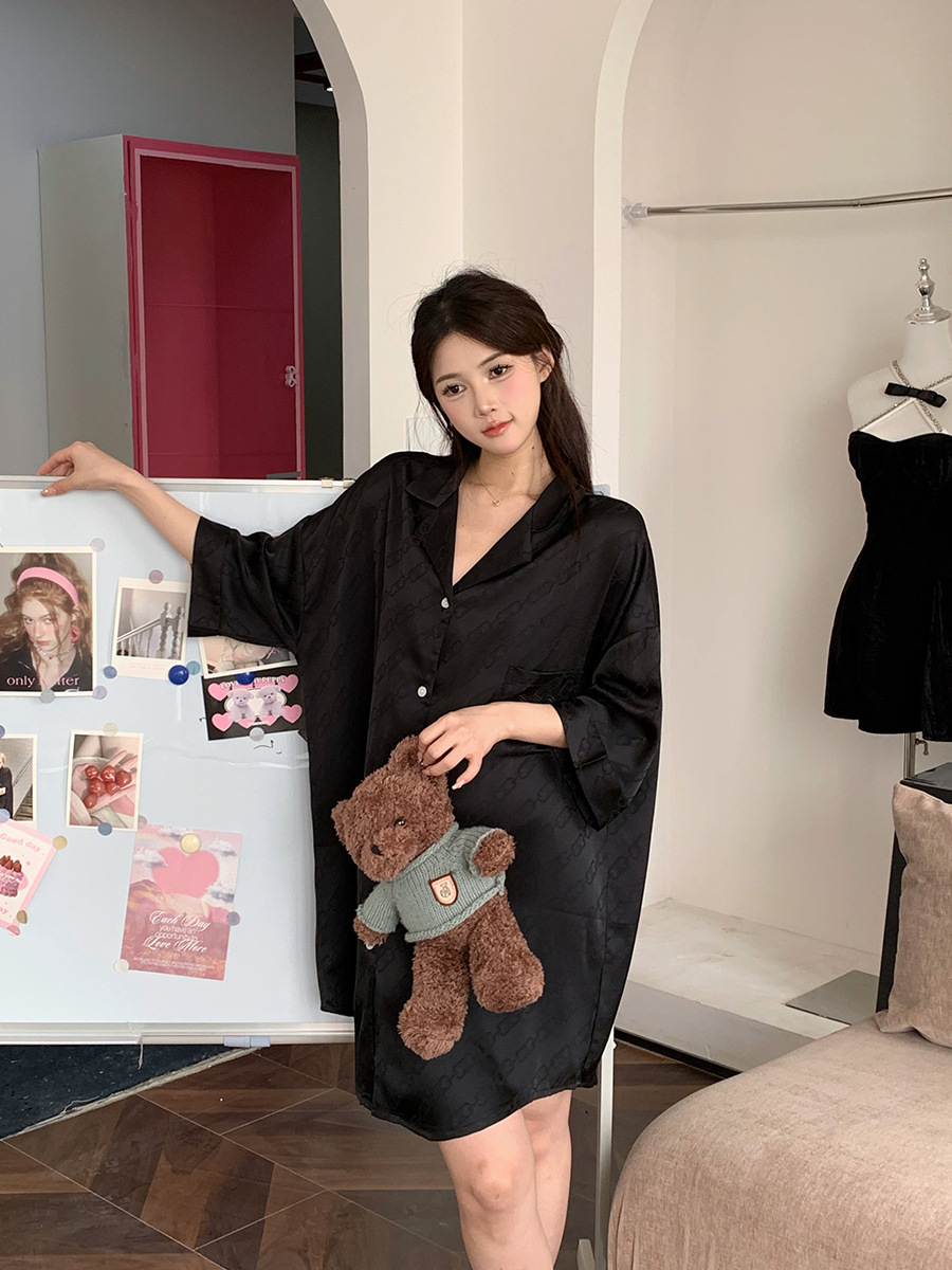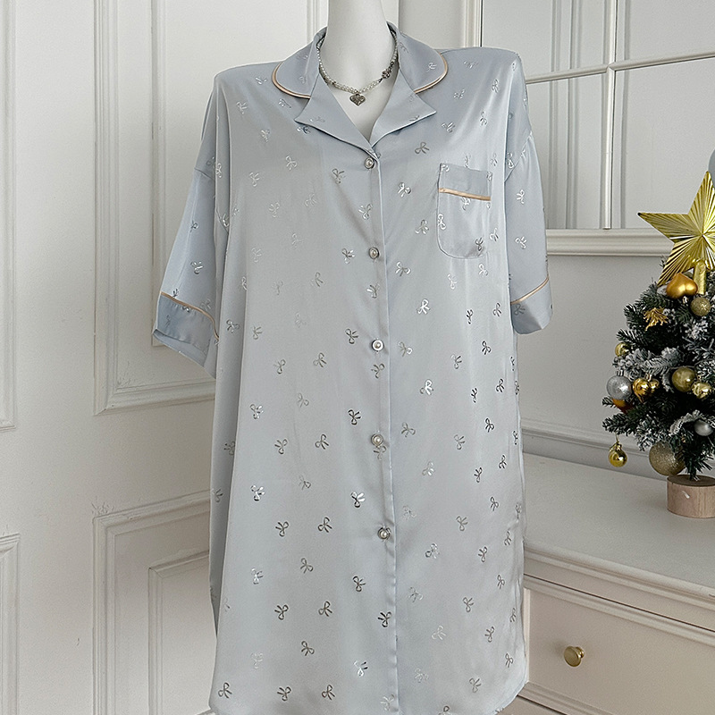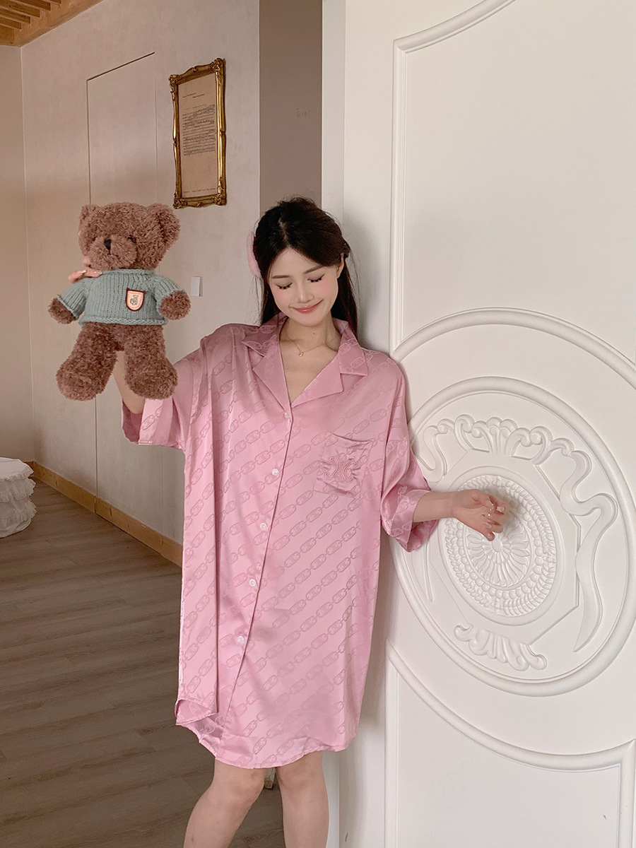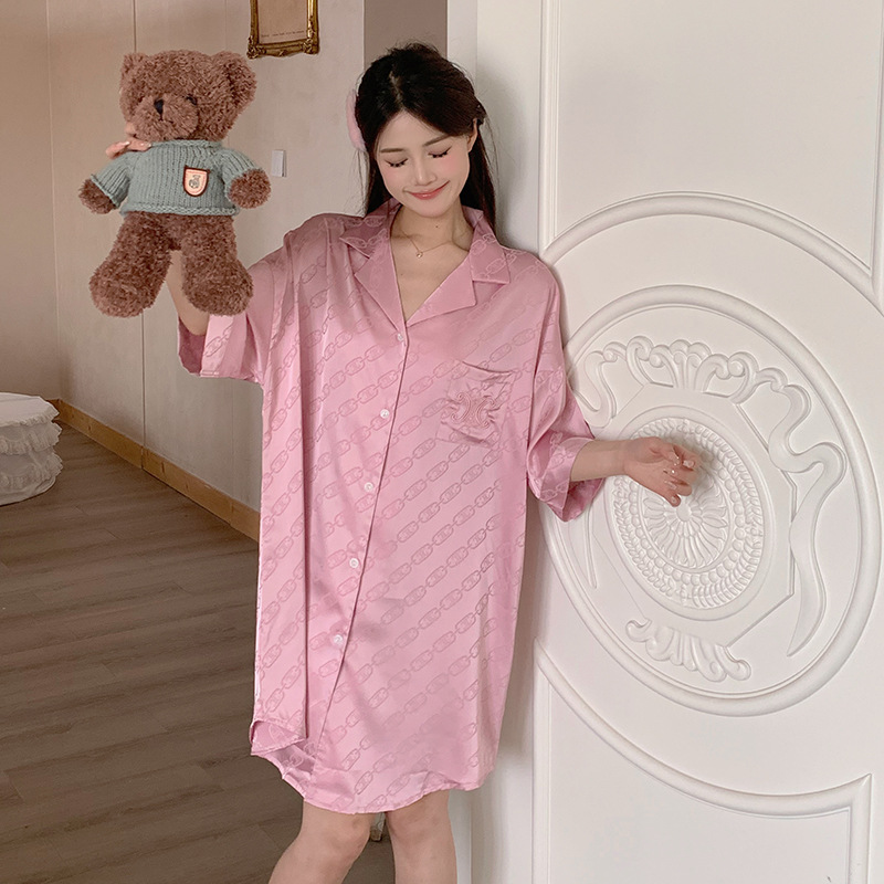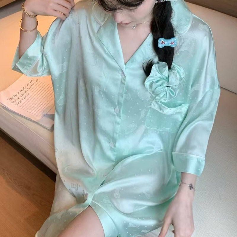 한국식 심플한 스타일 셔츠 원피스 잠옷 여성 실크 긴소매 봄과 여름 가정복 세트 도매스토어 가기