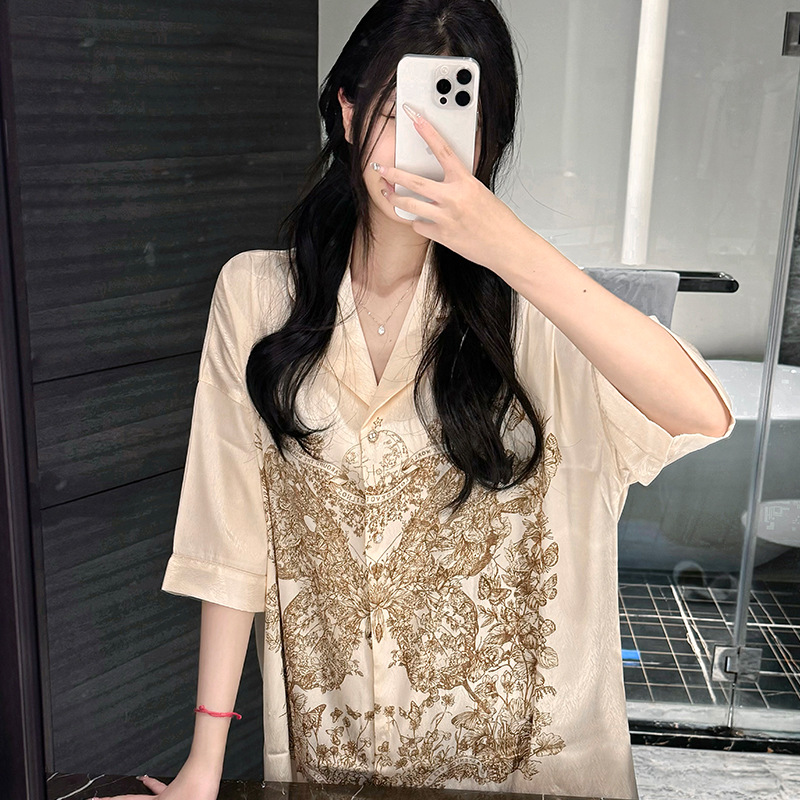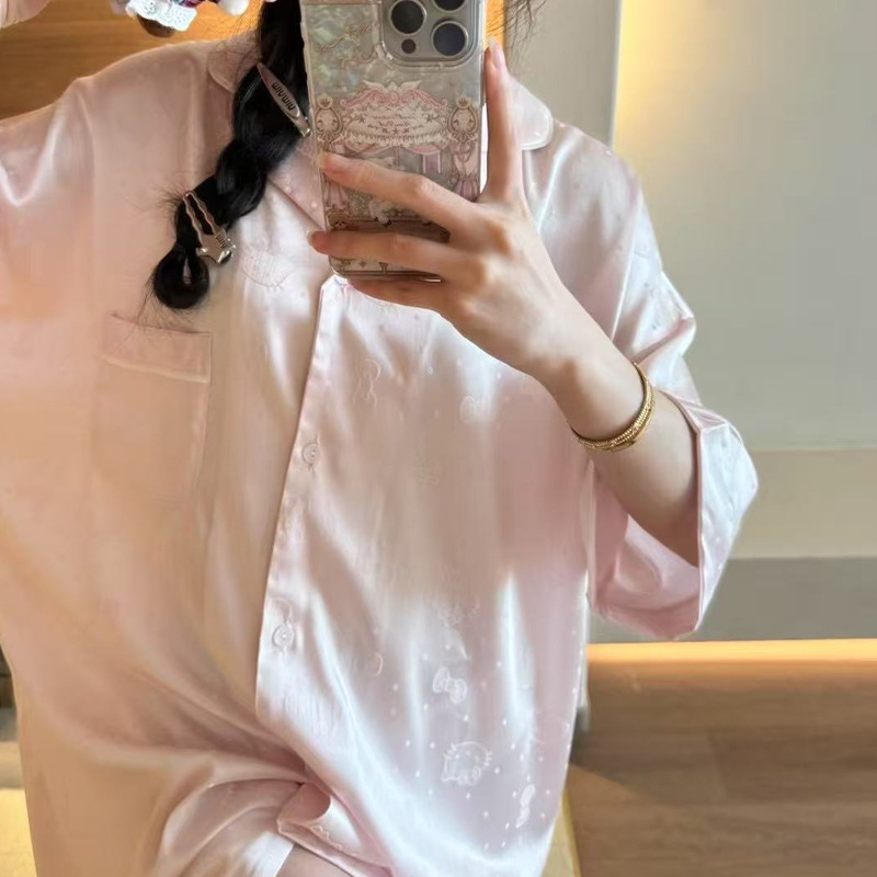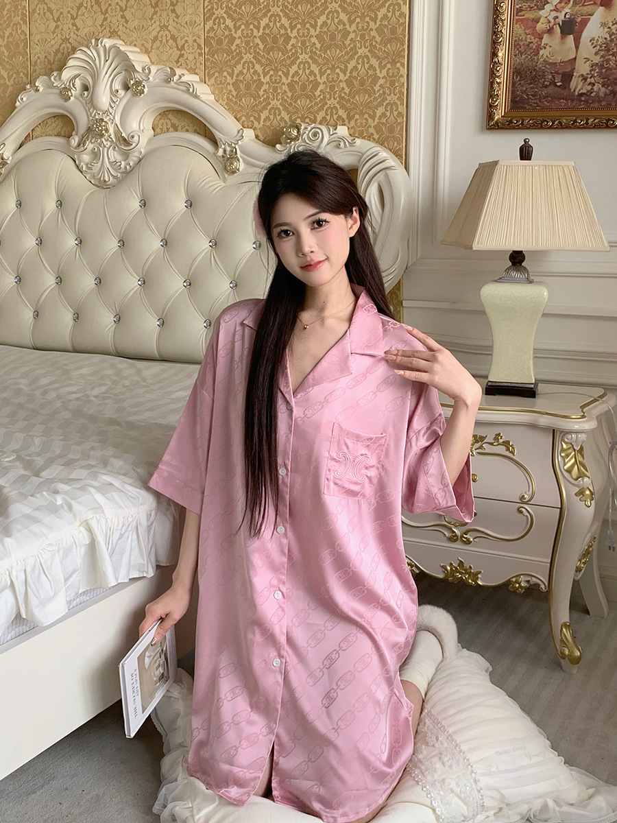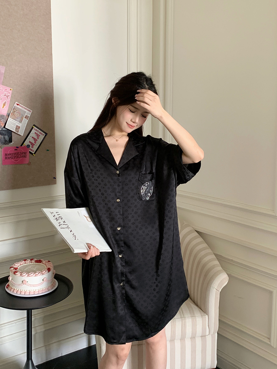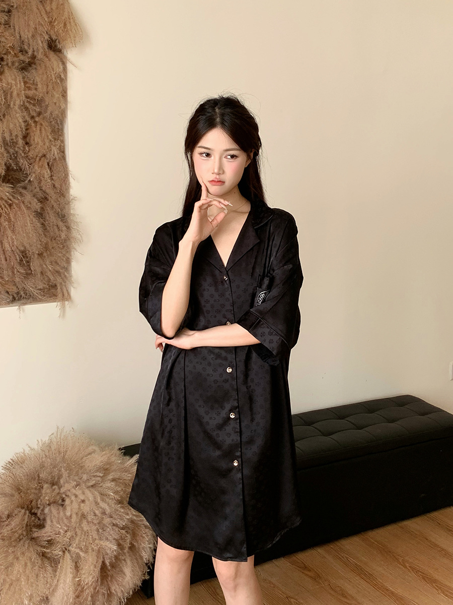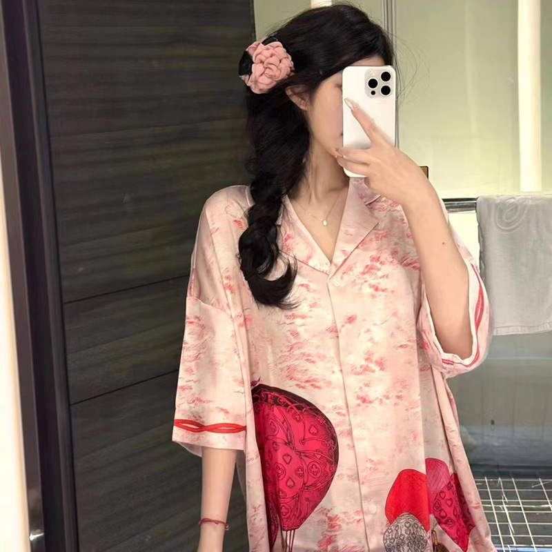한국식 심플한 스타일 셔츠 원피스 잠옷 여성 실크 긴소매 봄과 여름 가정복 세트 도매스토어 가기