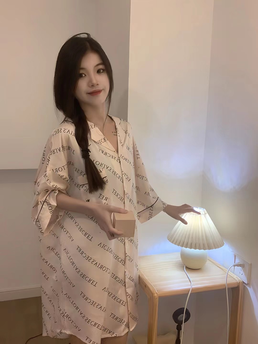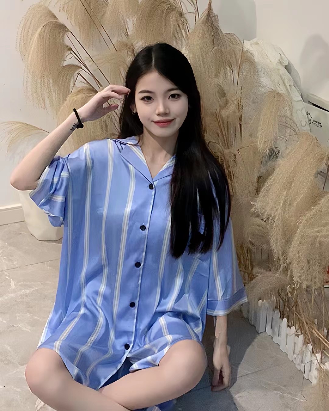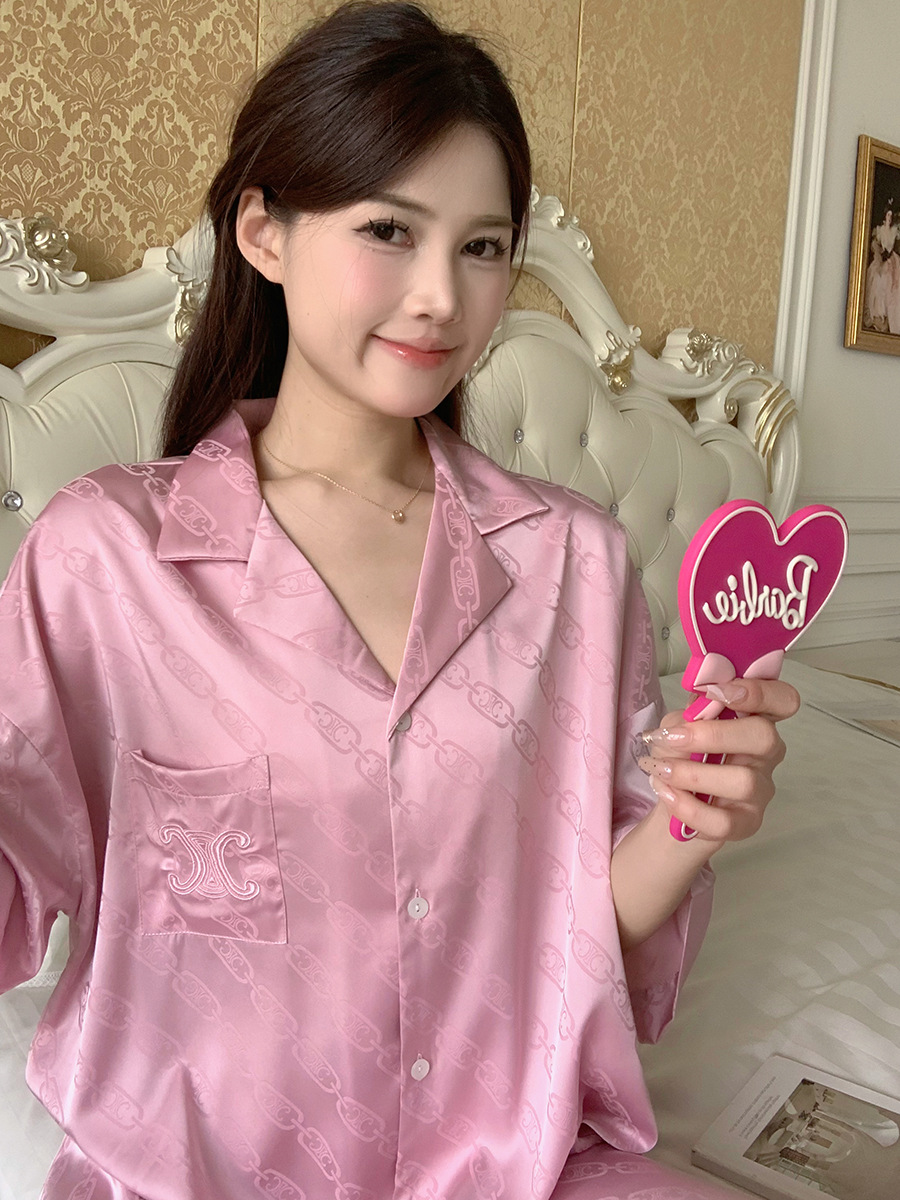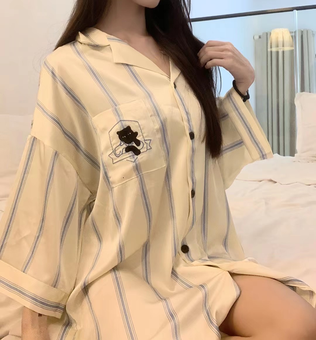 한국식 심플한 스타일 셔츠 원피스 잠옷 여성 실크 긴소매 봄과 여름 가정복 세트 도매스토어 가기