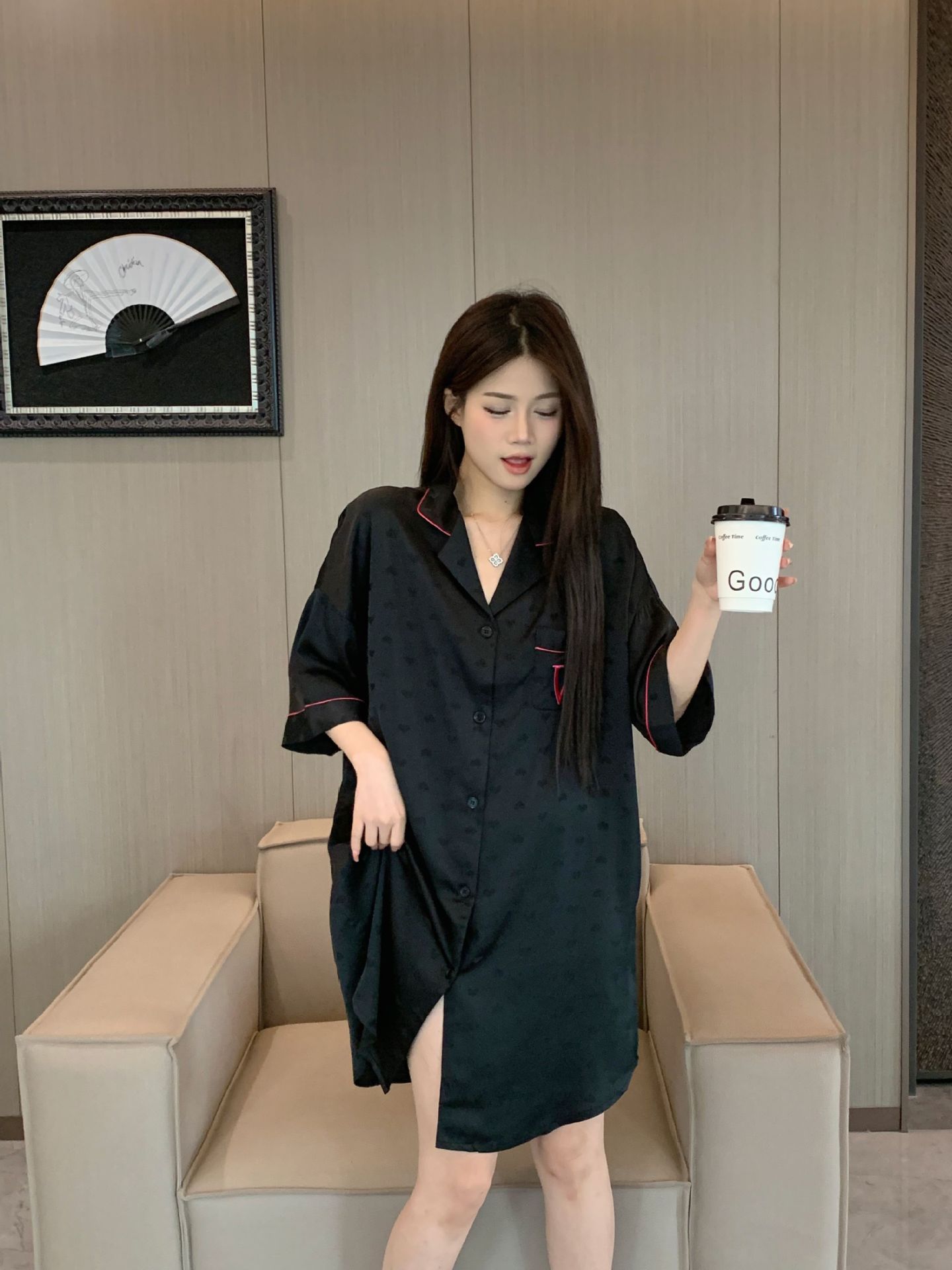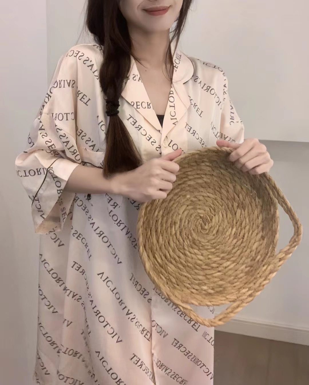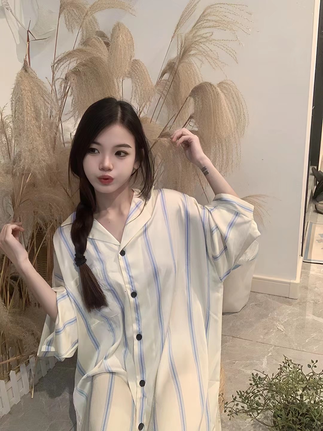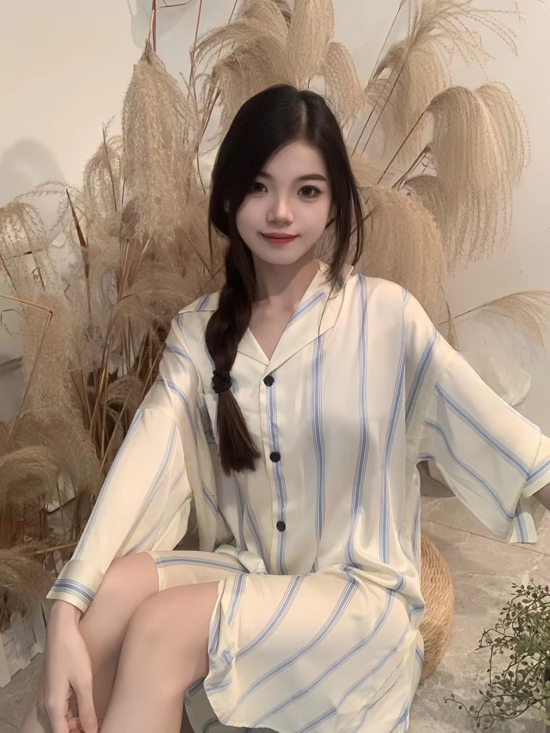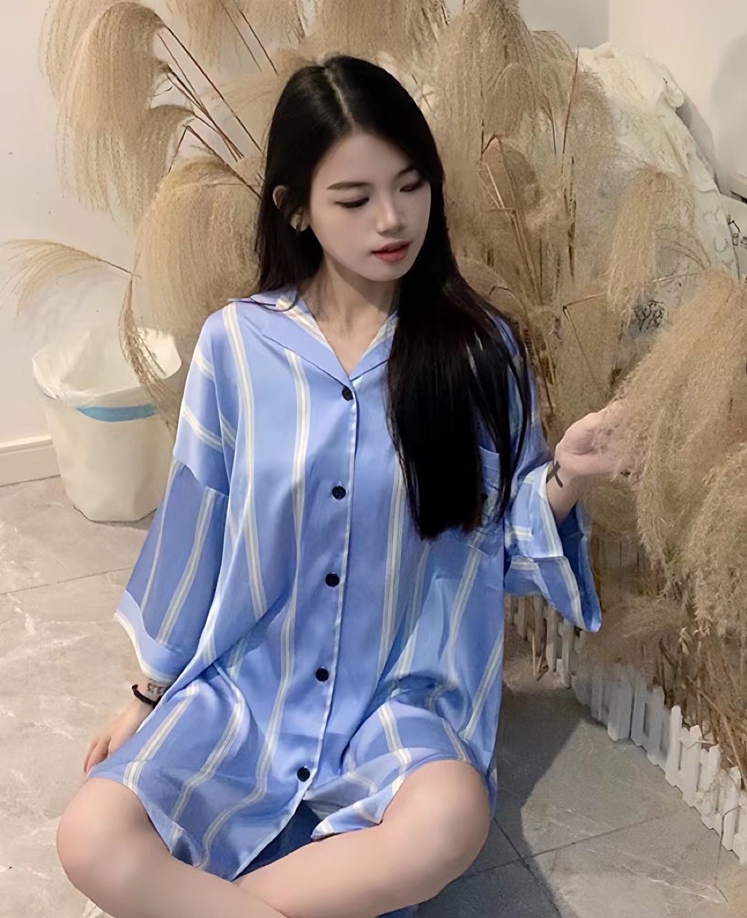 한국식 심플한 스타일 셔츠 원피스 잠옷 여성 실크 긴소매 봄과 여름 가정복 세트 도매스토어 가기