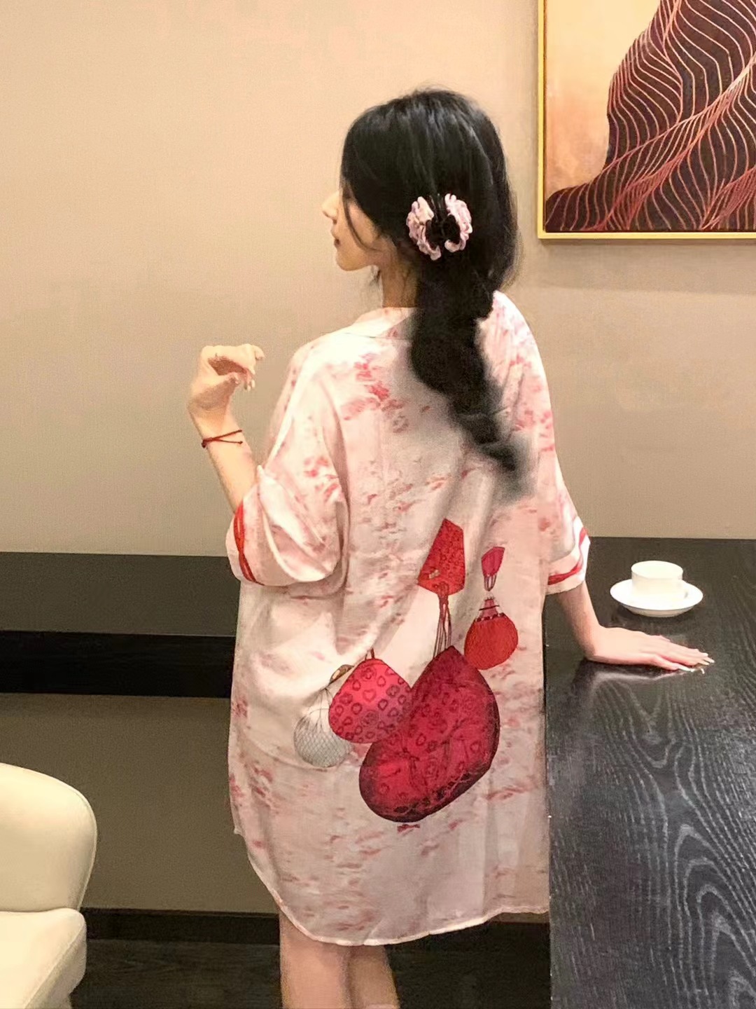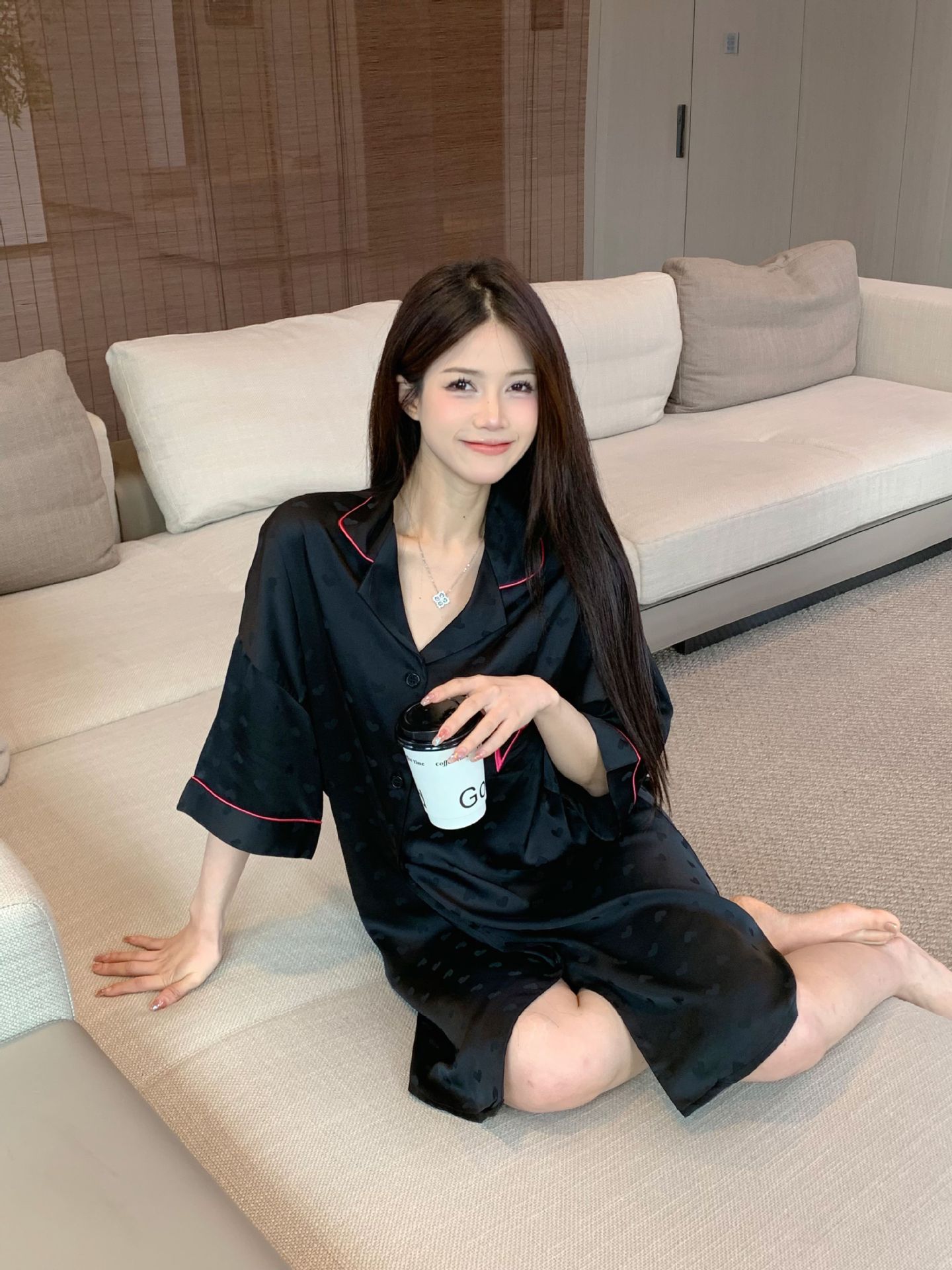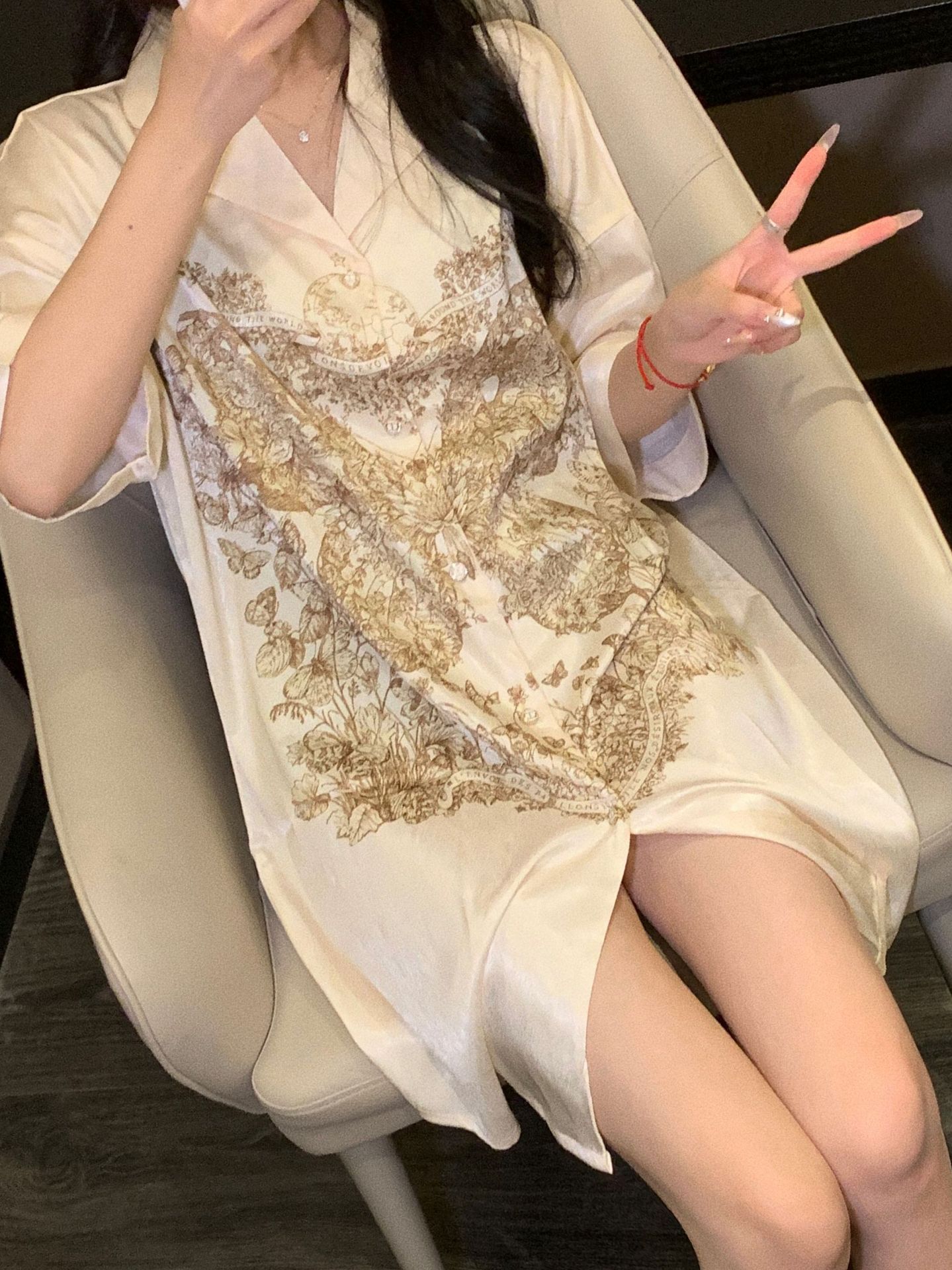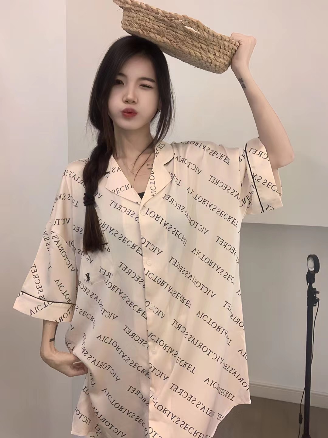 한국식 심플한 스타일 셔츠 원피스 잠옷 여성 실크 긴소매 봄과 여름 가정복 세트 도매스토어 가기