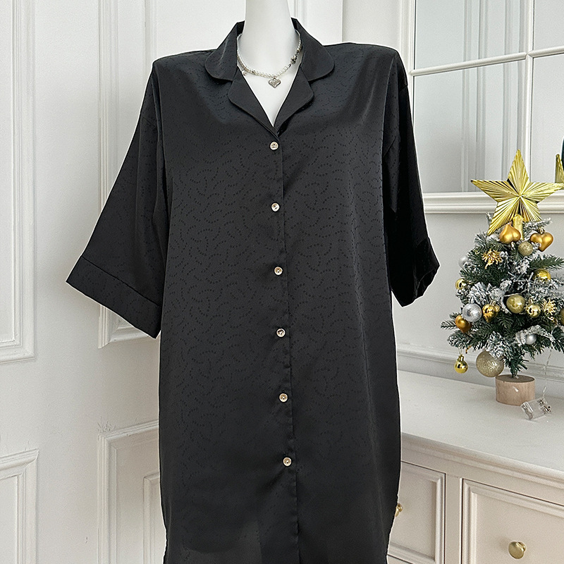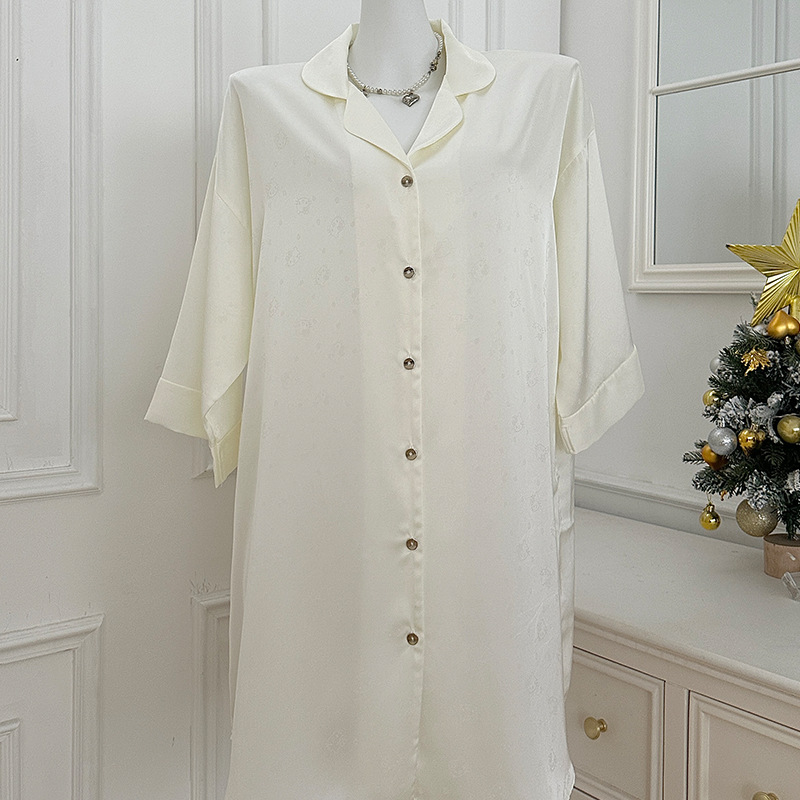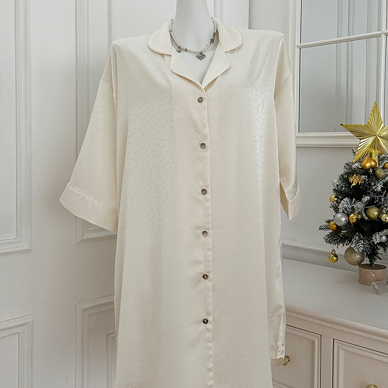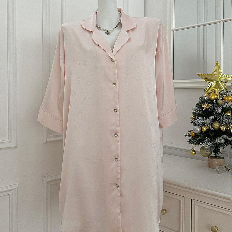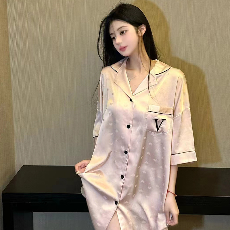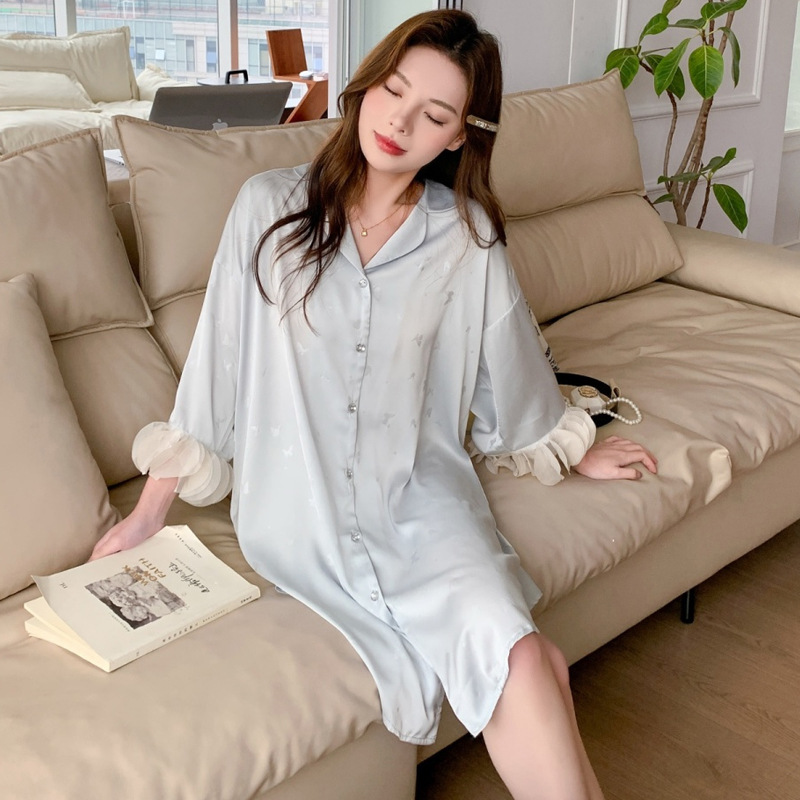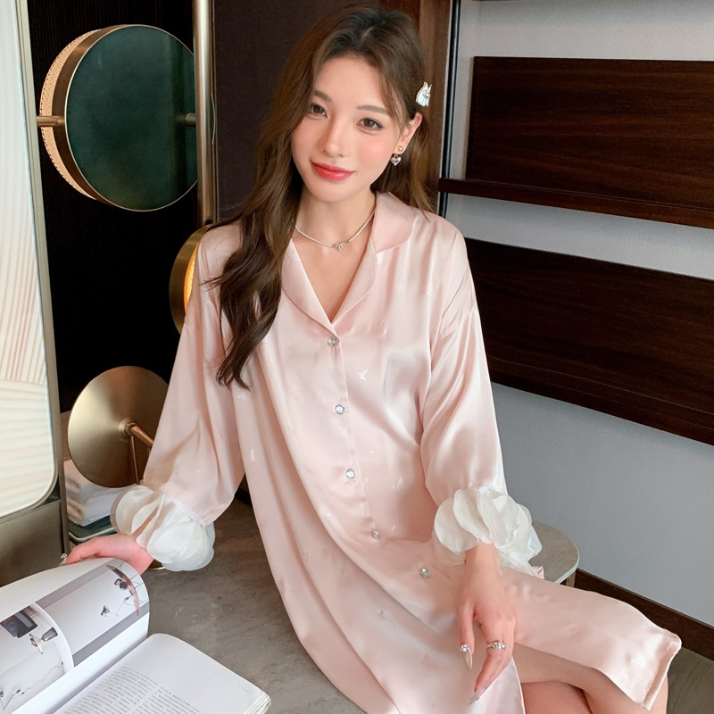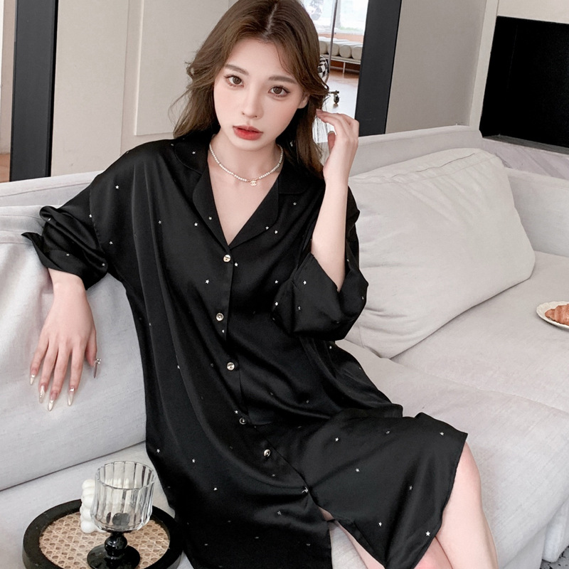 한국식 심플한 스타일 셔츠 원피스 잠옷 여성 실크 긴소매 봄과 여름 가정복 세트 도매