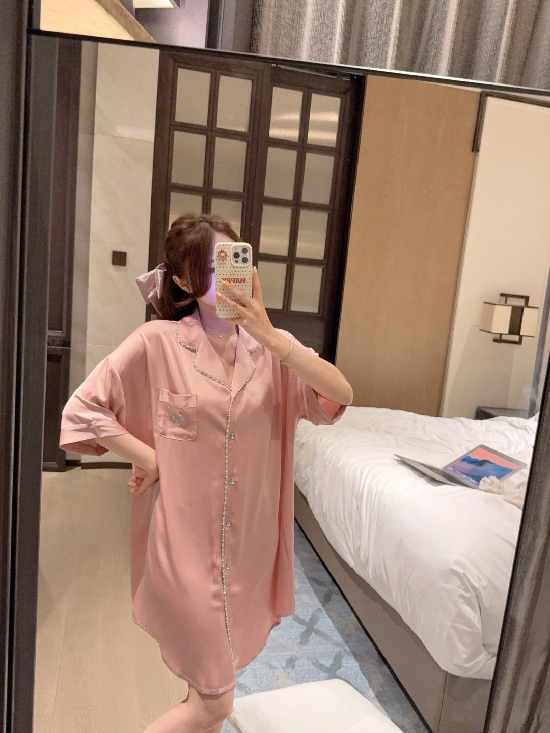 • 핫 실버 보우 핑크 셔츠 드레스