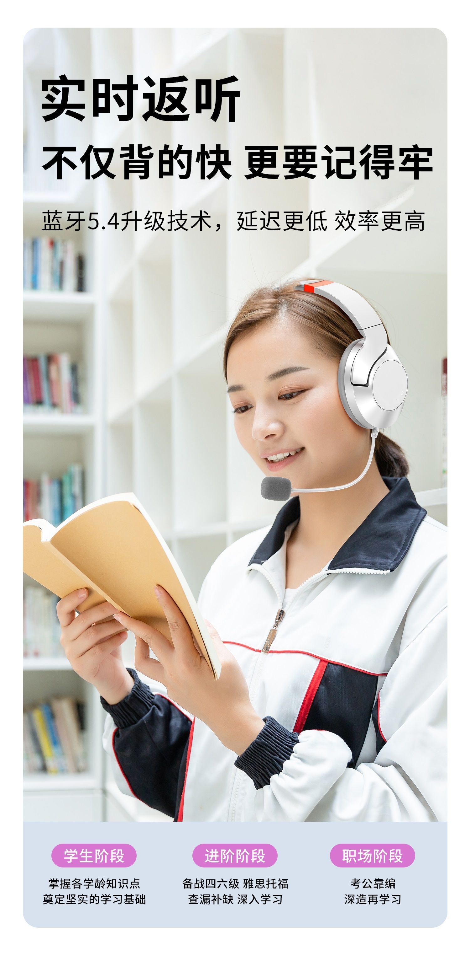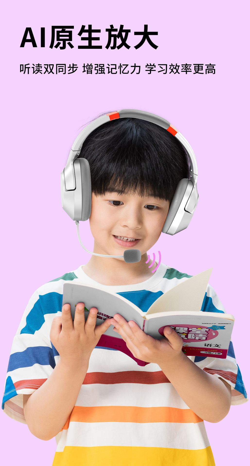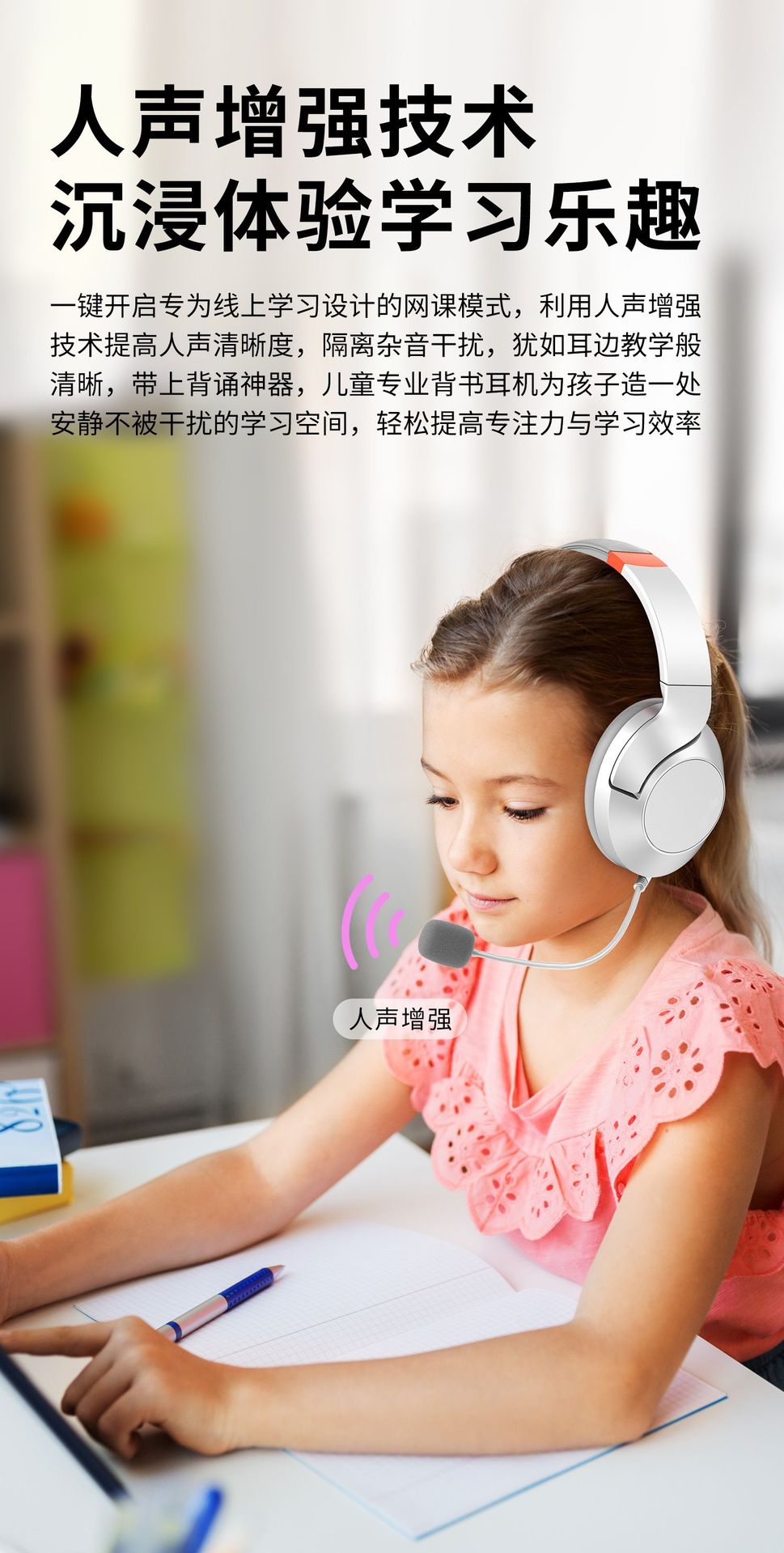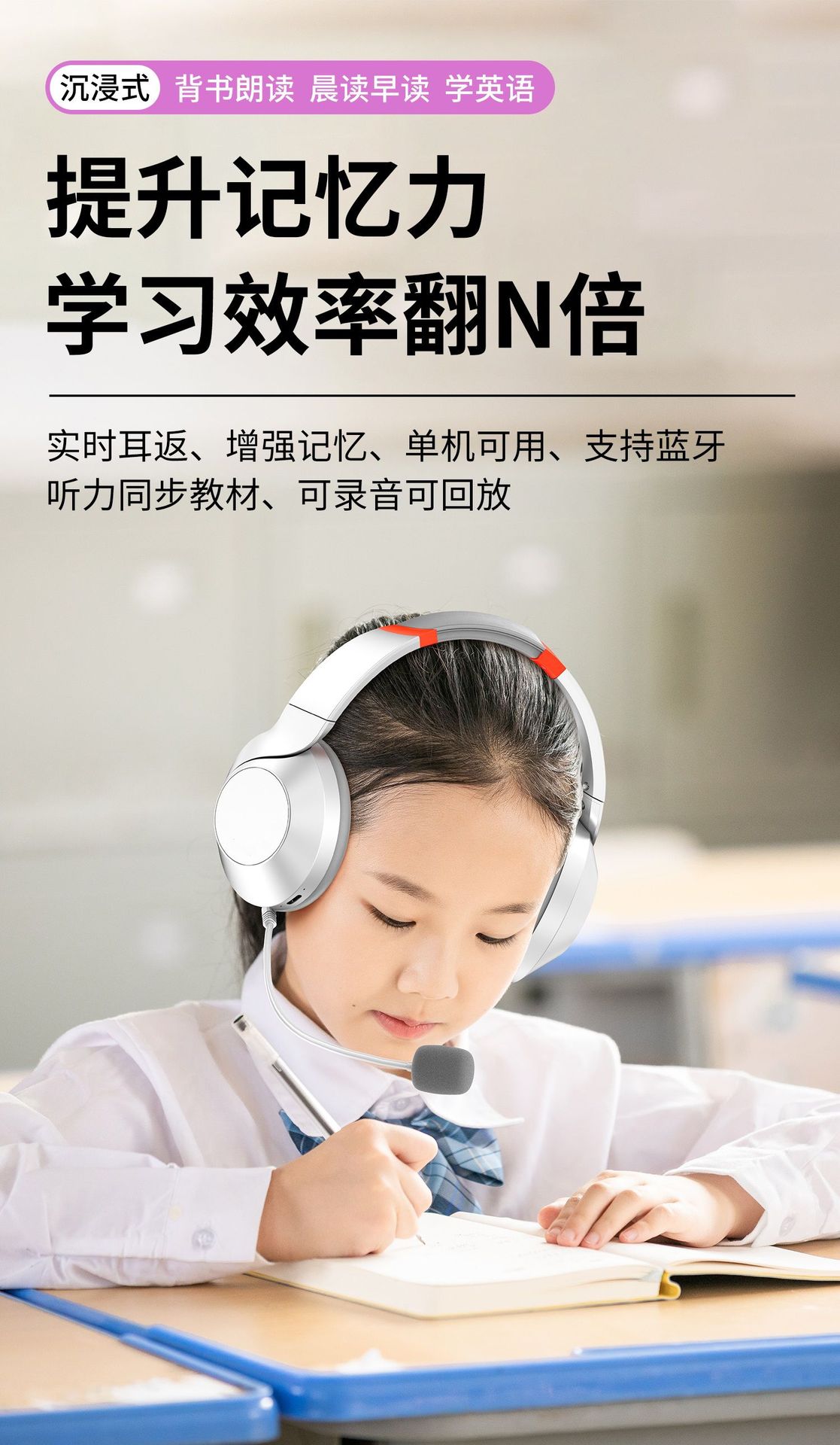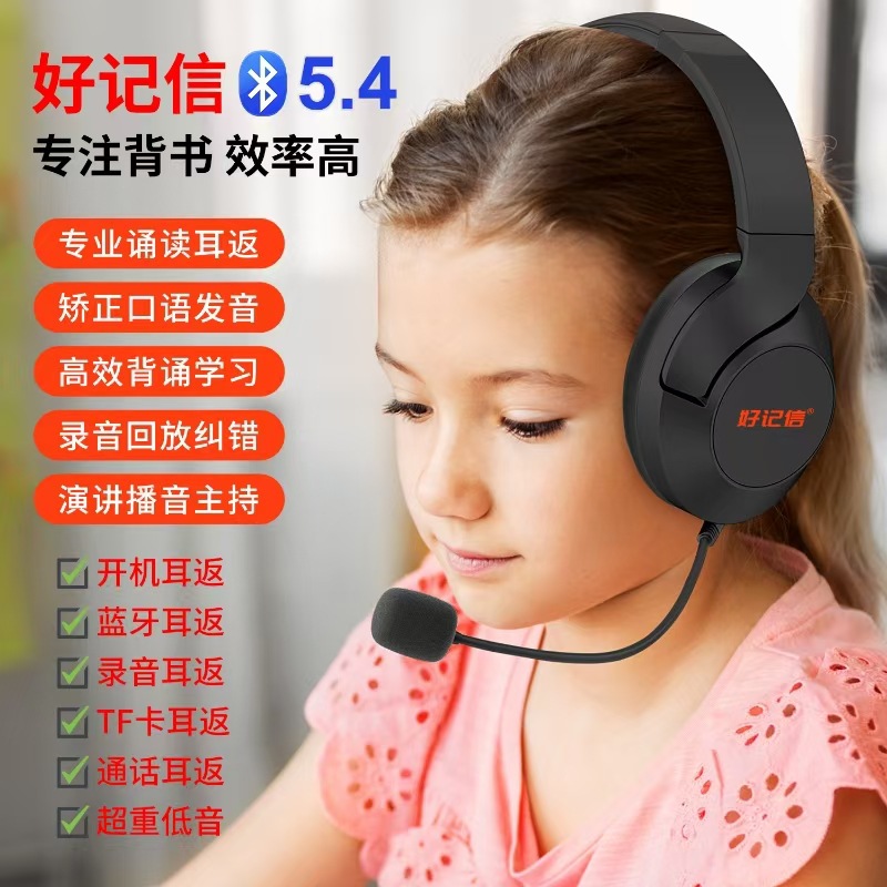 배움을 위한 액티브 노이즈 캔슬링(ANC) 기능이 있는 헤드셋 블루투스 이어폰, TF 녹음, 몰입형 암송 도구, 어린이용