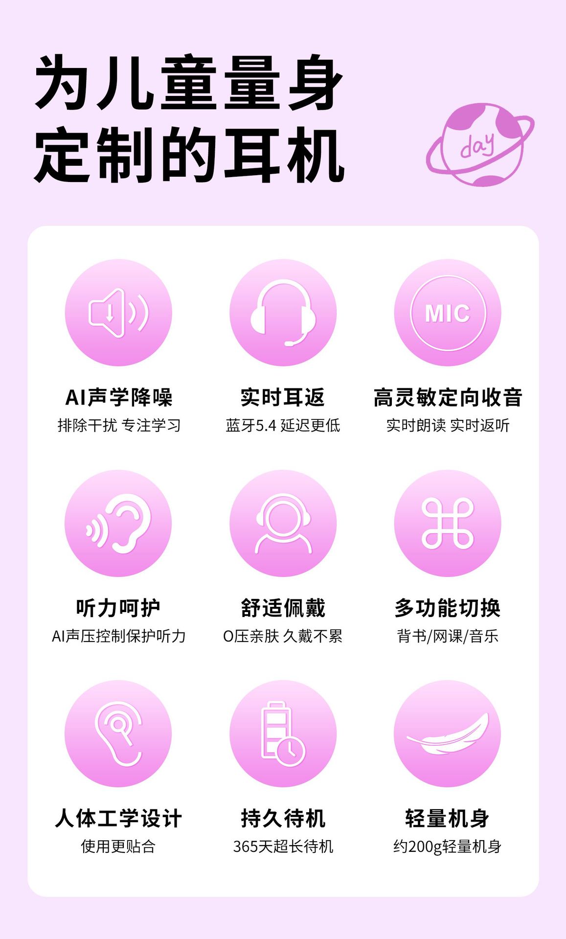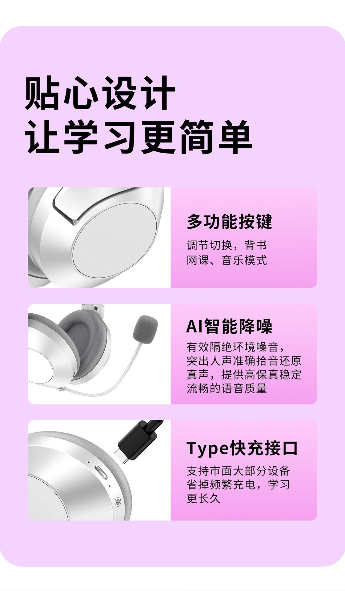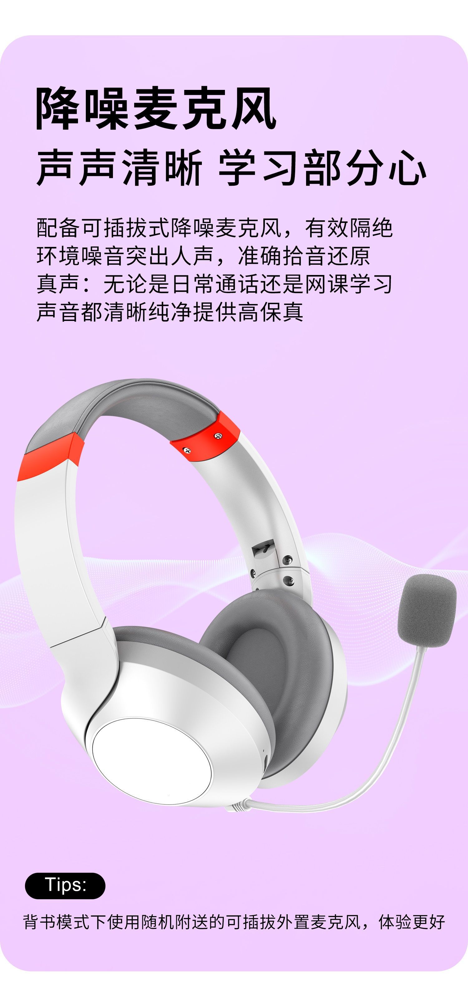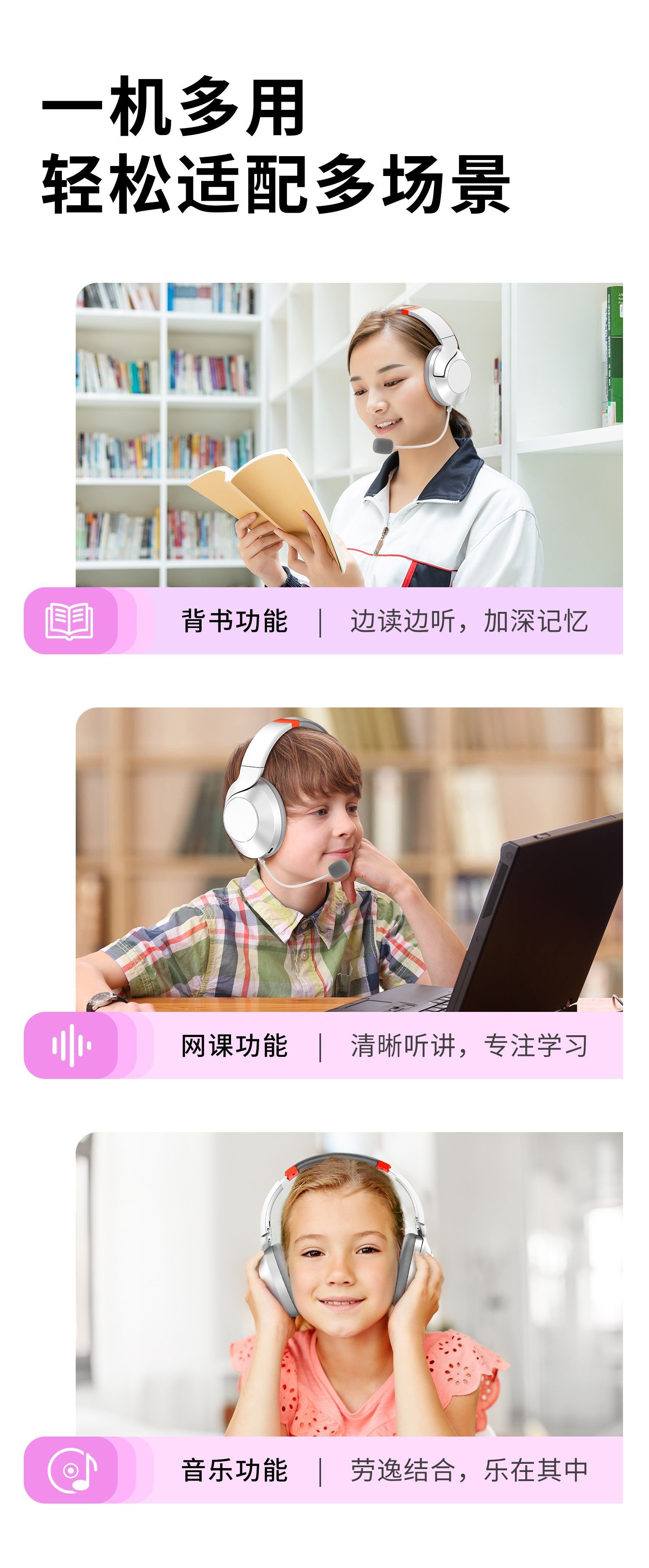 배움을 위한 액티브 노이즈 캔슬링(ANC) 기능이 있는 헤드셋 블루투스 이어폰, TF 녹음, 몰입형 암송 도구, 어린이용
