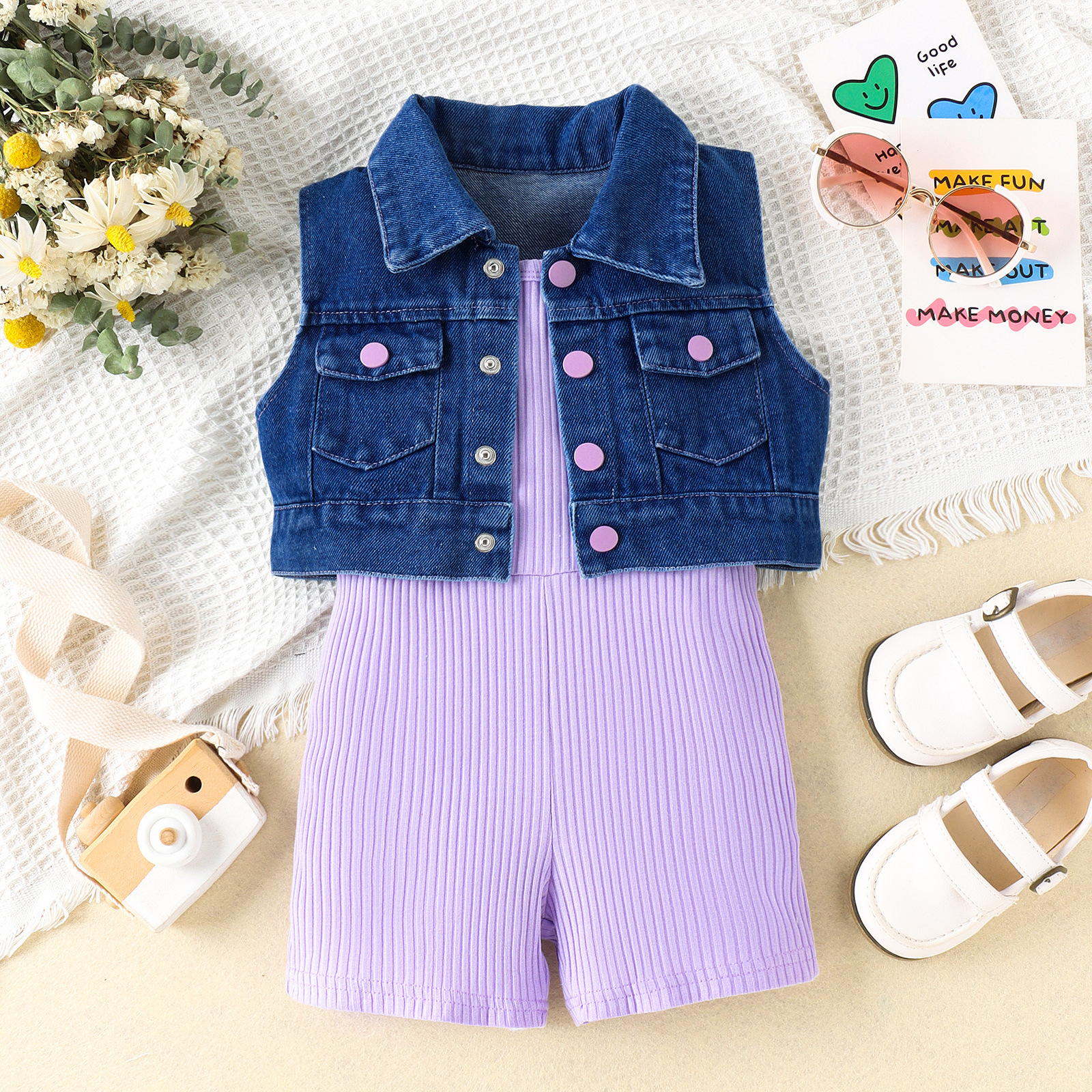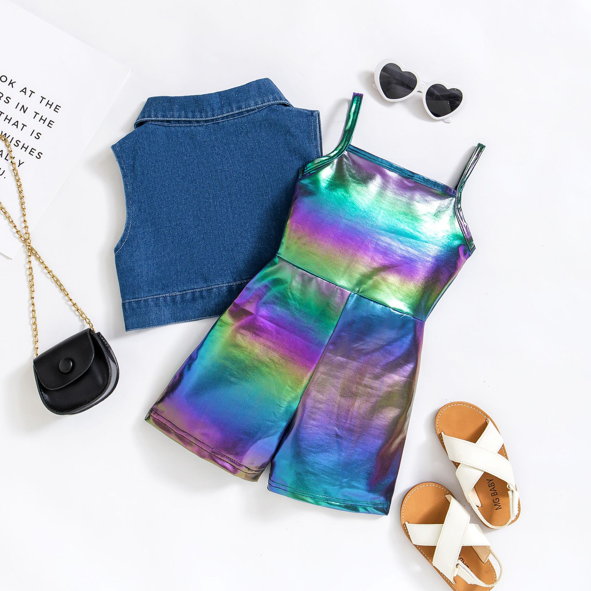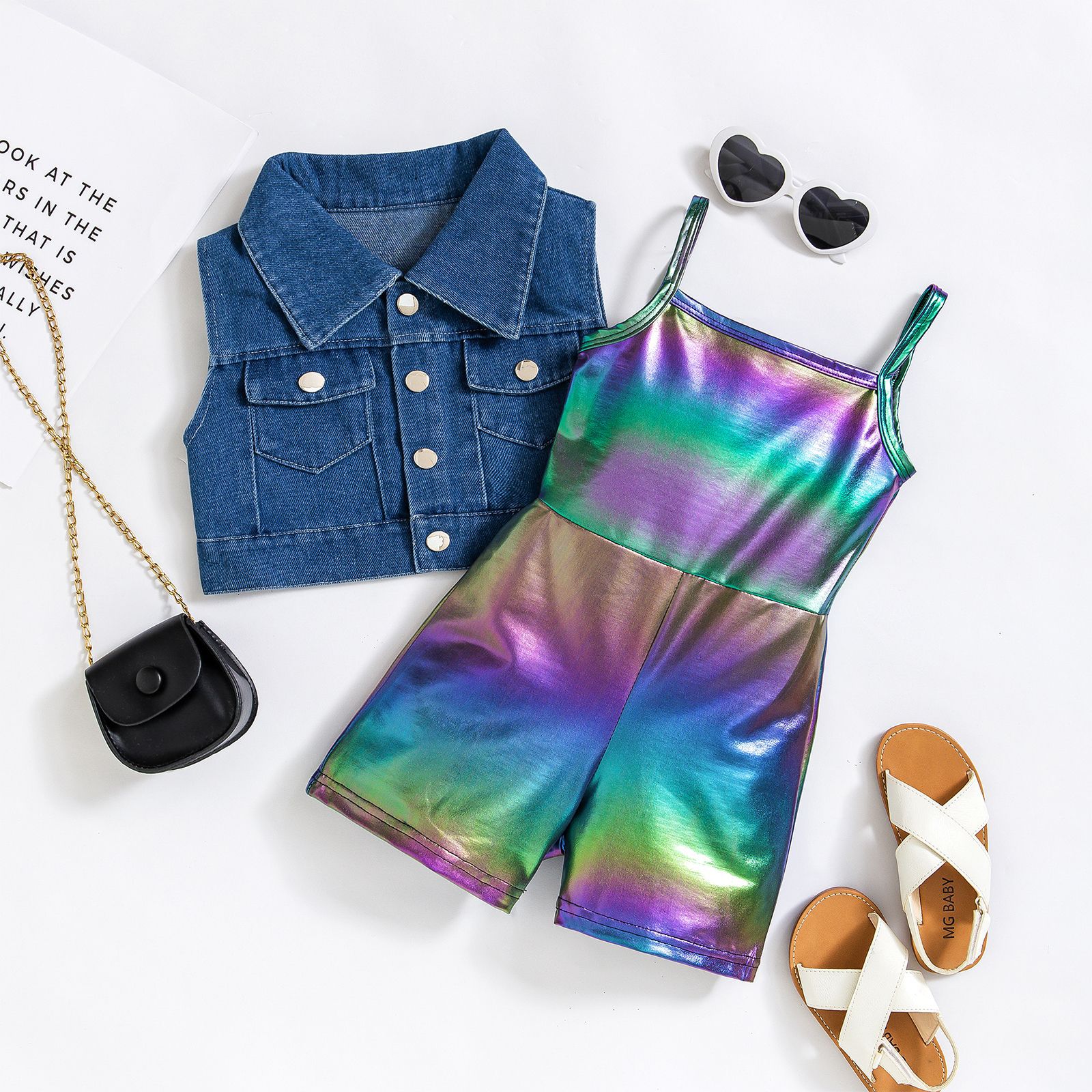 바옥신 아동복 국경 유럽 및 미국 패션 여름 중소 소녀 솔리드 컬러 핏 스트립 점프 수트 데님 조끼 세트