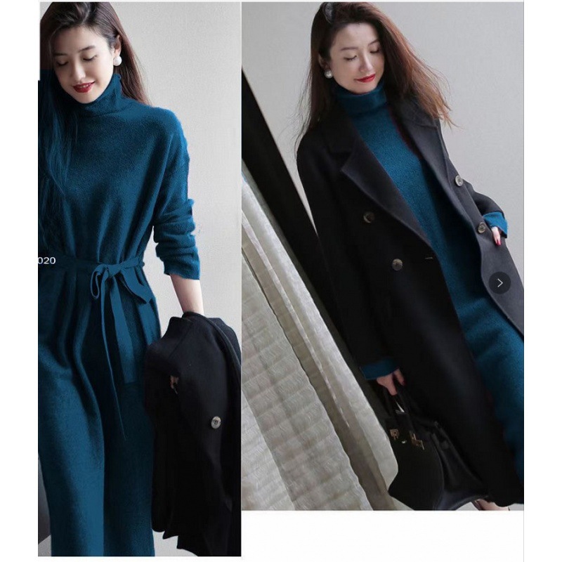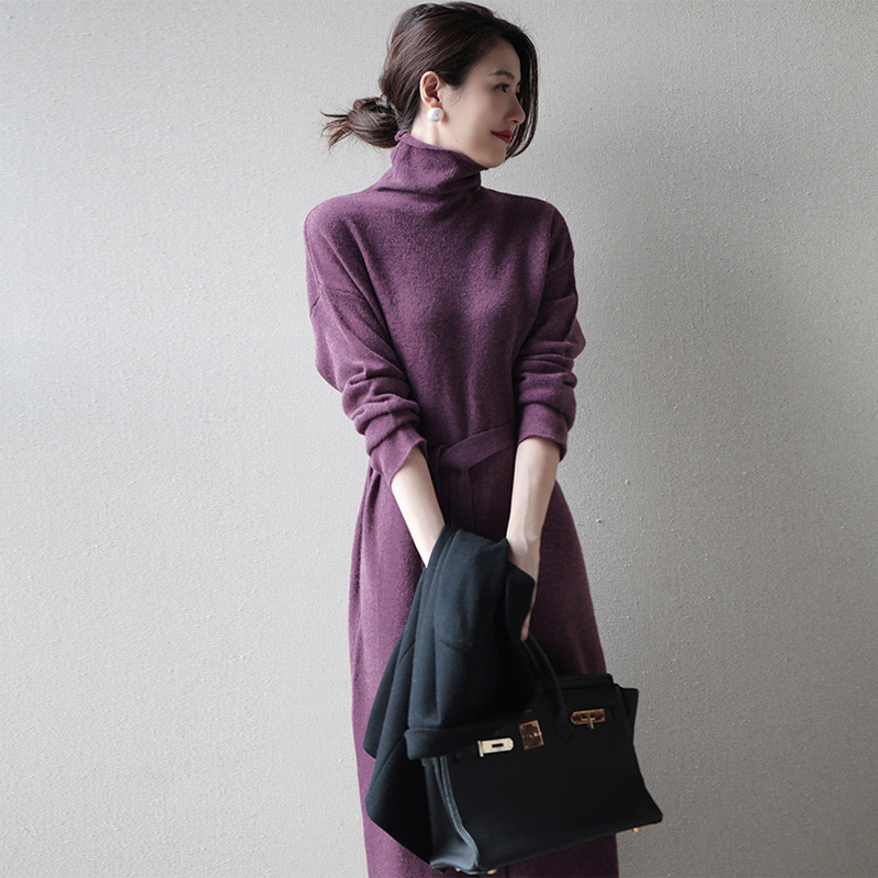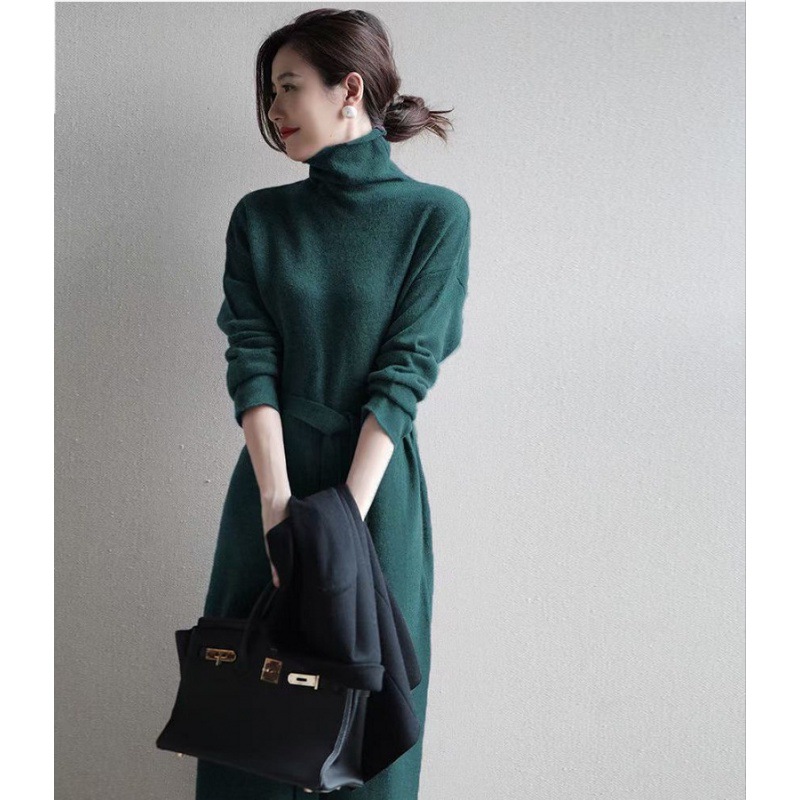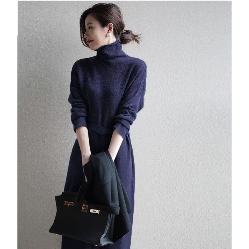 韩版纯色高领连衣裙女2021秋冬新款气质百搭系带中长款针织毛衣裙